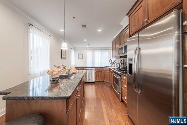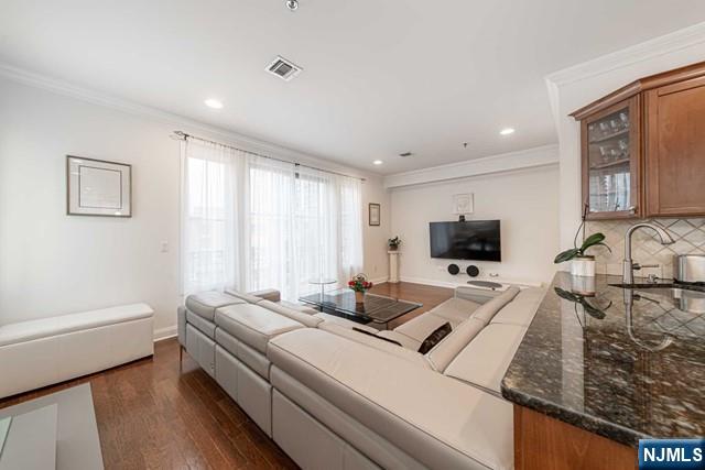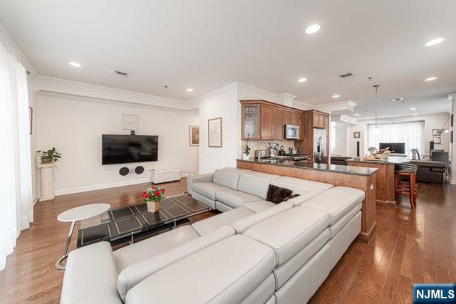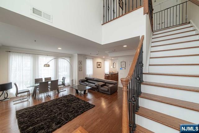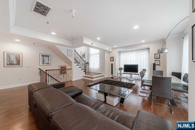 Welcome to your light-filled open concept end unit townhome in a prime location. Upon entry, you are greeted by the spacious living area with floor-to-ceiling windows. This open-concept space is rich in natural light and in-turn, very inviting. The living space is inclusive of the center-island kitchen, complete with granite countertops. Off of the kitchen is an intimate family room and balcony. The quality of construction is readily apparent in the grand ceiling height, detailed crown moldings, and gleaming hardwood flooring throughout the home. Upstairs boasts three large bedrooms including the primary suite complete with travertine tile bath with dual tub and shower. A tandem garage is attached directly to the centrally heated/cooled home. Spectacular location just off Gorge Rd - walking distance to Edgewater's riverfront and its incredible shopping and restaurants. Steps to NJ Transit and 10 minute trip to NY Waterway Ferry with midtown or downtown commuting options.