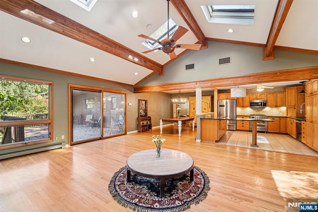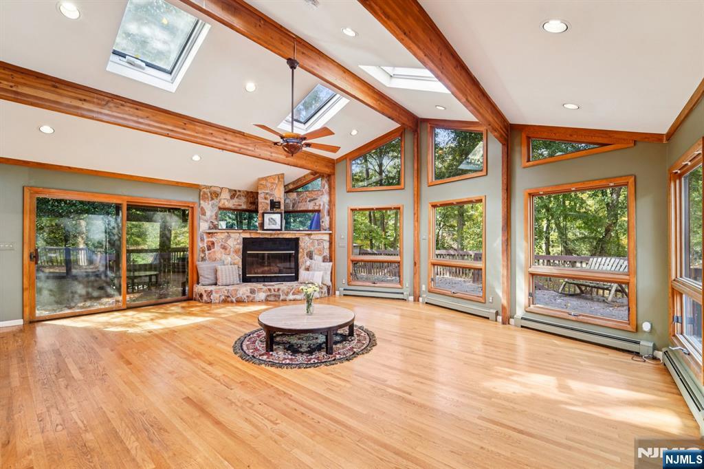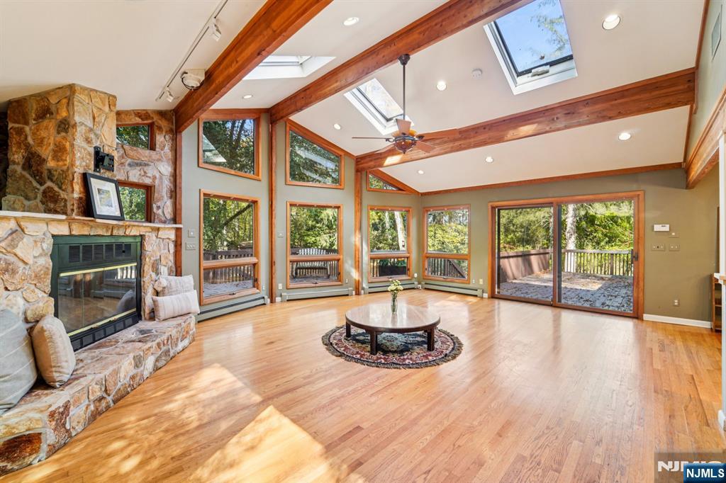 Experience easy, one floor living in this beautiful mid-century ranch style home set on over half an acre with calming views of a babbling brook. Designed for effortless single-level living, this 3-bedroom home blends rustic charm with a phenomenal mid-century, contemporary modern vibe. Sunlight pours through the floor-to-ceiling windows that frame lush natural views, creating an airy atmosphere of warmth and connection to the outdoors in all seasons. An inviting front porch welcomes you into a classic formal living room featuring a large bay window and vintage mantle surrounding a wood-burning fireplace. At the heart of the home is the dramatic open concept great room – complete with vaulted ceilings, a 2nd fireplace (gas) set in stone, 4 skylights, and 3 walls of windows – which flows seamlessly into the open kitchen and dining room, truly creating the “WOW†factor of indoor-outdoor living. A spectacular setting for entertaining, 2 sets of oversized sliders off the great room and kitchen area connect to an expansive wraparound deck with panoramic views overlooking the private yard and winding brook. At the other end of this sun-drenched ranch, you will find 2 generous bedrooms, full bath, and primary suite with powder room/full bath connection. Hardwood floors throughout. The lower level offers great storage space, a flexible rec area for casual hanging out, powder room, laundry room, and direct access to 2-car garage. Fabulous location close to downtown shops and r