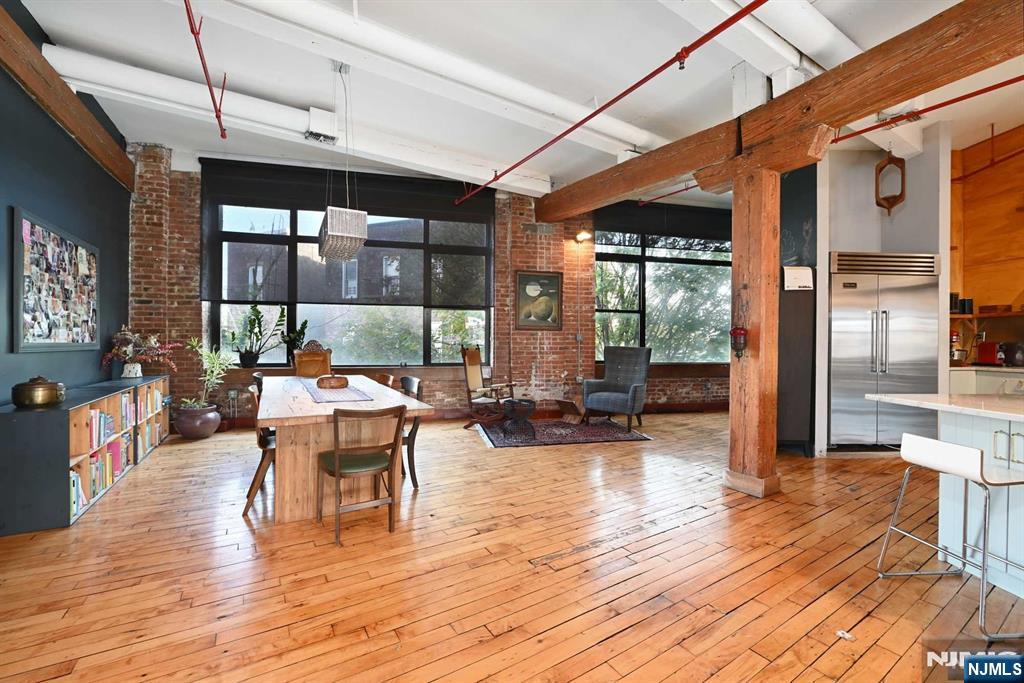 Rare and fabulous true loft living along the Palisades with one car deeded parking. This incredible 4220 square foot home boasts original hardwood floors, soaring 13 ft ceilings, exposed brick and beams and preserved industrial elements. Enter the unit through a keyed elevator and onto an expansive open floor plan bathed in light with large east and west facing windows, and winter views of NYC. With a Viking refrigerator, Thermador stove, granite countertops, large island and plenty of storage, cooking and entertaining are a dream. Currently used as a four bedroom with two full baths and two additional rooms for office/ gym and children's play space, the existing layout offers many configurations. An oversized pantry plus closets throughout provide a place for everything. Excellent access to the bus and tunnel makes commuting a breeze. Great walkable neighborhood just minutes from the Union City Reservoir Walk and bordering on Hoboken, and Jersey City for easy enjoyment of these communities as well.