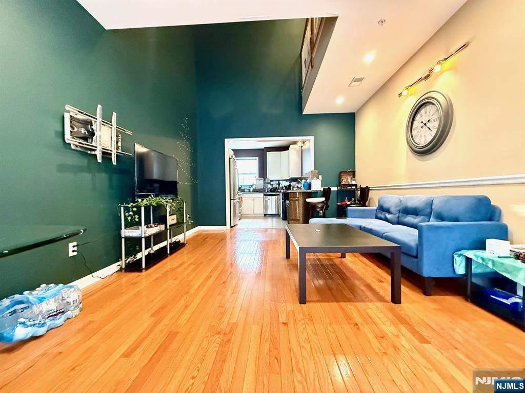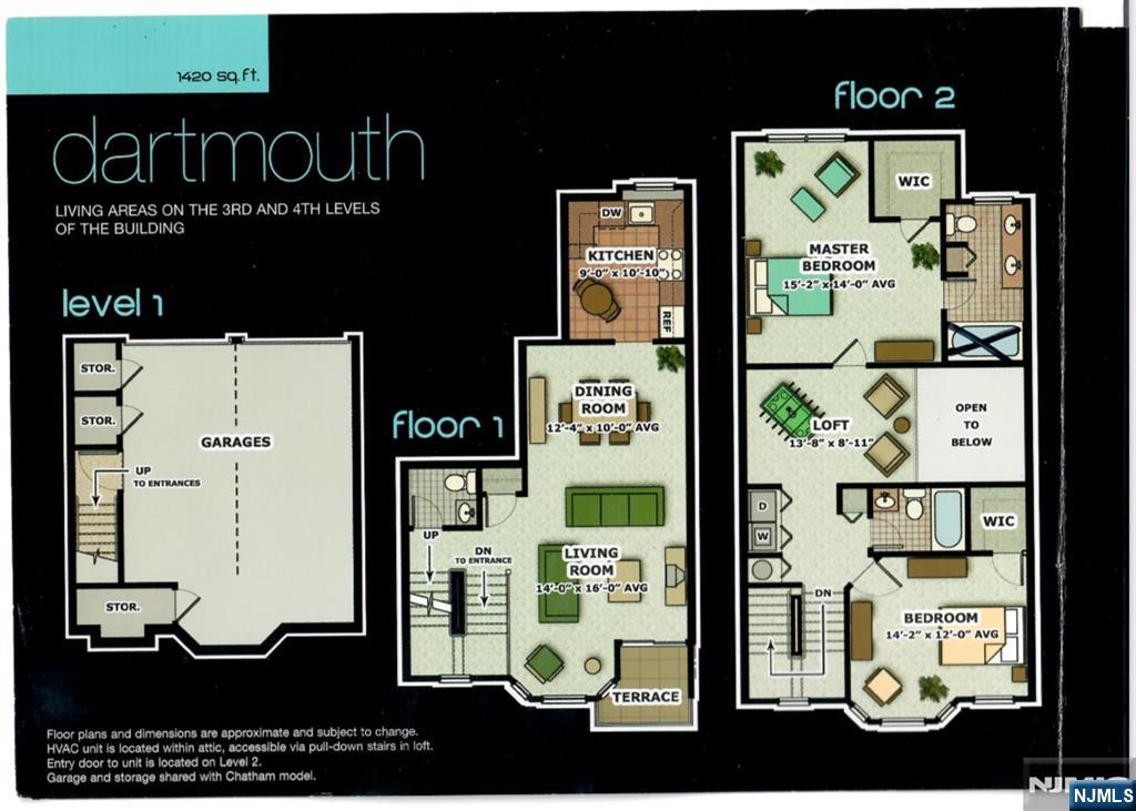 Elegantly upgraded Dartmouth unit 1420 SF with partial river views. Gorgeous hardwood floors throughout. Custom kitchen with white cabinets, extended black granite countertops and stainless steel appliances include Refrigerator, Gas range, Over-the-range Microwave, Dishwasher & Beverage Cooler. 2 full baths have granite/marble walls, Kohler waterfall & body jets. All 3 baths have granite/marble vanity tops, custom mirrors & lighting. Both bedrooms have walk-in California Closets w drawers, tie & belt racks. LR: 14'x16', DR: 10'X12'4, Kitchen: 9'X10'10, BRS: 12'x14'2 & 15'2x14'. Loft: 13'8x8'11. 2-story high ceiling in dining room. 9' ceilings in other rooms on 1st level. Den with custom cabinets on loft. Pull-down ladder to attic for HVAC & storage. HVAC 4 yrs old. 2 assigned parking: Garage+Carport outside garage. Storage closet in garage. 12 minute walk to Path. Near Rt. 280, Rt. 21, Turnpike, Parkway, NJPAC, Prudential Center, Red Bull, NJIT, Rutgers. Convenient to shopping, dining, parks & schools. Buyer to pay $250 move-in fee & $200 moving deposit required. Balconies in entire community cannot be opened or used. Access to gym/clubhouse/pool will be included through 10/20/2026. Buyer can renew the membership afterwards. Use of shuttle bus to Path Station can be paid during open enrollment every November. Monthly HOA fee: $487.60 includes Flood Insurance. One domestic pet under 40 pounds is allowed. Offers need to be preapproved by a portfolio lender.