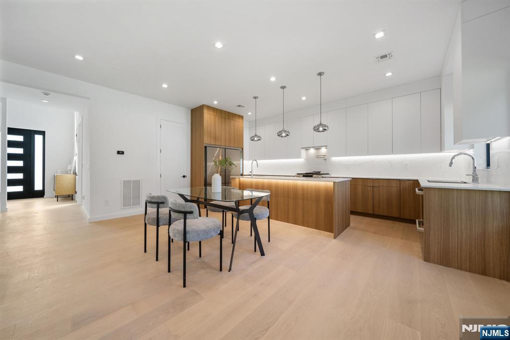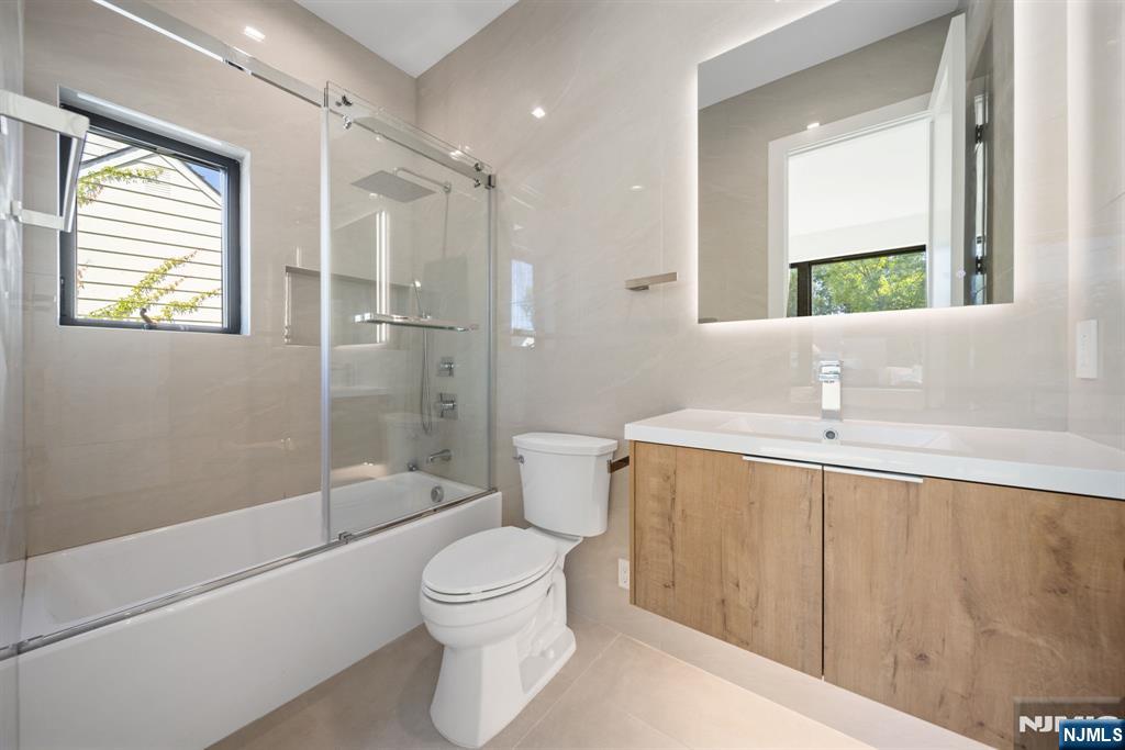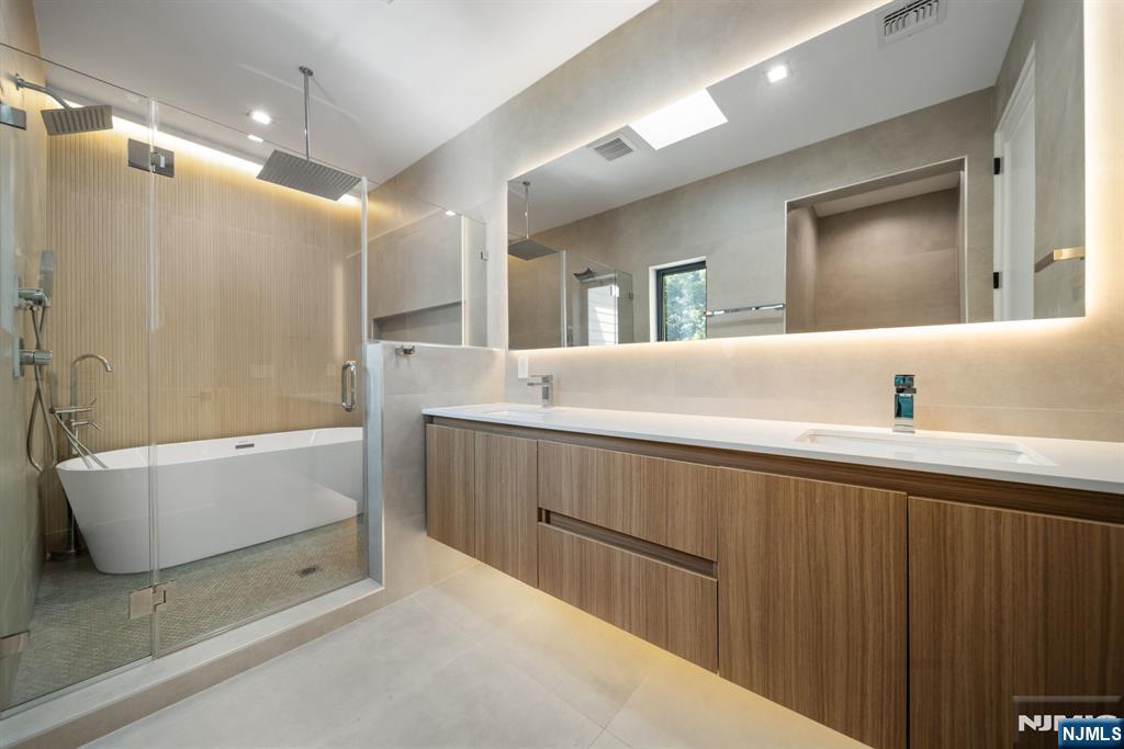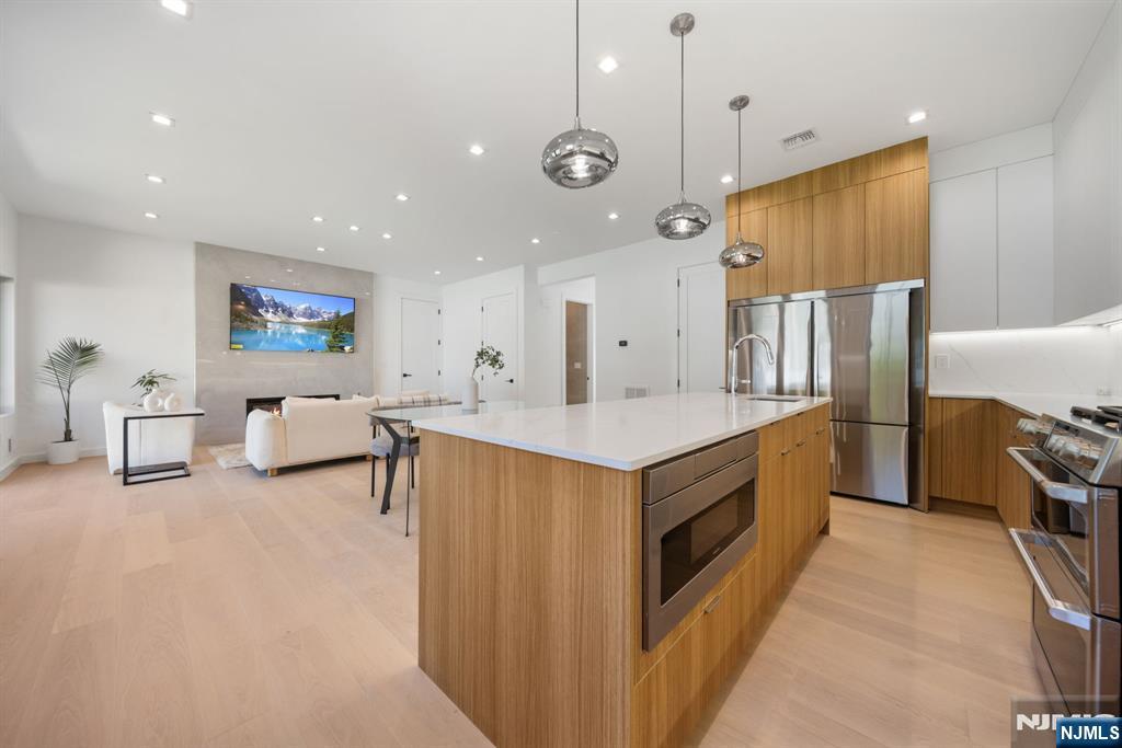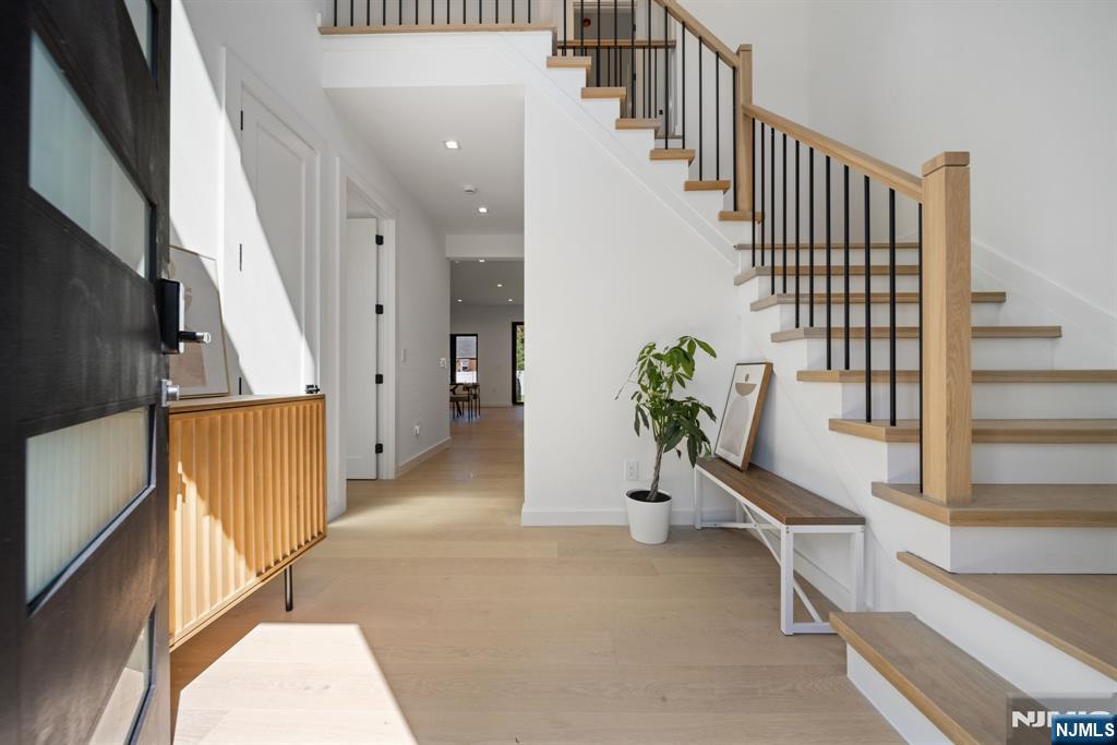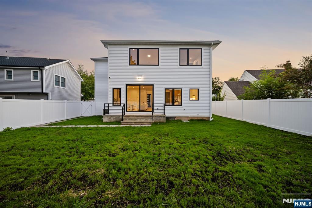Experience the perfect blend of modern elegance and thoughtful design in this brand-new construction, built on an existing foundation. This home offers 5 beds, 5.5 baths, and a 1-car garage, highlighted by 7.5" white oak floors, a 2-story entry foyer with 9' ceilings, and modern rod iron staircase. The first floor features an open dining and living area with electric fireplace and custom TV wall, a bedroom with en suite bath, powder room, and customized closets. The chef’s kitchen is a true centerpiece with quartz countertops and backsplash, island with microwave drawer, and premium Fisher & Paykel + GE Cafe appliances. Upstairs, enjoy 4 beds and 3 baths, including a luxurious primary suite with spa-inspired bath featuring a free-standing tub and custom walk-in closet. A convenient laundry room with washer, dryer, and sink completes the second level. The finished basement offers a spacious family room and full bath with frameless glass shower. Bathrooms throughout include porcelain tile, frameless glass doors, and Kohler fixtures. Exterior highlights include a paver driveway with Belgian block edging, stepping stone walkway, fenced yard, multi-zone sprinkler system, and high-end entry door with accent lighting. Added comforts include a 75-gallon AO Smith water heater, 2-zone heating/cooling with smart thermostats, and surveillance cameras with TV monitor. Located in the heart of Fair Lawn, this home is the definition of modern luxury living!