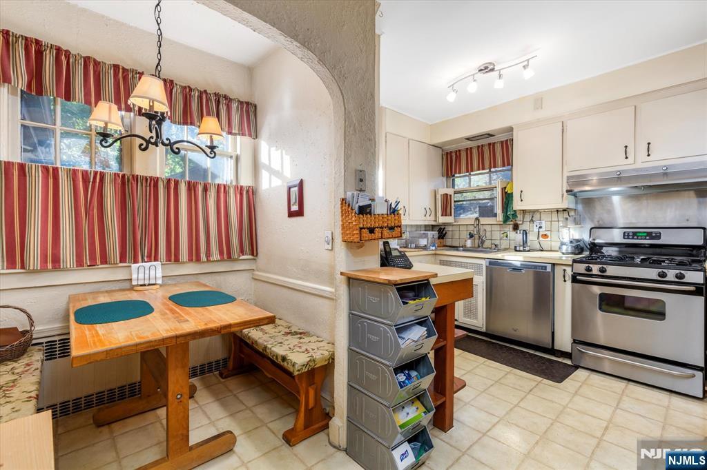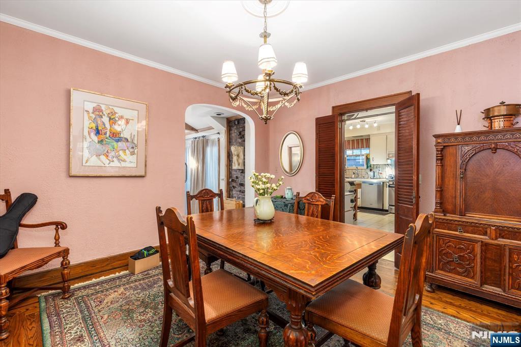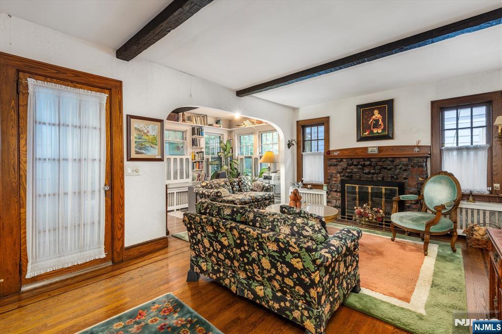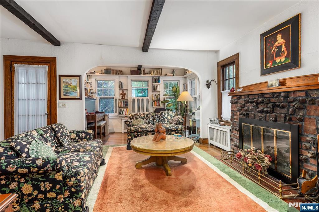 Charming half brick Tudor Colonial in choice location! Featuring a large living room with Chestnut trim on the windows ,huge brick fireplace ,beamed ceiling,library alcove and possibility of a small office, large formal dining room, dramatic family room,w/Franklin woodburning stove ,vaulted ceiling and sliding glass door to a small deck . There is a full bath with a stall shower adjacent to the family room. There are arched doorways throughout. The kitchen has a cozy breakfast nook, stainless steel appliances and a Spanish tile backsplash. There is a screened -in porch off the living room. The second floor has three large bedrooms and a hall bath. There is a very large room on the third floor that is a potential bedroom with access through a second floor hall staircase. The basement is large with several rooms. There is a two car garage ,a large backyard all a short distance to NYC bus transportaion,schools,stores,parks and houses of worship. The house has gas,hot water heat, newer roof(2020),new chimney liner,new driveway and exterior was painted in 2023.