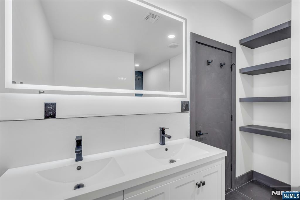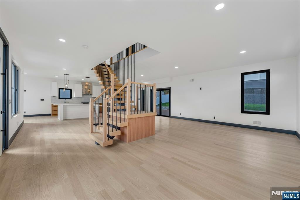 East-facing, newly constructed 4-bedroom, 3 full bath single-family over an existing foundation with a 1-car built-in garage. This open-concept colonial features a living room, dining room with French doors to the rear yard, a gourmet kitchen with stainless steel appliances, an island, quartz countertops, and a tiled backsplash, a pantry, and a half bathroom on the first floor. The 2nd floor has master bedrooms with a walk-in closet and a private full bath with a soaking tub, shower stall, and double vanity sinks, as well as a walk-out balcony with a NYC view! Also, 3 additional generously sized bedrooms, a full bath, and a laundry closet. Pull downstairs for additional storage in the attic. Fully finished basement with family room, full bathroom, utility closet, and access to 1 1-car built-in garage. Features include: Hardwood floors on 1st & 2nd level, tiled baths, LVT flooring in basement, European windows and exterior doors, all new plumbing, new 200 amp electric service, 2 gas forced hot air and central AC units, rough wiring for future cameras and high speed internet. Kitchen appliances include: Refrigerator with Ice maker, wine cooler, dishwasher, gas range, and built-in microwave. Fenced-in rear yard with a composite deck off the rear. 3 blocks to the NYC Bus Stop as well as the Bus to Hackensack/Newark.