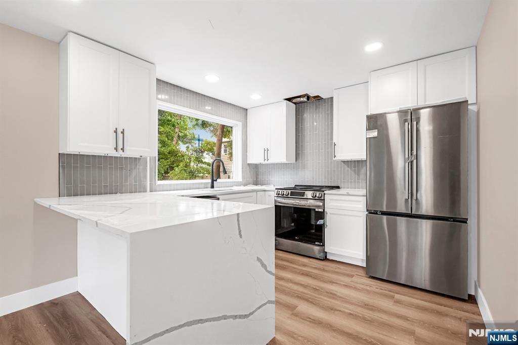 Remodeled colonial in Teaneck! Newly renovated, this 3 bedroom and 2 full baths home blends modern upgrades with timeless character. Highlights include all the following new: Pella windows, fresh paint, flooring, appliances, doors, bathroom tile and plumbing fixtures, A/C, lighting, and more. The bright, open-concept interior features an upgraded kitchen with stainless steel appliances and granite countertops, flowing into a dining area and living room with a Carrera porcelain fireplace. Completing the 1st floor is a convenient en-suite bedroom with walk-out access, perfect for a primary or in-law suite. Upstairs are 2 spacious bedrooms and a full hallway bathroom. A charming fenced side yard with a patio for outdoor entertaining and an attached garage adds to the appeal. Ideally located around the corner from public transportation, just 30-60 minutes to Manhattan, and close to restaurants and shopping, this turn-key home offers both comfort and convenience.