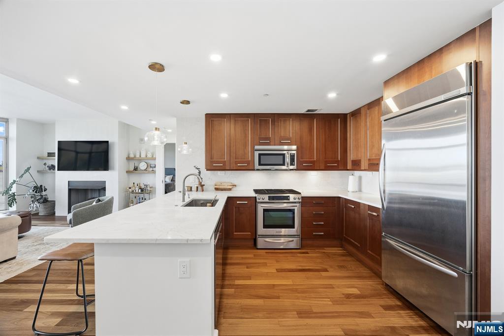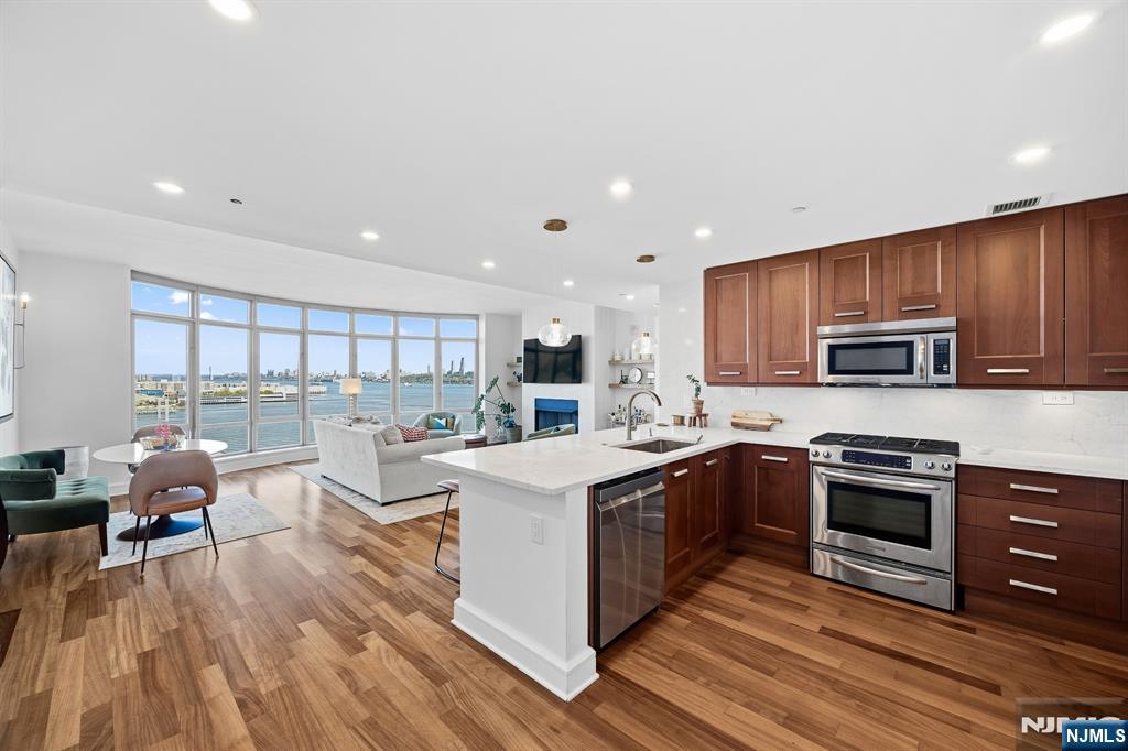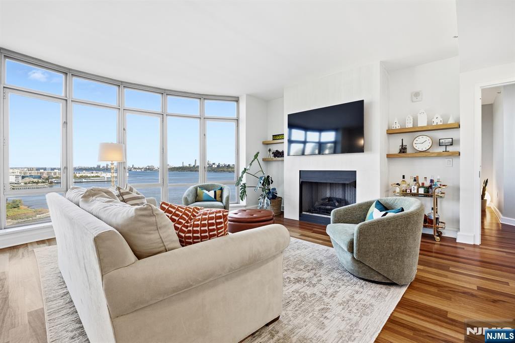 Experience luxury waterfront living at The Watermark on the Hudson in this spacious 2-bedroom, 2-bathroom condo featuring breathtaking Hudson River and New York City skyline views. This well-appointed residence offers an open layout with over 1,516 sq. ft., a fireplace, and a modern gourmet kitchen with high-end appliances. Creating a warm and inviting atmosphere ideal for relaxing or entertaining. The primary suite includes ample closet space, a spa-style bath with dual sinks, and a soaking tub. Residents enjoy resort-style amenities including an indoor and outdoor pool, sauna, movie theater, health club, guest suites, children's playroom, indoor golf simulator, and full valet service. Rent includes water, gas, two parking spaces, and access to all amenities. Available furnished or unfurnished. Conveniently located minutes from Manhattan by car, ferry, or bus, The Watermark offers comfort, style, and convenience on the Gold Coast.