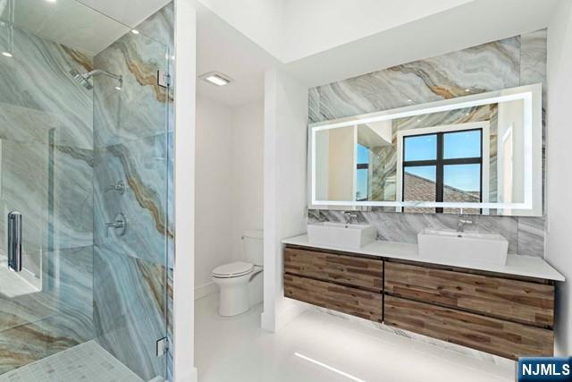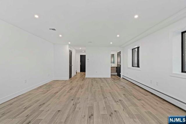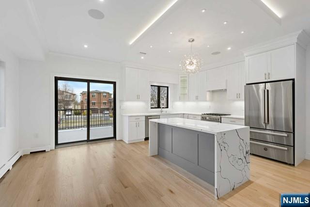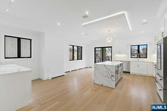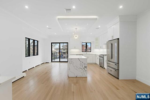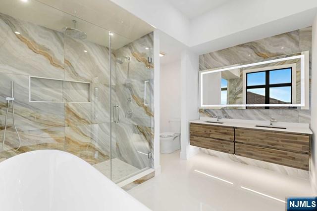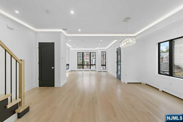 2022" New contemporary Townhome"" Featuring open floor plan on the main level with 9ft high ceiling ...Living room with linear Gas Fireplace and built-in. Dining room, Modern eat-in kitchen with an oversized Island, and quartz countertops. High-end appliances (Italian brand)and a sliding glass door to the patio. The custom trim work highlighted by the LED Cove lighting gives this house a luxury feel. 2nd-floor hallway with w/skylight !! Master bedroom with walking closets. ..MASTER BATH "RADIANT HEATED FLOOR" w/free standing tub & shower & double vanity sink, 2 bedrooms,.. 2nd BATHROOM "RADIANT HEATED FLOOR ". Full & Finished walkout basement with recreation room, sliding glass door to patio, and W/Full bath, 1-car garage & driveway parking spaces. Very convenient location for NY trans & Elementary school #3 & H-Mart shopping mall, Restaurant.