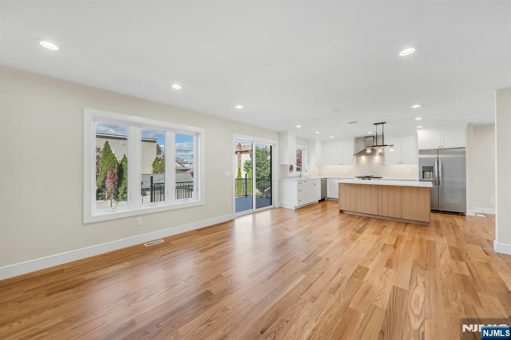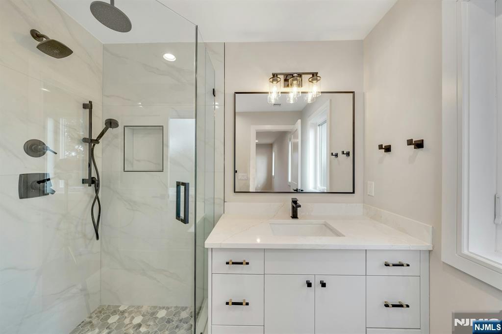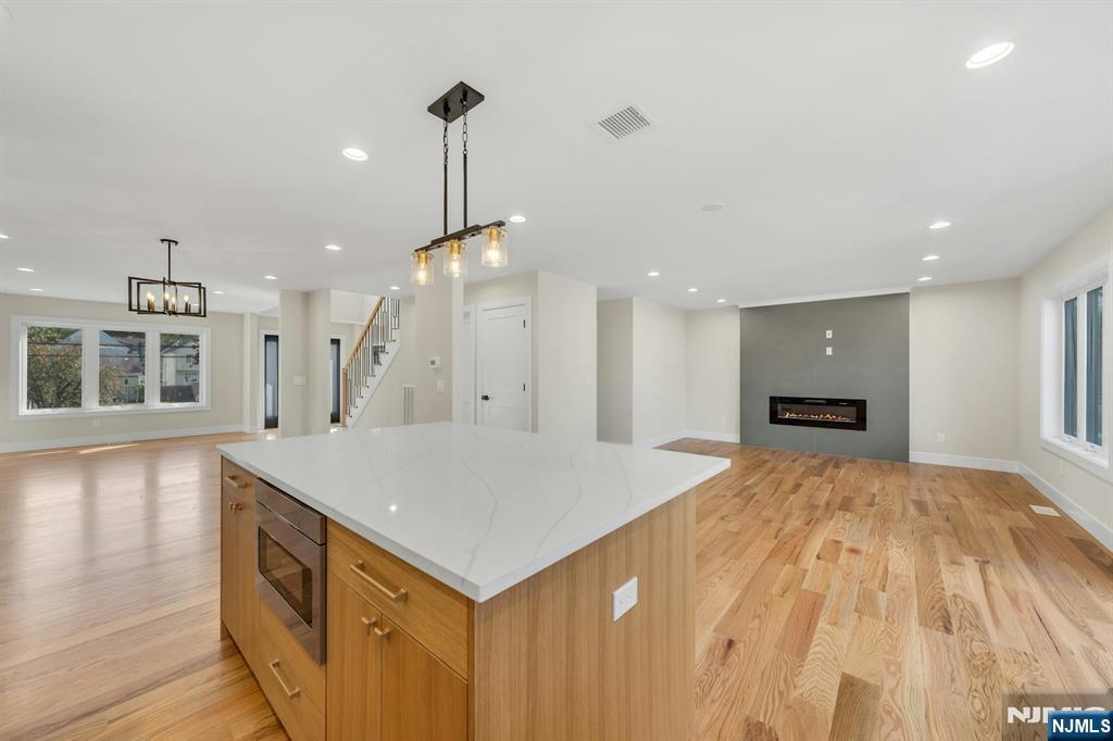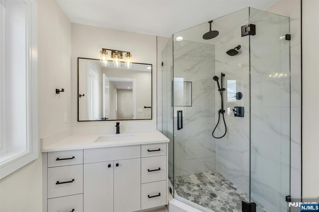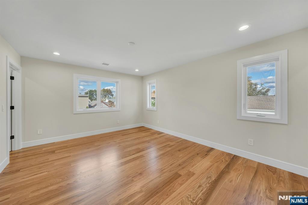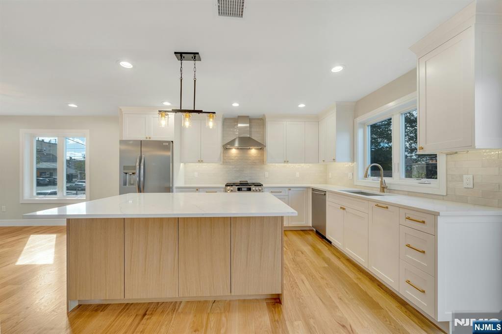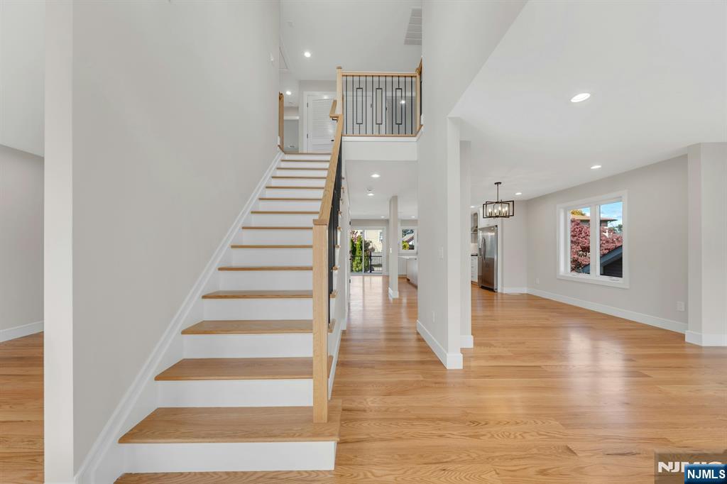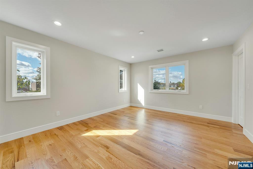Brand New East-facing 8-bedroom, 6 full bath 2 family duplex w/2 separate garages & driveways! This quality-built home measures approx 4,800 sq ft (plus an additional 2,000 sq ft on ground level) on a 75 x 113 lot! Each side has Living room, dining room, den, family room combined with an open concept kitchen with custom built cabinets, quartz tops with tiled backsplash, stainless steel appliances, which include stove, built-in microwave, dishwasher, and refrigerator with ice maker/water dispenser. The family room has a heated electric fireplace and sliders to 10' x 15' composite deck overlooking a deep yard. 2nd floor features 4 bedrooms, laundry closet with washer & dryer & 2 full baths. Master bedroom with 2 walk-in closets and private bathroom with shower stall. Pull down stairs to attic. 4 separate gas forced air heating & air conditioning systems ( units each side), 2 gas tankless water heaters, 2 electric, gas & water meters. Security camera system, hardwood floors on 1st & 2nd floor, 2nd floor pre-wired for house router. Ground level has access to a built in garage and walkout to rear yard. 150 amp electric panel. Each driveway can accommodate a few cars. Each side has private yard & landscaped property. Located in a flood zone, all finished areas are above the flood elevation line, and flood insurance is quoted at $1255 per year! 2 blocks to NJ Transit bus stop #160 to NYC Bus Terminal in less than 30 minutes on average! Includes a 10-year new home warranty!