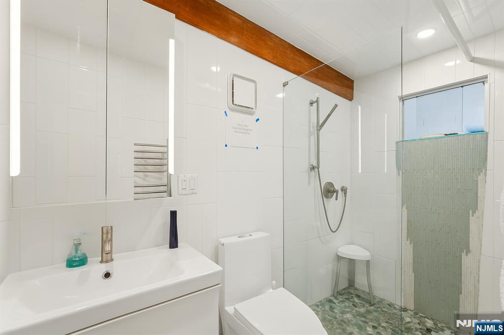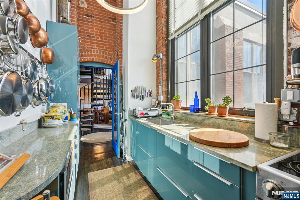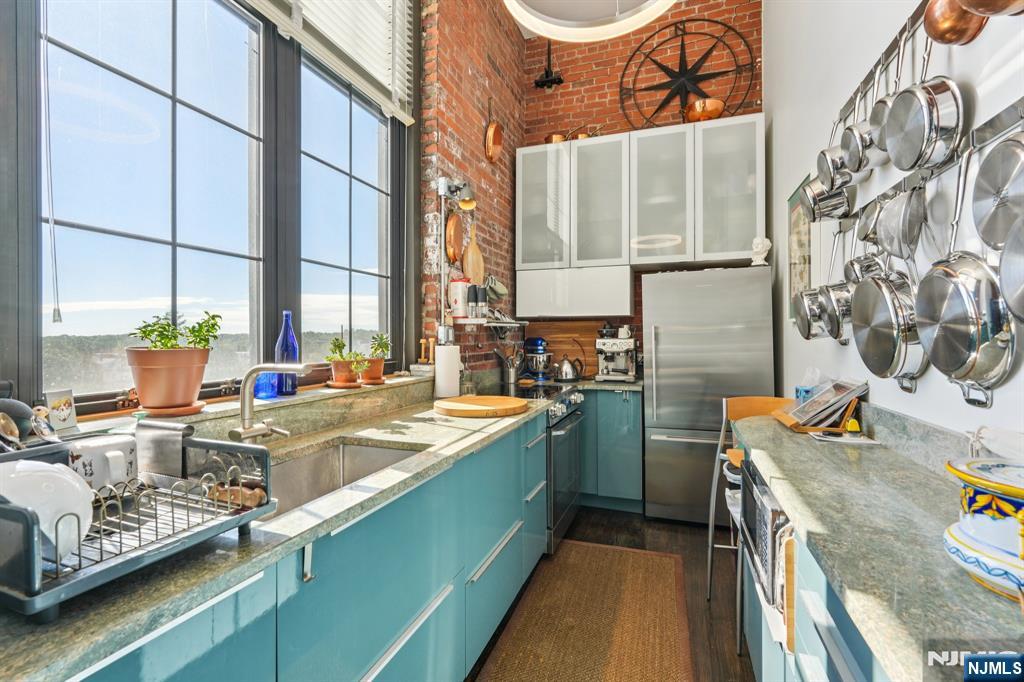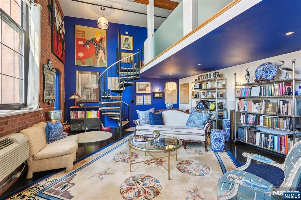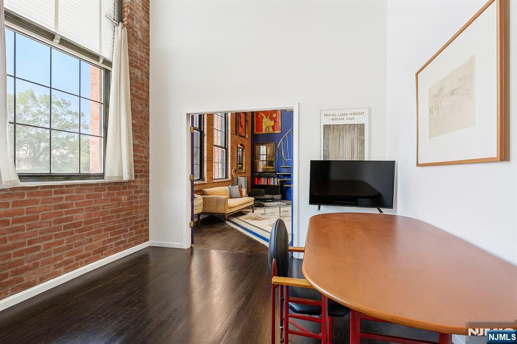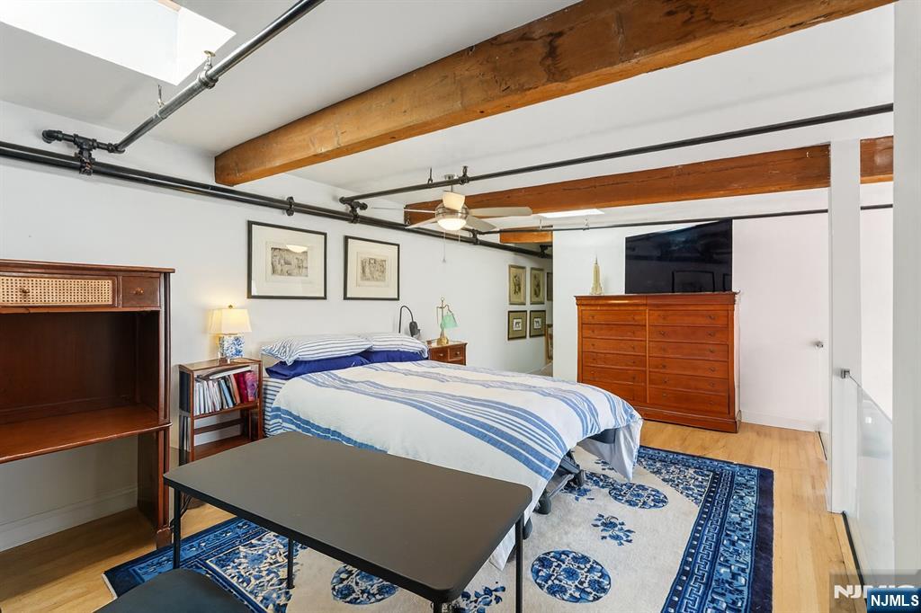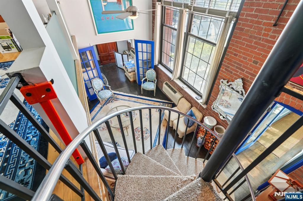 Welcome home to this distinctive 2-bedroom 2-bathroom 5th floor Condo located in the sought-after Loft Commons of Paterson's desirable Lakeview section. This exceptional community offers convenient amenities including an elevator, laundry, and private parking urban living made easy. Step into the inviting entry foyer that opens to a modern, elegant living space showcasing soaring 14' ceilings, exposed brick walls, striking wood beams, and expansive floor-to-ceiling windows that fill the home with natural light. The spacious living room offers a warm and comfortable atmosphere, perfect for relaxation or conversation. Seamlessly connected, the dining area provides the ideal setting for intimate dinners or lively gatherings. The galley kitchen boasts custom cabinetry, granite countertops, stainless steel appliances, and a breathtaking city view. French doors open to a first-floor bedroom currently used as an office, alongside a full bath equipped with a tub shower and vanity. Upstairs, the loft level reveals the serene primary suite complete with skylights, wood beam ceilings, a walk-in closet and a spa-inspired en suite bath featuring a glass-enclosed waterfall shower, radiant floors, and a heated towel bar. Perfectly situated near the Garden State Parkway, this location offers effortless commuting while embracing the vibrant energy of city living enjoy Paterson's diverse restaurants, cultural attractions, parks, and entertainment just moments from your door.