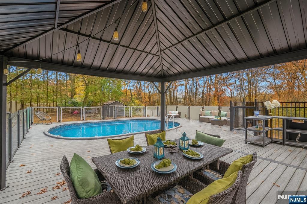 Beautiful 4 bedroom 3.5 bathroom classic Colonial tucked at the end of a quiet cul-de-sac in Hackensack, an incredibly rare setting offering a 17,500 sq ft lot with true privacy, peace, and tranquility. This stately home features approximately 2,500 sq ft across the first and second floors, plus a fully finished basement with a recreation room and an additional full bathroom. The main level offers a timeless layout with a spacious living room with fireplace, a large renovated eat-in kitchen, a versatile den/flex space, and a powder room. Upstairs you’ll find four generously sized bedrooms and two full bathrooms, including a large primary suite with its own sitting area and an en-suite bath featuring a wet room with jacuzzi tub. All bedrooms offer excellent closet space and comfortable proportions. The backyard is an entertainer’s dream, complete with a Trex deck wrapped around the pool, plus a wide, flat grassy area perfect for play and relaxation. Striking curb appeal includes a stylish black-and-white exterior, circular driveway, and attached garage.