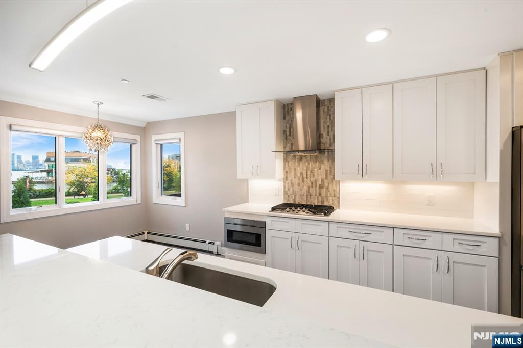 Roc Harbour! Includes 2-Car Garage + Free Guest Parking. Experience waterfront living at its finest in this beautifully rebuilt (2015) 2-bedroom, 2-bath townhouse-style condo at Roc Harbour on River Rd. 1,600 sq. ft. of thoughtfully designed space, this home has 2 private balconies w breathtaking Southeast views of the Manhattan skyline & Hudson River. Property Highlights Fully rebuilt from the studs in 2015 – “like new” condition New roofing & siding w Andersen glass doors & casement windows, central air conditioning, ADT security alarm system, Italian ceramic tiling in kitchen & bathrooms, Engineered 5” oak plank flooring in cocoa bean finish Solid wood interior doors, a Gourmet Kitchen Modern all-white Forevermark soft-close cabinetry GE Profile SS appliances Gas cooktop, separate oven, French-door refrigerator, & Sharp microwave drawer Quartz (anti-microbial) countertops w handmade subway tile backsplash, Living & Dining Open-concept living area w custom gas fireplace, Contemporary lighting fixtures + upgraded LED recessed lighting throughout Bdrms & Baths Primary suite w walk-in closet, elegant ensuite bath, & private balcony, Guest bedroom w ample sized closet, full guest bath, Samsung washer/dryer in dedicated laundry room. Additional Features Extra-large 2-car garage & storage room w direct access Gated community with no-charge guest parking, located near shopping, dining, & easy NYC commute by bus or ferry. Enjoy refined waterfront living w spectacular NYC vi