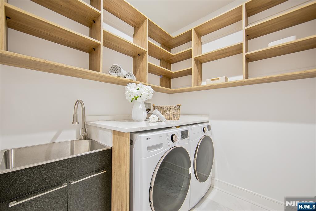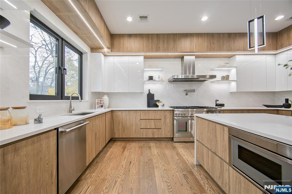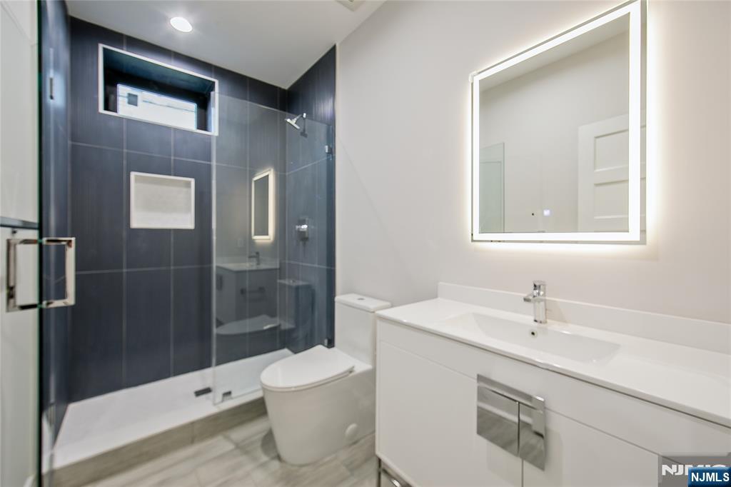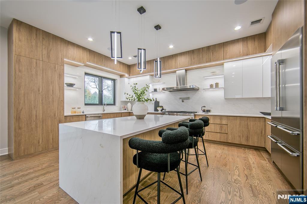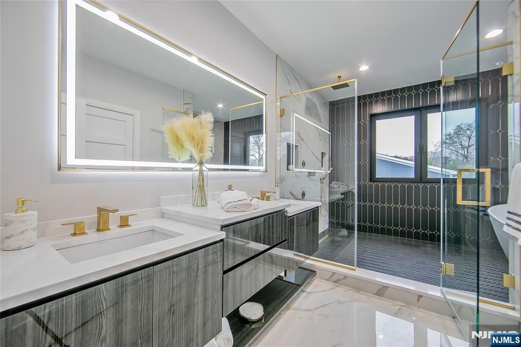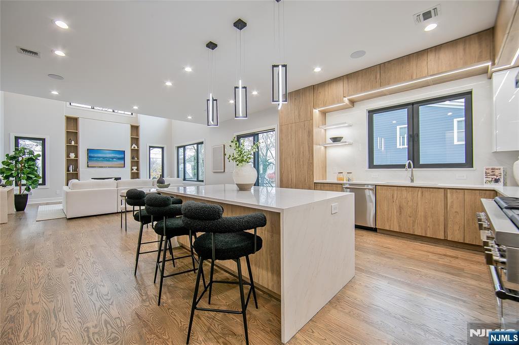 Welcome to 121 Circle Drive, a stunning new construction by Jet Engineering. Offering nearly 6,500 sq ft across 3 finished levels, this home blends modern luxury with thoughtful functionality. A dramatic two-story foyer leads to a seamless main floor with 10’ ceilings, formal DR with butler’s pantry, living room, and a breathtaking two-story great room w/ gas FP. The designer chef’s kitchen features quartz counters & backsplash, custom LED cabinetry, large island, pot filler, walk-in pantry, & Thermador appliances. A private office/optional 7th bedroom, full guest suite, & powder room complete this level. Upstairs offers 4 bedrooms: a junior suite, 2 bedrooms with Jack & Jill bath, and a serene primary suite with 2 walk-in closets and a spa bath with heated floors, rain shower, freestanding tub, & double vanity. The fully finished lower level includes a large rec room with wet bar, home-theater setup, guest bedroom, full bath, mudroom, & access to the 2-car garage. Exterior highlights include Hardie + New-Tech siding, paver driveway/patio, privacy fencing, and sprinklers. Additional features include a full exterior camera system and complete smart-home package with smart thermostats, doorbell, integrated speakers, and smart garage door. The home is generator-ready with an automatic transfer switch and electrical connection in place. With 7 bedrooms, 5.5 baths, 4-zone HVAC, advanced tech, & exceptional craftsmanship, 121 Circle Drive delivers true luxury living in Paramu