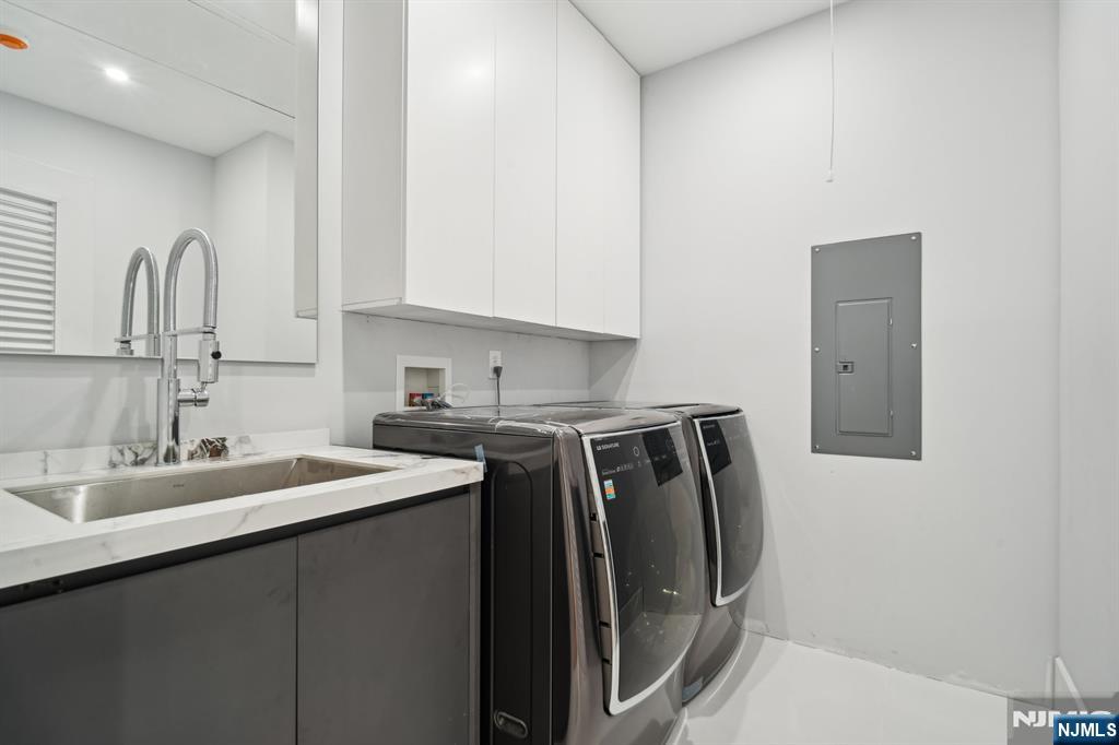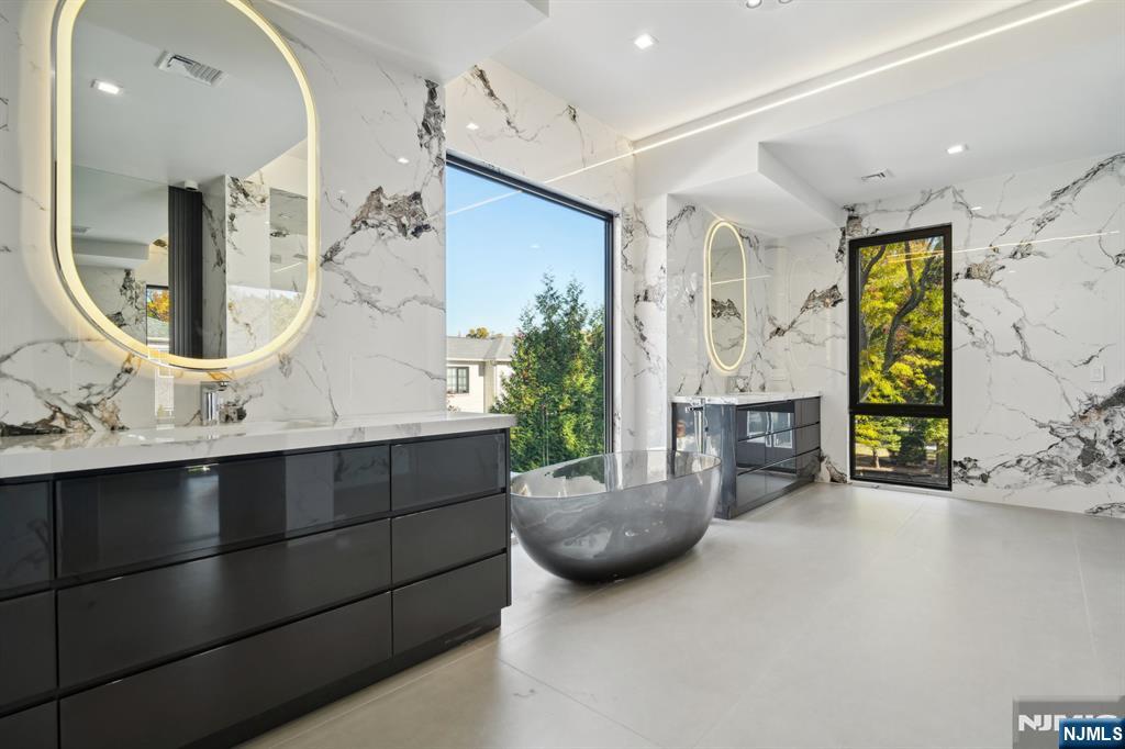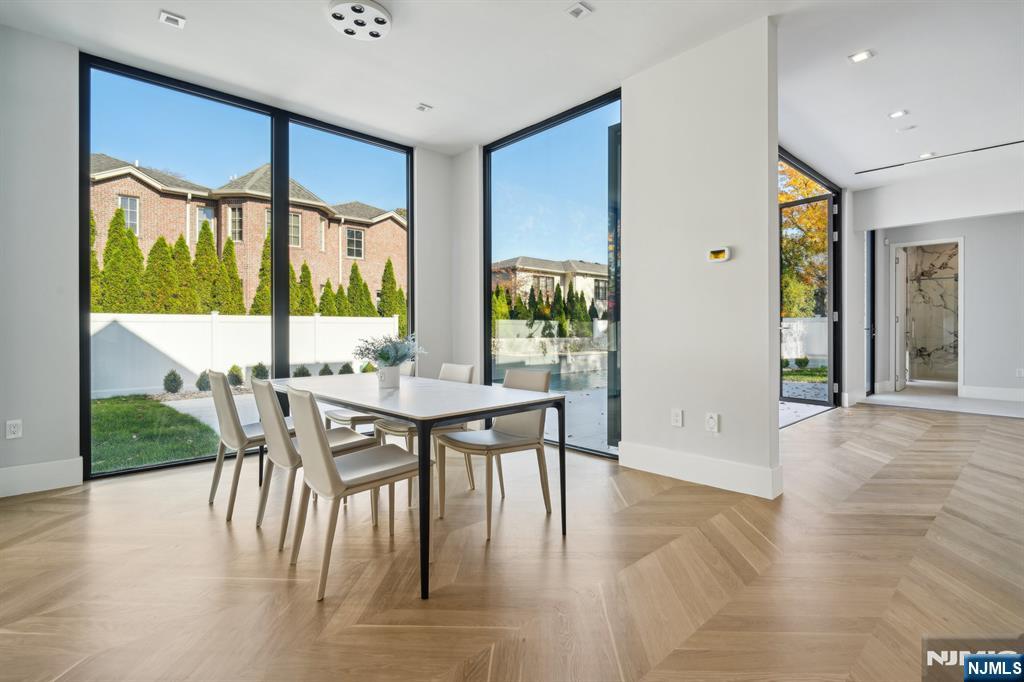 Step through the towering 10-foot black steel door and immerse yourself in this newly constructed smart home, where modern elegance meets creative design in Englewood Cliffs, NJ. Every detail of this home has been thoughtfully curated to showcase a blend of contemporary architecture and artistic flair. The open floor plan flows seamlessly, highlighted by blonde herringbone hardwood floors, custom floor-to-ceiling built-ins, and oversized windows that bathe the home in natural light. A 12-foot folding glass door from the gourmet kitchen opens to a tranquil patio and pool, bringing the outdoors in. Two main suites, each with sitting rooms, complement four additional bedrooms, while the home boasts 6 1/2 baths, a theater, elevator, and two fireplaces one an impressive 100-inch wide statement piece. Specialty granite throughout adds a touch of elegance to this one-of-a-kind home designed for luxury living.