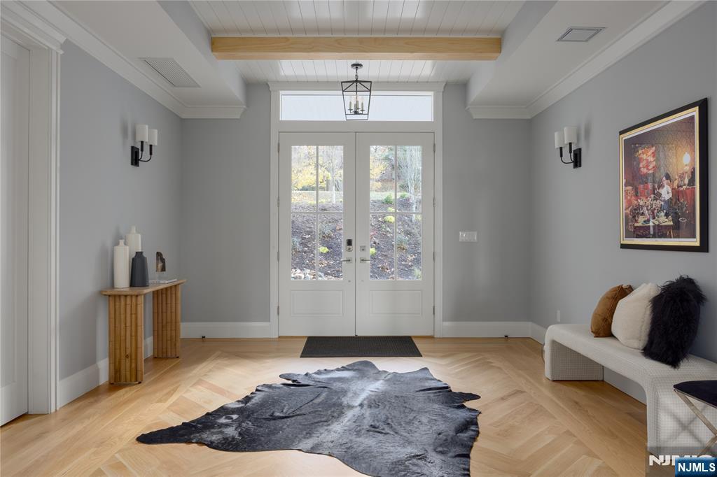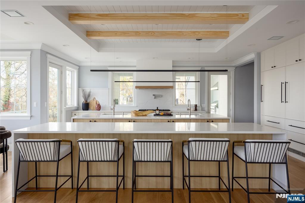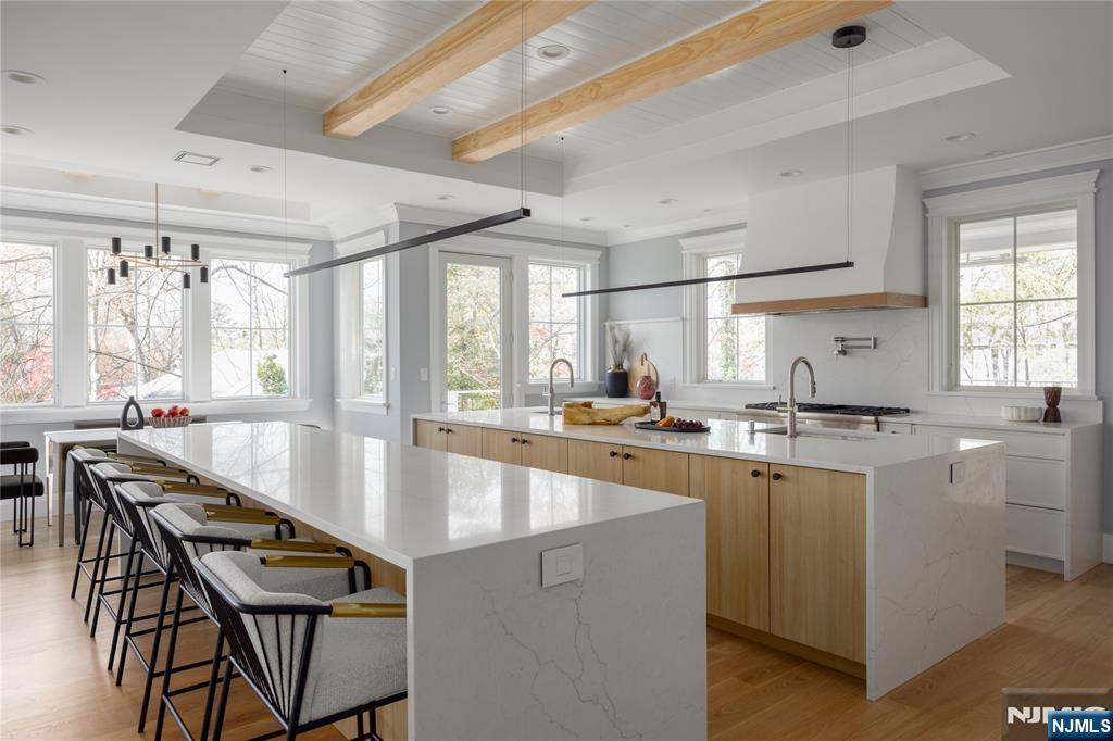 Exceptional new construction mins from NYC, offering approx. 9,600 sq ft of masterfully designed living space across 3 finished levels. Thoughtfully built to balance everyday function w/ luxury living, this home features cathedral ceilings, exposed beams, custom millwork & wide-plank white oak floors throughout. The main level centers around a light-filled open floor plan anchored by a dramatic great room w/ fireplace & 7-ft windows w/ transoms. The dream kosher kitchen stuns w/ dual 12-ft quartz islands, double sinks, double ovens, two integrated refrigerators & a custom walk-in pantry. The adjacent dining area is elevated by a showstopper wet bar. A covered outdoor living room w/ built-in kitchen, fireplace & heaters offers year-round comfort. A private en suite bedroom, formal office & a mudroom complete the main level. The second level features 5 en suite bedrooms, including a palatial primary suite w/ vaulted ceilings, gas fireplace, radiant spa bath, custom walk-in closet w/ center island & private balcony. A large laundry room w/ double washer/dryer units adds convenience. The walk-out lower level offers oversized windows, direct yard access, an en suite bedroom, half bath, multiple recreation spaces & a lounge bar w/ island seating. The 3-car garage features 12-ft ceilings ideal for lifts & two EV charger locations. Finished in Hardie board & stone w/ Pella windows, smart home systems & whole house generator, this property is designed for how you truly live.