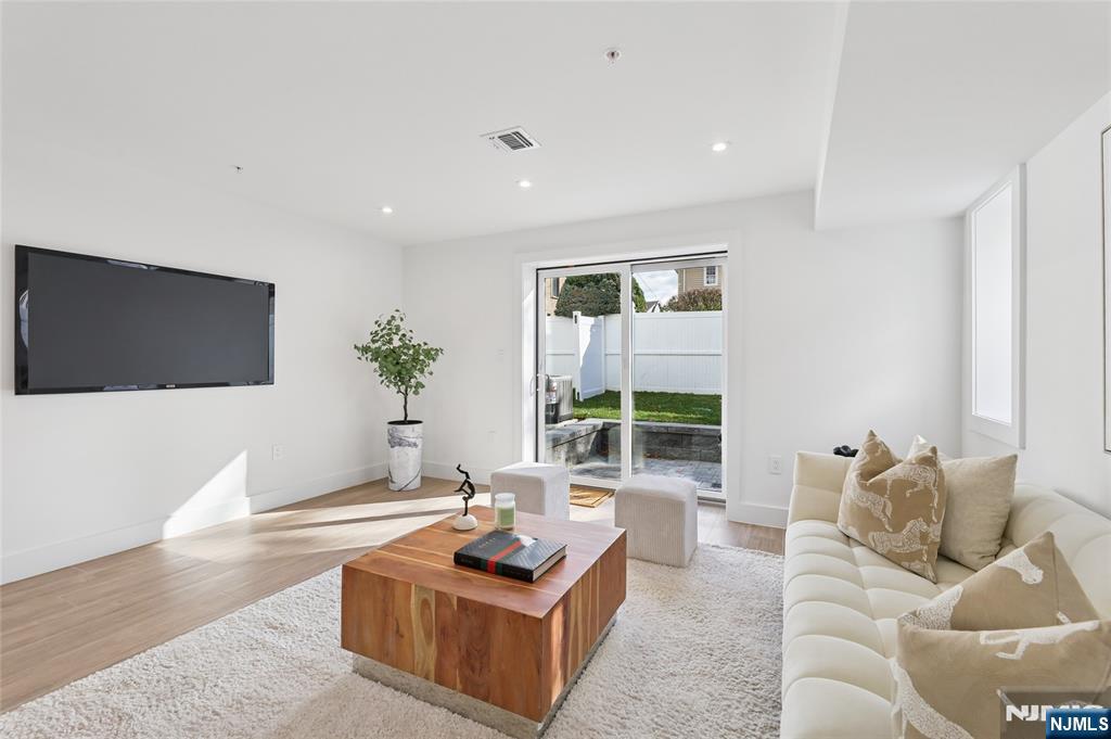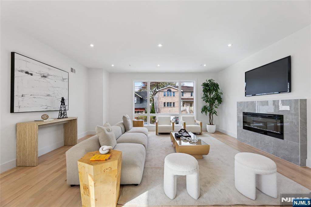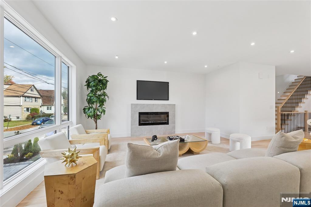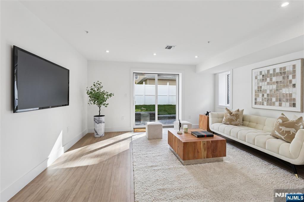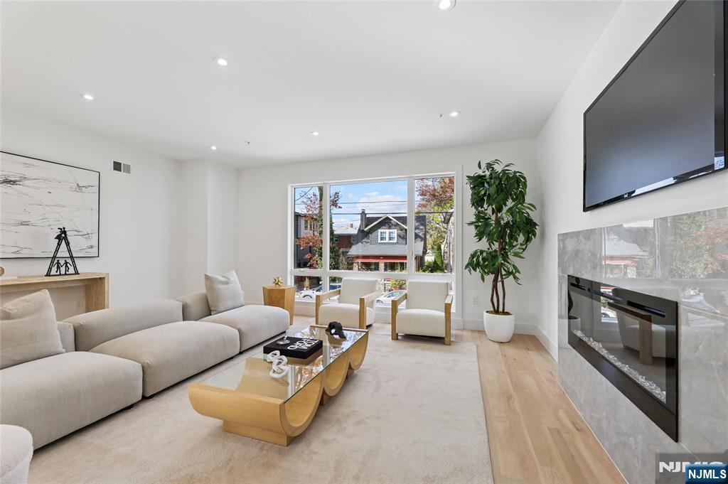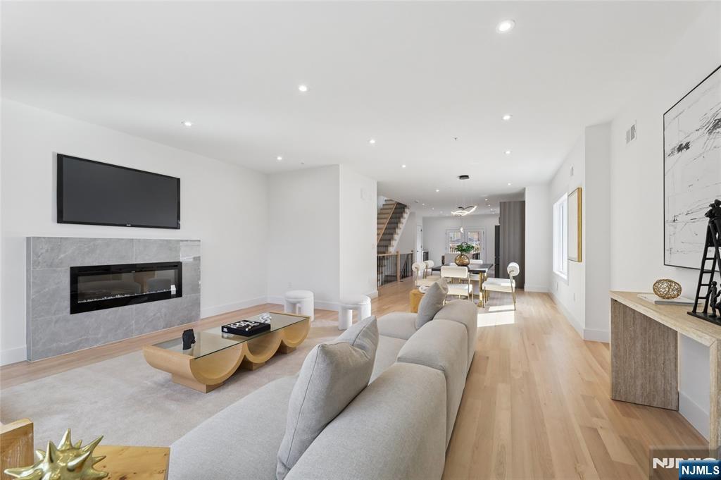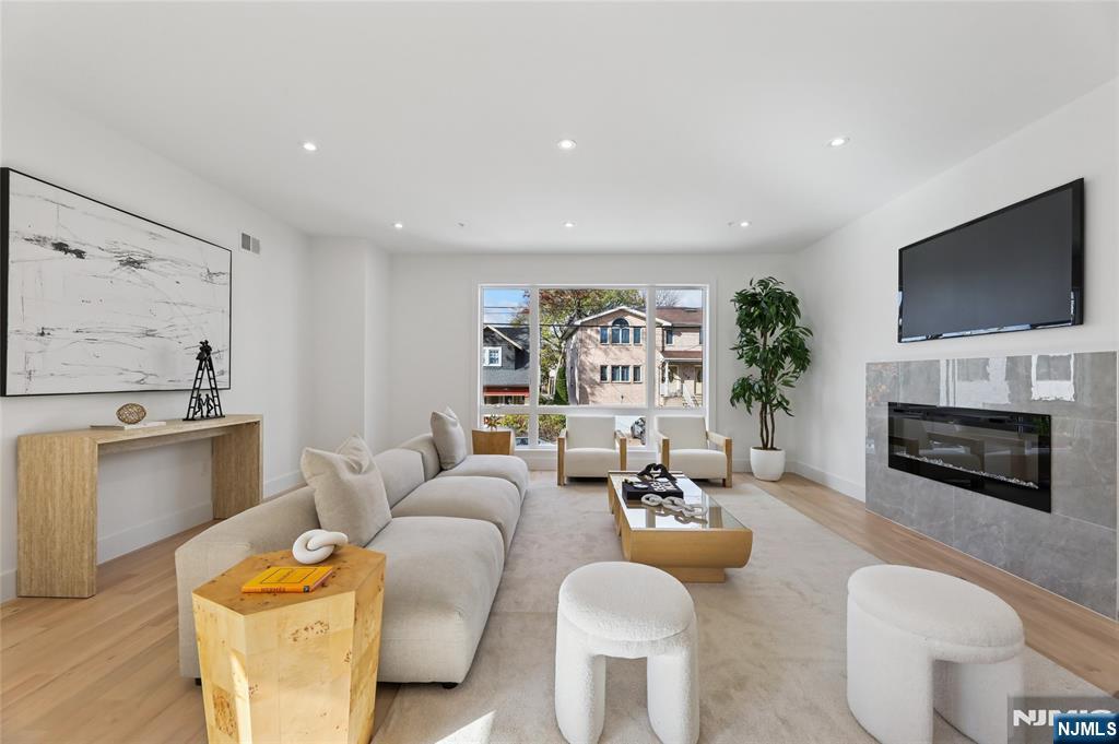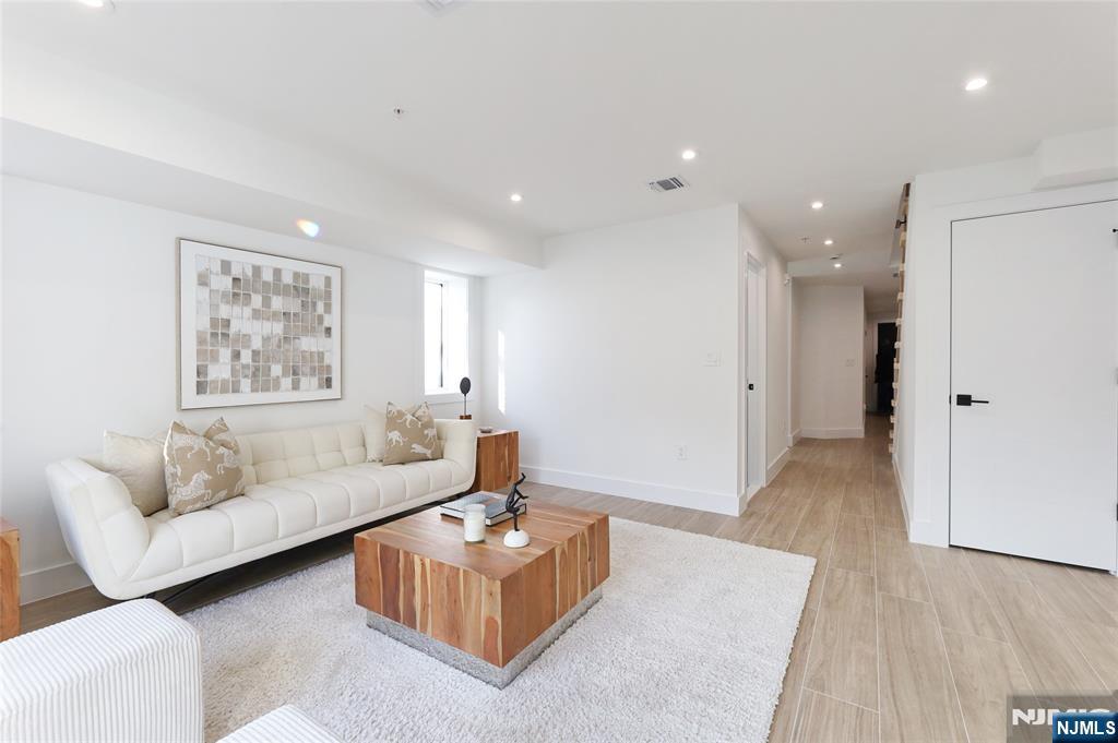Luxurious modern design townhome nestled in Cliffside Park with incredible views of NYC. 4-story living space includes a roof terrace with a wet bar, sleek design, and carefully selected modern and top-of-the-line fixtures. The first floor boasts an open-plan modern kitchen with a quartz waterfall countertop, premium smart appliances, a powder room. It features 3 large bedrooms, 4 baths, a large recreation room on the ground floor, a roof deck with a wet bar, and a mudroom on the ground floor. The house has a fire sprinkler system, central AC and heat, a fireplace, great LED lighting, a hardwood floor, tons of storage, abundant natural light, a large attached garage, and a large car driveway. It is close to restaurants, shops, supermarkets.