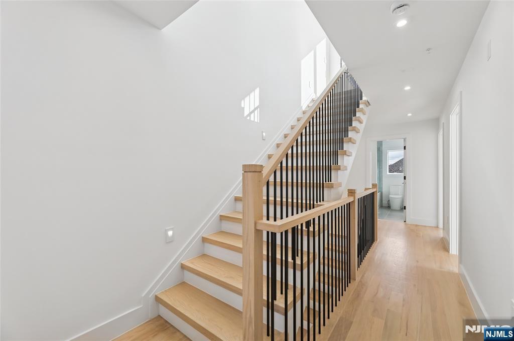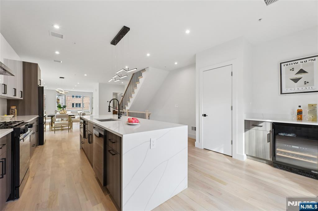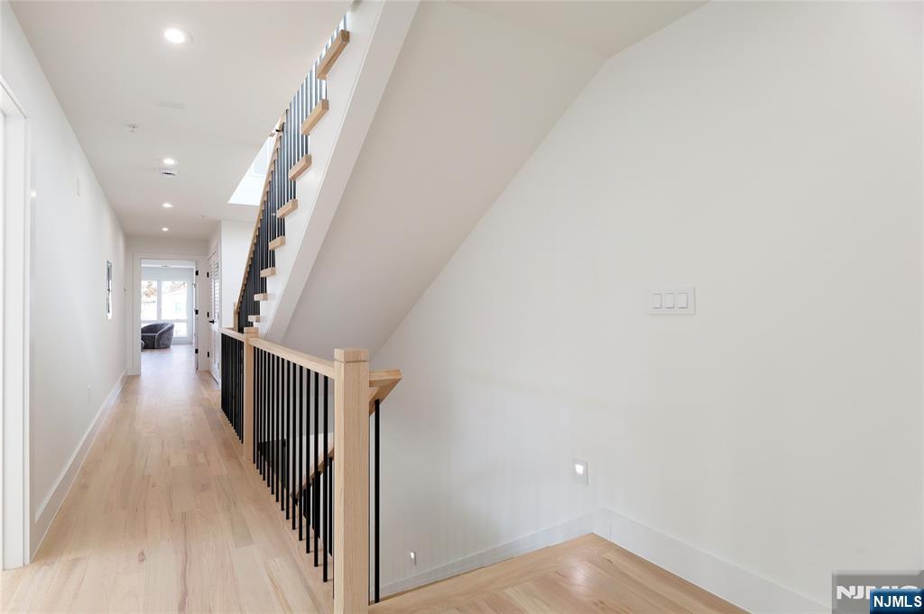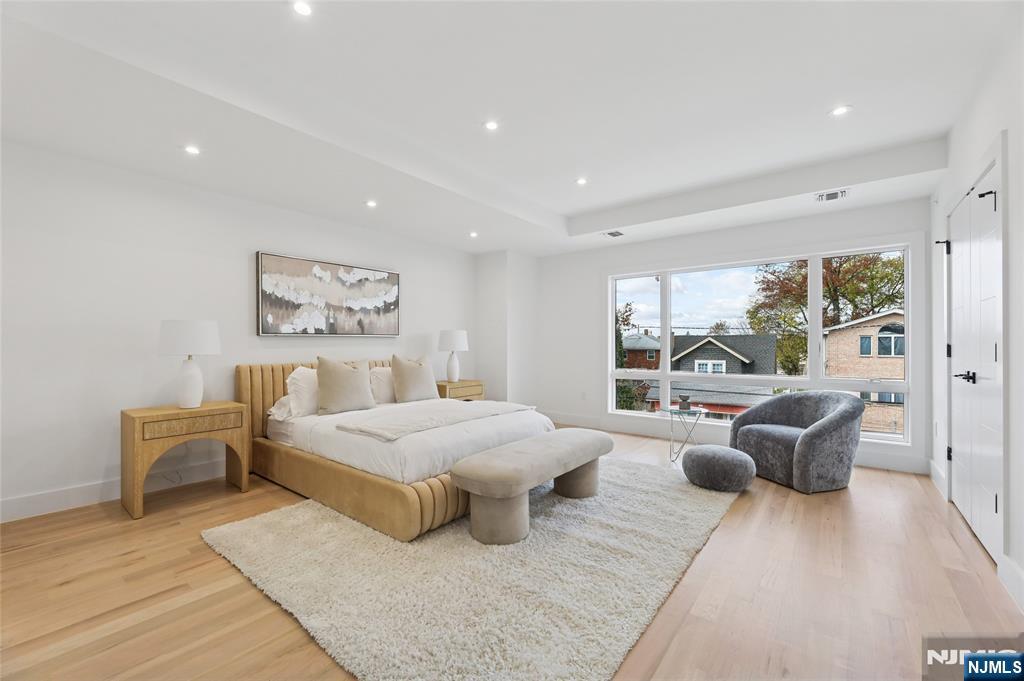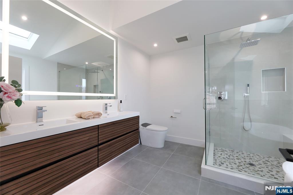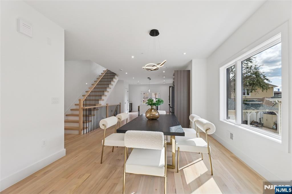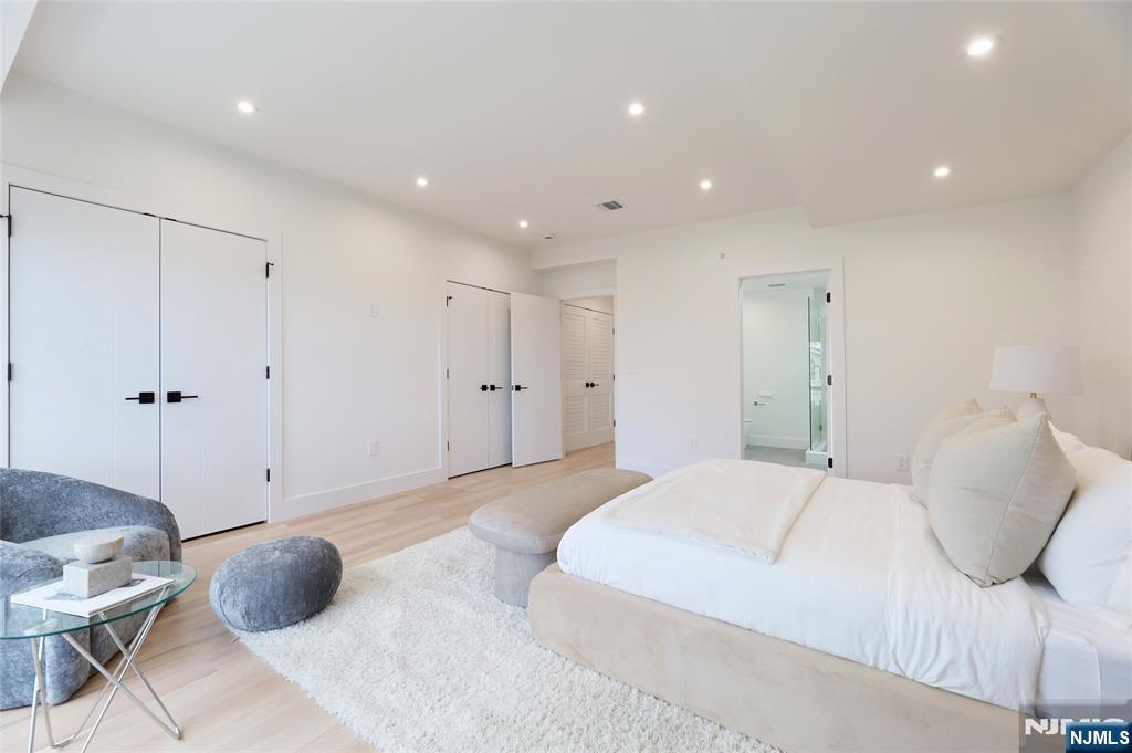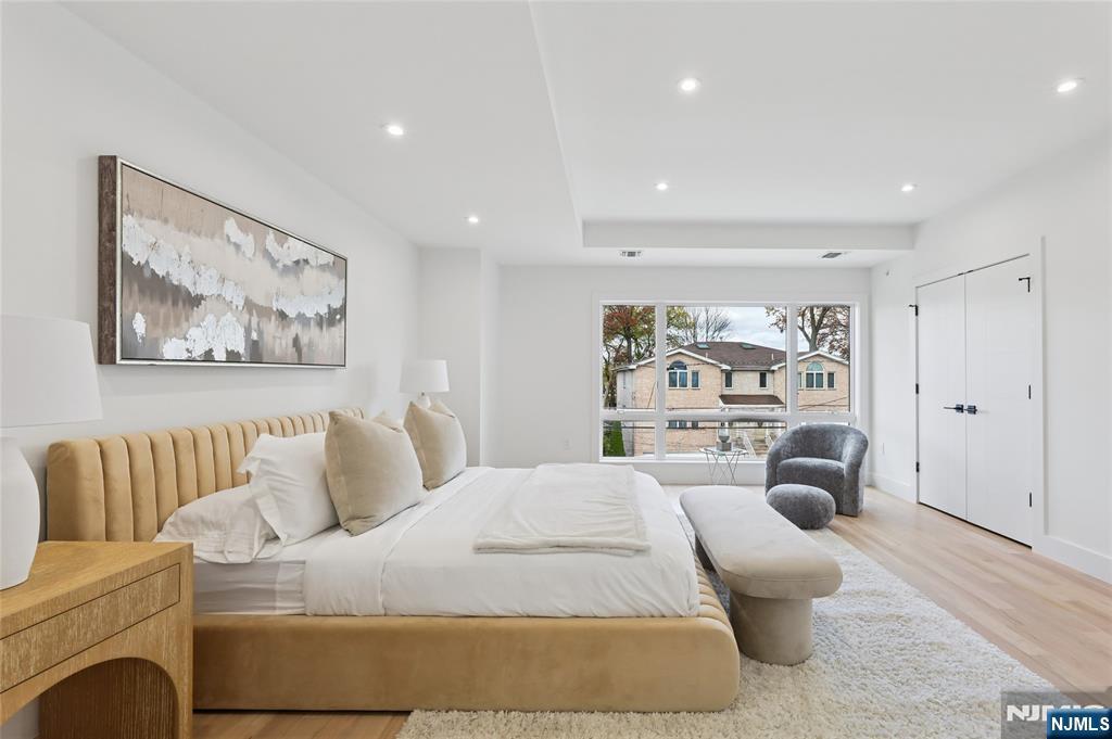 Luxurious modern design townhome nestled in Cliffside Park with incredible views of NYC. 4-story living space includes a roof terrace with a wet bar, sleek design, and carefully selected modern and top-of-the-line fixtures. The first floor boasts an open-plan modern kitchen with a quartz waterfall countertop, premium smart appliances, a powder room. It features 3 large bedrooms, 4 baths, a large recreation room on the ground floor, a roof deck with a wet bar, and a mudroom on the ground floor. The house has a fire sprinkler system, central AC and heat, a fireplace, great LED lighting, a hardwood floor, tons of storage, abundant natural light, a large attached garage, and a large car driveway. It is close to restaurants, shops, supermarkets.