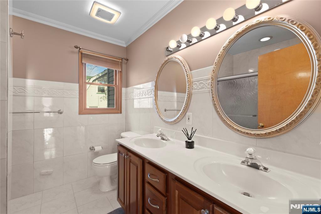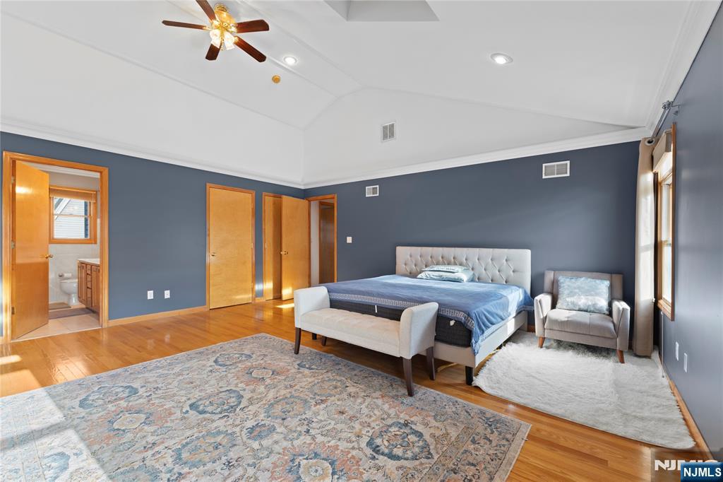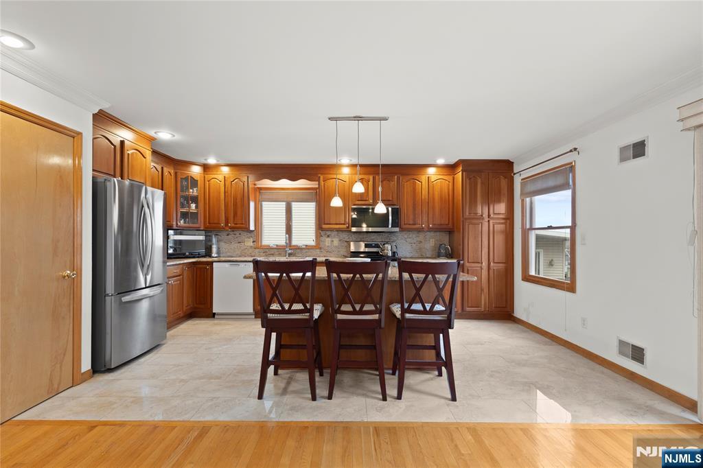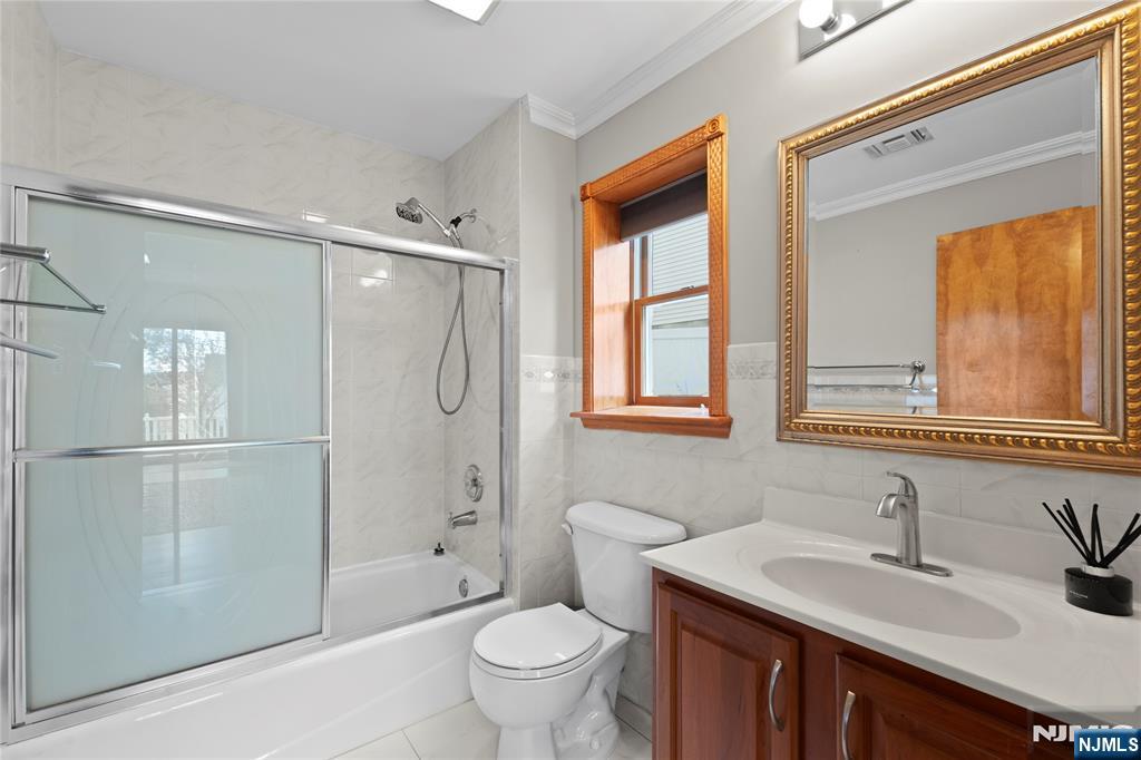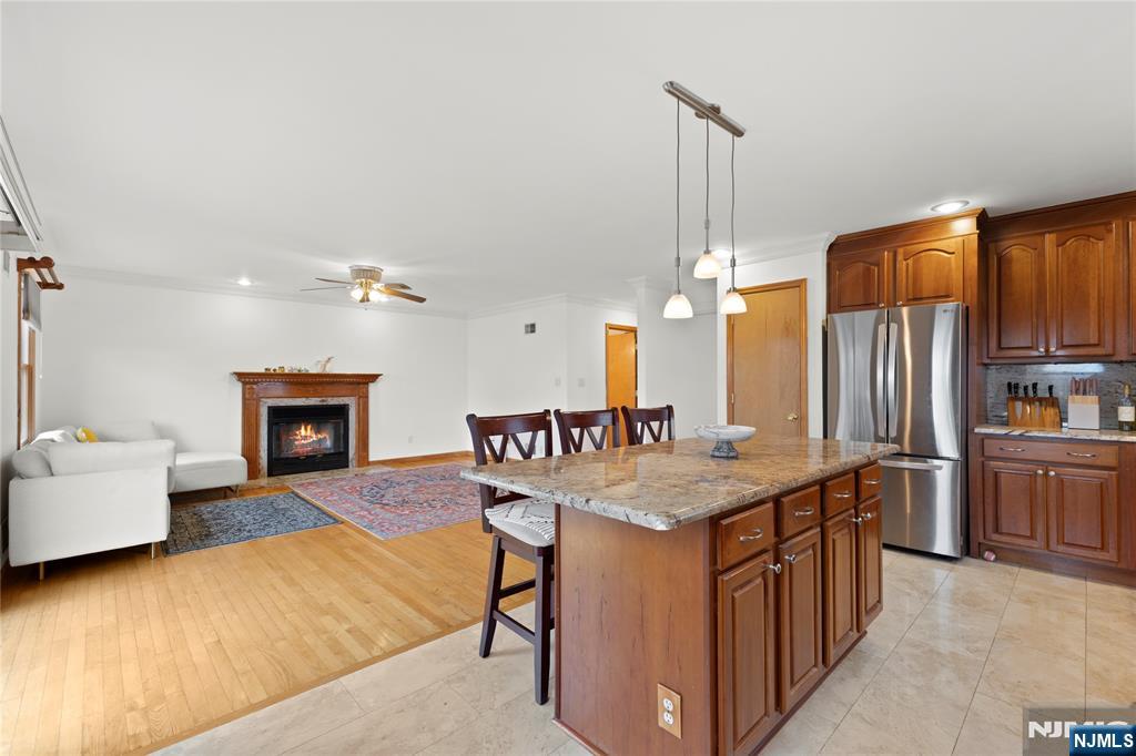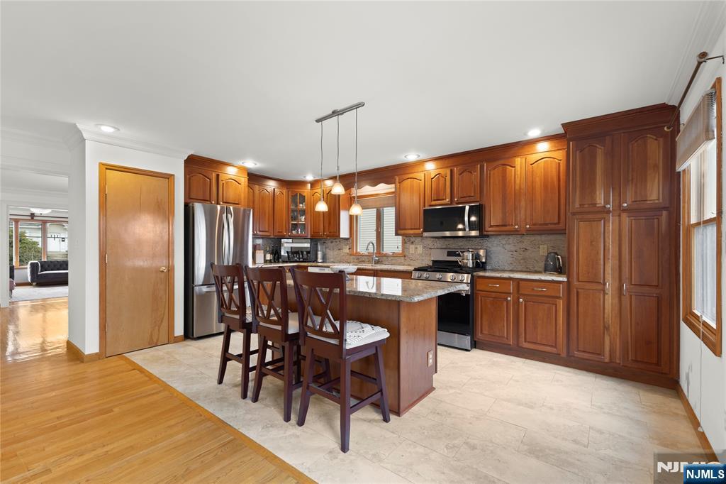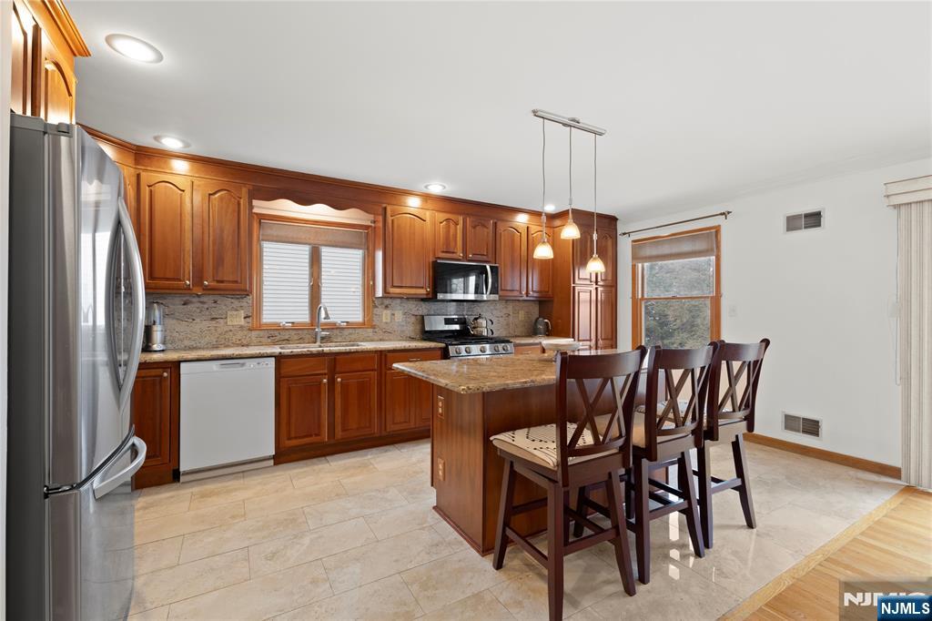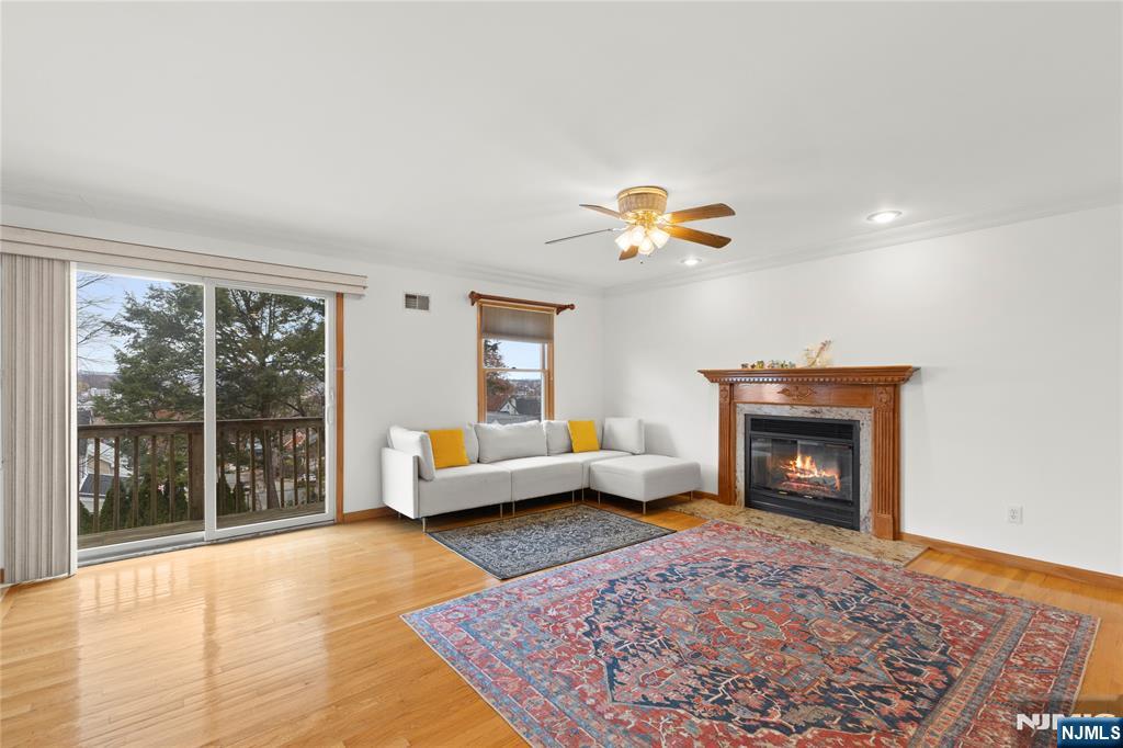Gorgeous 4-bedroom, 3.5 bath colonial with 2-car built-in garage & driveway. Approx. 3,000 sq ft of living space awaits you in this modern home in the Manor Section of Kearny! Living room, formal dining room, family room with wood burning fireplace & sliding door to balcony overlooking 50 x 156' lot, modern kitchen with island & granite tops with tiled backsplash, and half bathroom on 1st floor. The 2nd floor features 4 bedrooms and 2 bathrooms, including a king-size bedroom with a cathedral ceiling, balcony, and skylight, as well as a walk-in closet and a private bathroom with a jetted tub, double vanity sink & shower stall. Fully finished basement with recreation room & bathroom with a walk out to rear yard. 2 Separate gas HVAC heat & air conditioning systems, crown molding, natural wood trim, and hardwood floors. The rear yard boasts a patio, above-ground pool, and mature landscaping. Lots of closet and storage space. A truly lovely, spacious, and "unique" home. Just 2 blocks to the NYC Bus. Save money on your electric bill with leased solar panels.