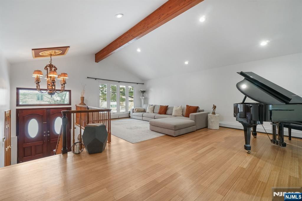 Welcome to this beautifully updated split-level home on a .36-acre lot in Englewood Cliffs! The main level offers a bright living room with vaulted ceilings and exposed beam, an open dining area, and a modern kitchen with access to the backyardâ€â€perfect for indoor-outdoor living. You’ll find three bedrooms and two full baths upstairs, including a primary suite with walk-in closet. The lower level features a large flex space with a wood-burning fireplace, laundry room, half bath, garage access, and a second master suite with its own full bath. Newer windows, central A/C, roof, and boiler add peace of mind. Spacious, updated, and ready to move inâ€â€schedule your tour today!