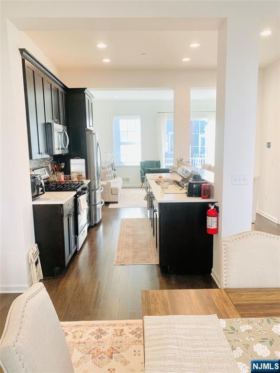 Immaculate and modern 2024 Townhouse, practically new. Open Floor Plan with hardwood floors throughout on the 1st floor living area with Very Spacious Living Room w/Gas Fireplace, Modern Eat-in-Kitchen with quartz counter tops and high-end appliances, spacious Formal Dining Room, Huge Balcony off LR for Relaxation and Entertaining, Powder Room, and 9' Ceilings. Front and Rear Entrances on Ground Level with Bonus Room, Full Bath, two-car Garage and driveway for two cars tandem. Primary Suite w/Full Bath, two additional spacious bedroom and hall Full Bath (SOT). Laundry in unit with high-end washer and dryer. Plenty of Closet Space throughout. Pets conditional: cats, small dogs; additional monthly fee may apply.