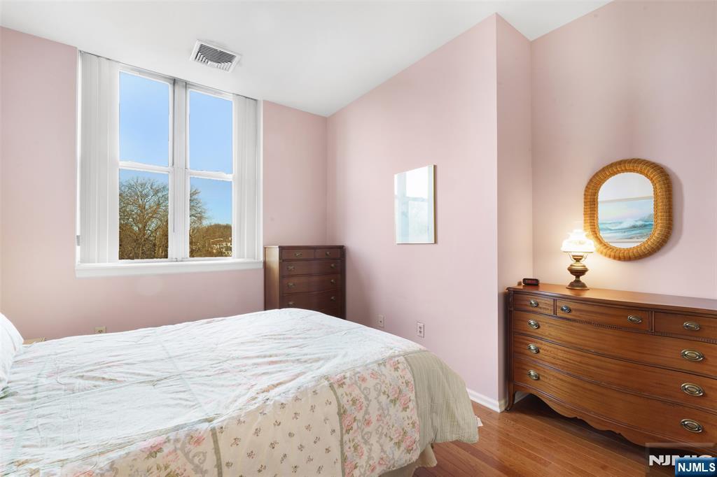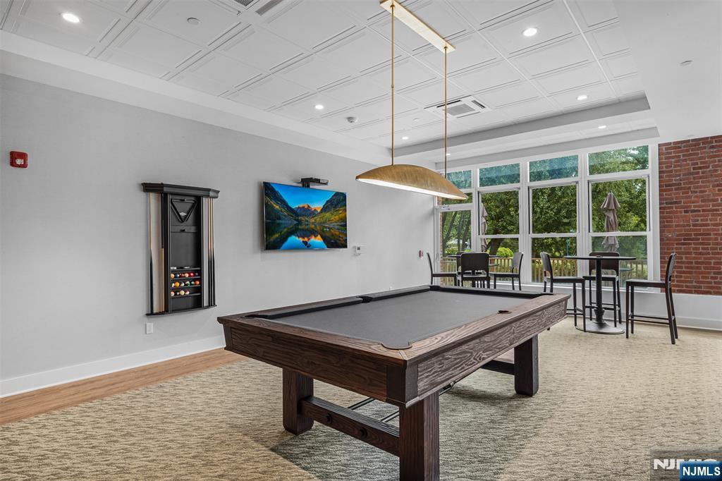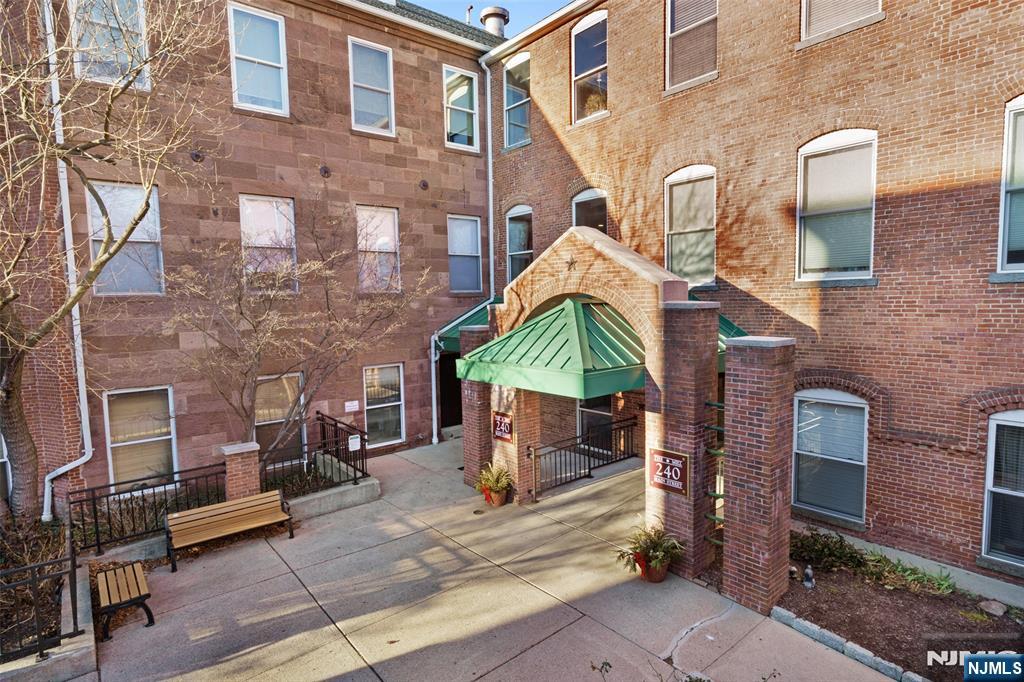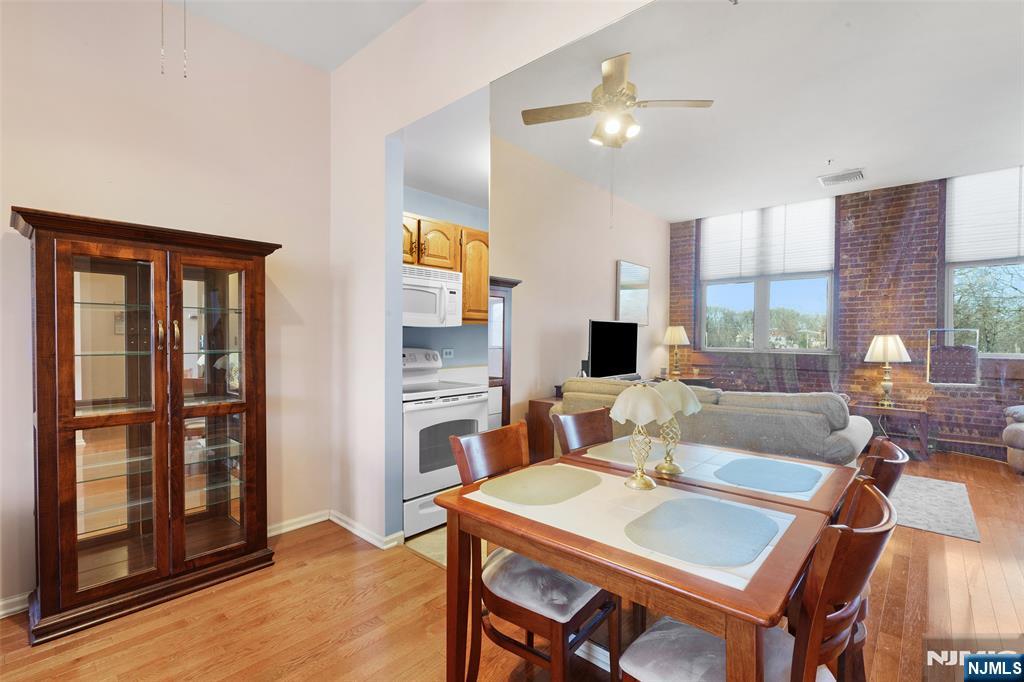 Set on the top floor, this waterfront condo at The Mill showcases classic industrial character and a well-proportioned layout. Exposed brick walls and hardwood floors define the main living space, anchored by a wood-burning fireplace that adds warmth and architectural interest. Oversized windows line the exterior wall, filling the home with natural light and offering peaceful views of the river and surrounding treetops. The living room is generously sized for both everyday living and entertaining, flowing naturally into a dedicated dining area. The kitchen is thoughtfully positioned just off the main living space, creating a functional separation while maintaining an open feel. A front foyer closet adds valuable storage, and in-unit laundry enhances everyday convenience. The bedroom is bright and comfortable, featuring tall windows and a spacious walk-in closet. Residents of The Mill enjoy an impressive array of amenities, including a state-of-the-art fitness center, a renovated community room, tennis courts, an in-ground swimming pool, scenic walking and jogging paths, and the plaza deck overlooking the waterfalls. Located near shops, restaurants, and NJ Transit bus and train options, this community offers easy access to NYC and Hoboken, making it an ideal choice for commuters seeking space, character, and convenience.