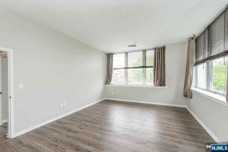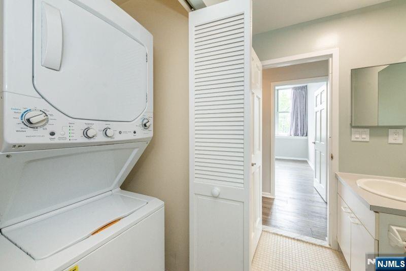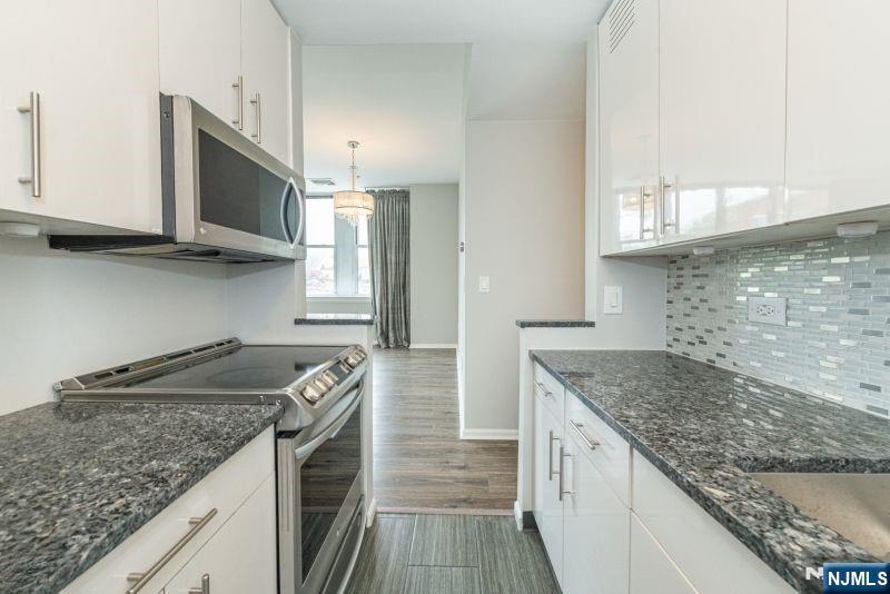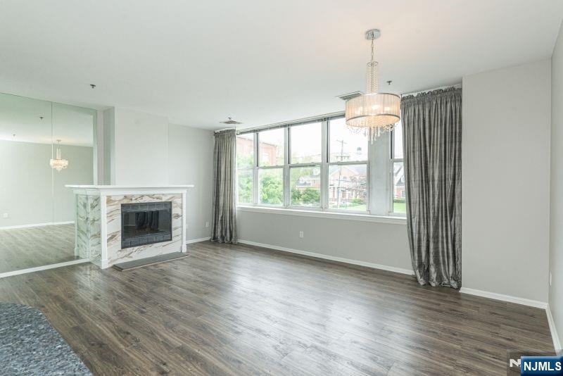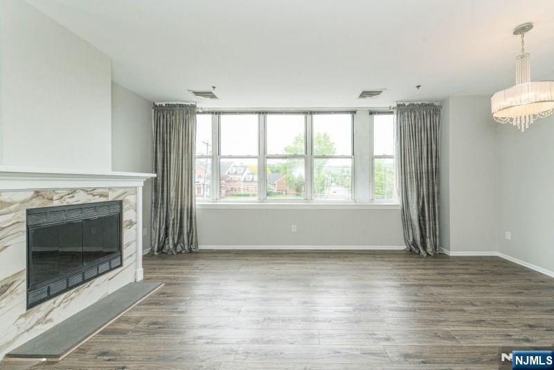 This stunning two-bedroom corner residence occupies a top-floor position within the 240 building and offers a bright open layout with abundant natural light! Wide-plank flooring and high ceilings create an airy feel throughout the living spaces. The living room is generously sized and anchored by a wood-burning fireplace creating a strong focal point for both everyday living and entertaining. A mirrored accent wall enhances the sense of scale and reflects natural light across the space. The open layout flows comfortably into the dining area, highlighted by a contemporary chandelier. The kitchen features white cabinetry, granite countertops, a tile backsplash, and stainless steel appliances, offering a clean and functional workspace that connects easily to the main living area. The expansive primary bedroom offers seasonal views of the waterfall, a large walk-in closet with built-in shelving provides excellent storage and the bathroom includes a modern vanity and tub-shower combination. In-unit laundry adds everyday convenience! Neutral finishes throughout create a cohesive, move-in ready atmosphere. Residents of The Mill enjoy access to a fitness center, community room, in-ground swimming pool, tennis courts, walking and jogging paths, and the plaza deck overlooking the waterfalls, along with nearby shopping, dining, and convenient access to NYC transportation.