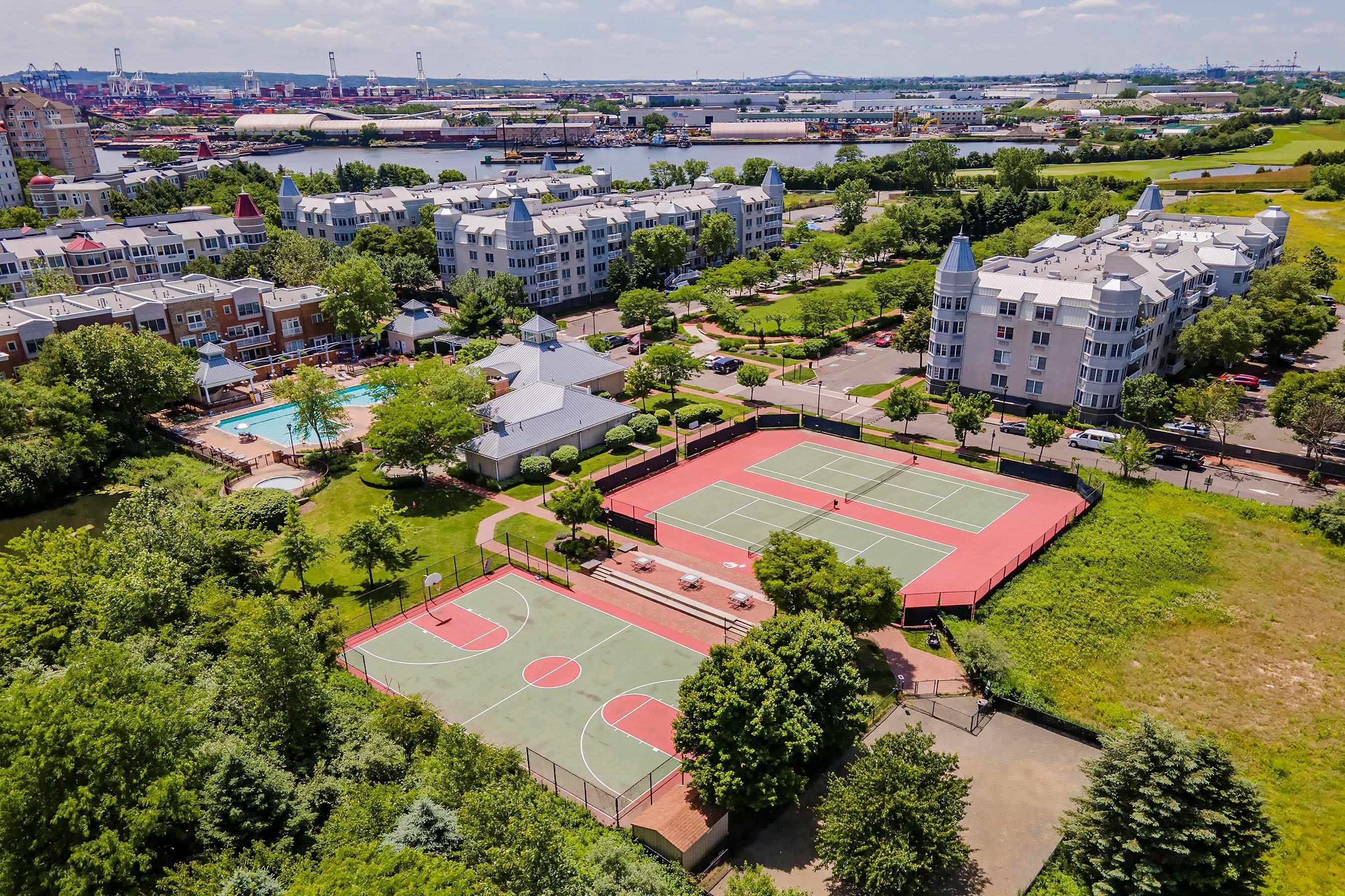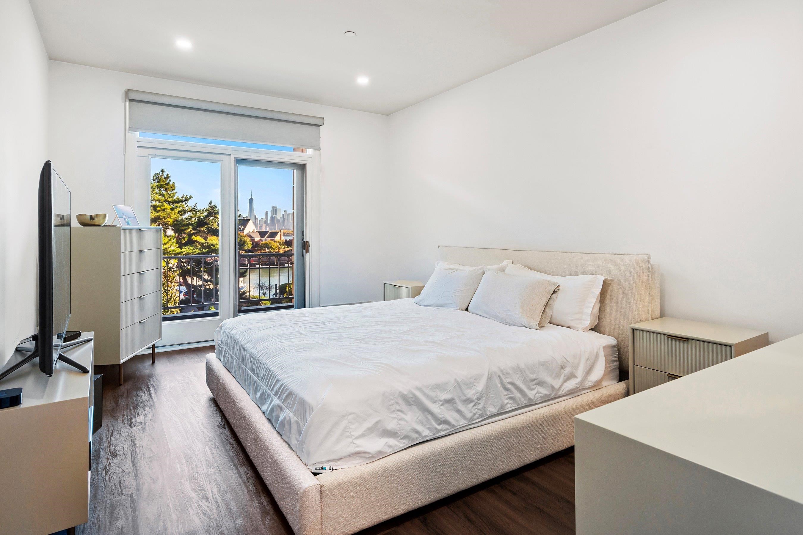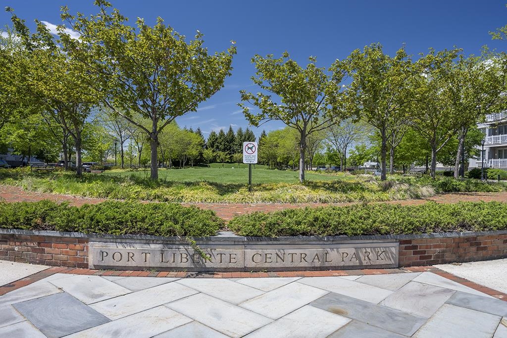 Looking for a View? Sense pleasing and understated space just for the discerning homeseeker. Direct NYC and Hudson River Views. Formal entryway leads to a spacious living and dining room. All rooms offer Seaside Oak colored hard surface flooring. All rooms with recessed lighting. But this home offers a unique and modern feature – Opaque Smart Windows. This is a high-tech window system wherein you just click a button and the windows turn opaque—no need for blinds and the result is clean lines. Double access to your own private balcony from both the living and primary bedroom. Views are offered from both rooms. The views on this listing are genuine and taken from the inside. Masterful kitchen with high-end Café Appliances. Matte white with brushed bronze handles and a 4 door smart refrigerator. Stainless pulls on the cabinets doors and a generous amount of Corian workspace will aspire the home gourmet. The layout offers privacy with bedrooms and baths at opposite ends. The primary bedroom has a fully custom walk-in closet and en suite bath with whirlpool tub. On the far end is an oversized guest bedroom and utilizes the hallway bath. Modern pedestal style sink has been installed. Other features central air conditioning, new LG washer/dryer in unit, garage parking and full Port Liberte amenity package. This includes 24 hour Gatehouse Security, professional style fitness facility, two outdoor pools, tennis courts, basketball court, tranquil green spaces, outdoor play area, fenced dog run and idyllic waterfront promenades. Your monthly maintenance fee includes: heat, water (hot and cold), sewer, garage parking, flood insurance and all amenities. Easy NYC commute via on-site high speed ferry or on-site Shuttle to the Grove St PATH. Just minutes to all major highways and Newark Liberty Airport.