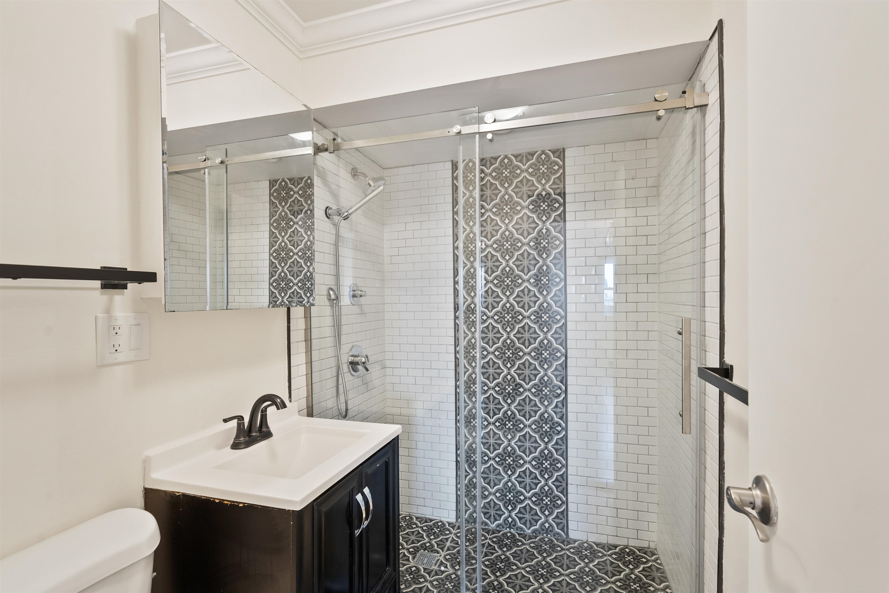 Welcome to this bright and updated 1-bedroom, 1-bath condo located on the 3rd floor of a well-maintained, professionally managed building along Kennedy Boulevard. This approximately 650 sq ft residence offers a functional layout, modern finishes, and excellent commuter convenience. The unit features wide-plank wood-look flooring throughout the living and bedroom areas, complemented by recessed lighting and crown molding. The open living/dining area provides comfortable space for everyday living and entertaining. The updated kitchen includes white shaker cabinetry, granite countertops, subway tile backsplash, and stainless steel appliances, including a electric stove/range and built-in microwave. A peninsula counter offers additional prep space and casual seating. The modern bathroom is finished with custom tile flooring, a fully tiled shower with decorative accent tile, a sleek vanity, and updated fixtures. The bedroom is generously sized and features double closets and great natural light. Additional highlights include in-unit washer, on-site laundry room, and heat and hot water included in the maintenance, offering added value and predictable monthly expenses. Ideally located along the Kennedy Boulevard corridor, close to shopping, dining, parks, major highways, and convenient NYC transportation, this move-in-ready home is perfect for commuters or owner-occupants seeking comfort and accessibility.