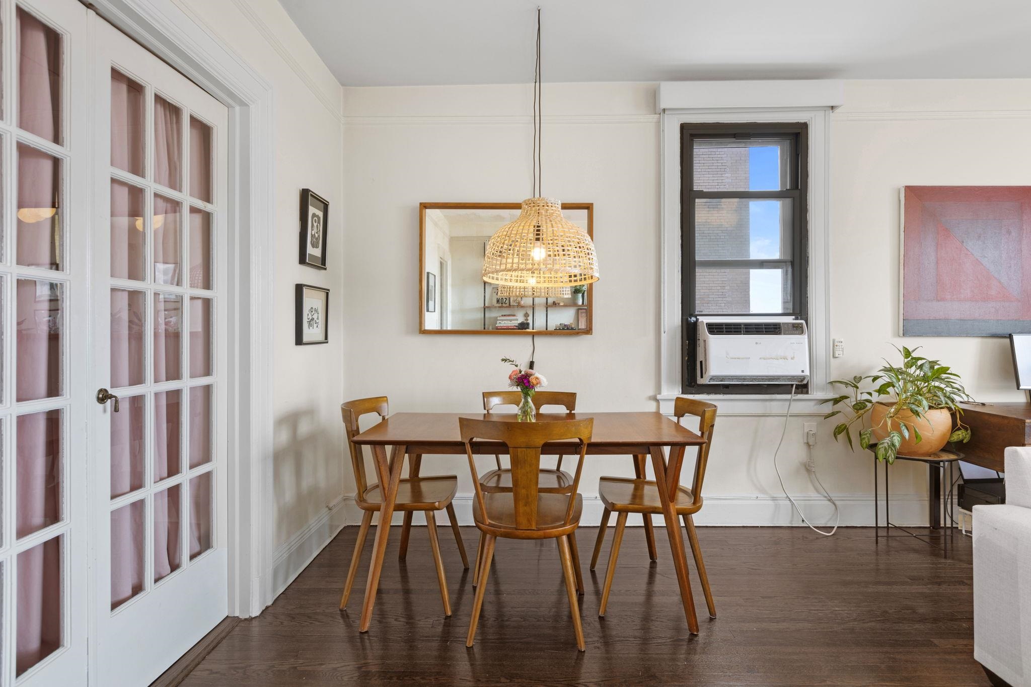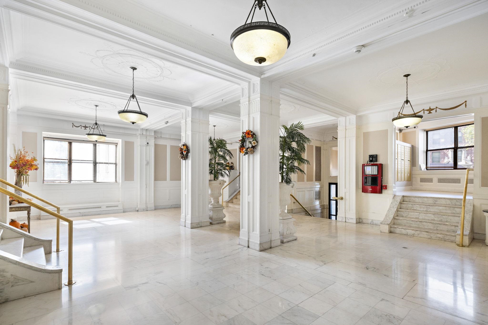 Elegant and spacious condominium in a distinguished pre-war elevator building, featuring rich hardwood floors throughout, a sun-filled living room, and a versatile flex room with two windows and a closet—ideal as a second bedroom or home office. A double set of windows throughout the home allows you to leave the city sounds behind, offering a sense of peace and serenity rarely found in an urban setting. The thoughtfully designed kitchen is equipped with a premium Wolf gas range, marble countertops, classic subway tile backsplash, and dishwasher. A recently renovated bathroom showcases timeless hexagon floor tile and a sleek glass shower door, thoughtfully set apart from the main living areas and leading to the serene primary bedroom with a generously sized walk-in closet. The Hague is an iconic building offering a grand marble lobby, three elevators, a fully equipped gym, an on-site superintendent, a large common laundry room, and a beautifully landscaped, furnished courtyard. Ideally located just three blocks from the highly rated Learning Community Charter School and the 273-acre Lincoln Park, with convenient access to NYC buses and the Journal Square PATH station. This home seamlessly blends historic character with modern comfort and everyday tranquility.