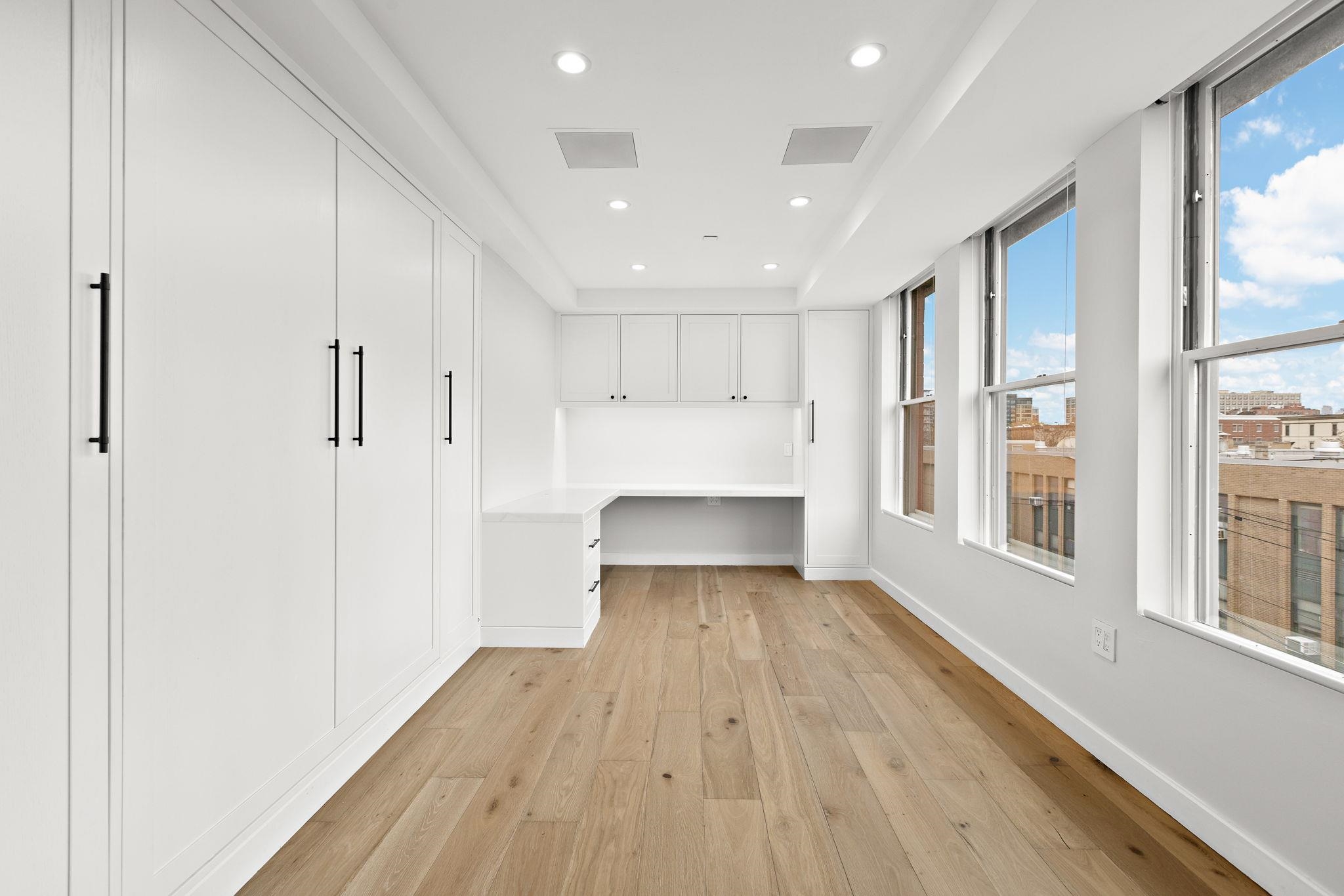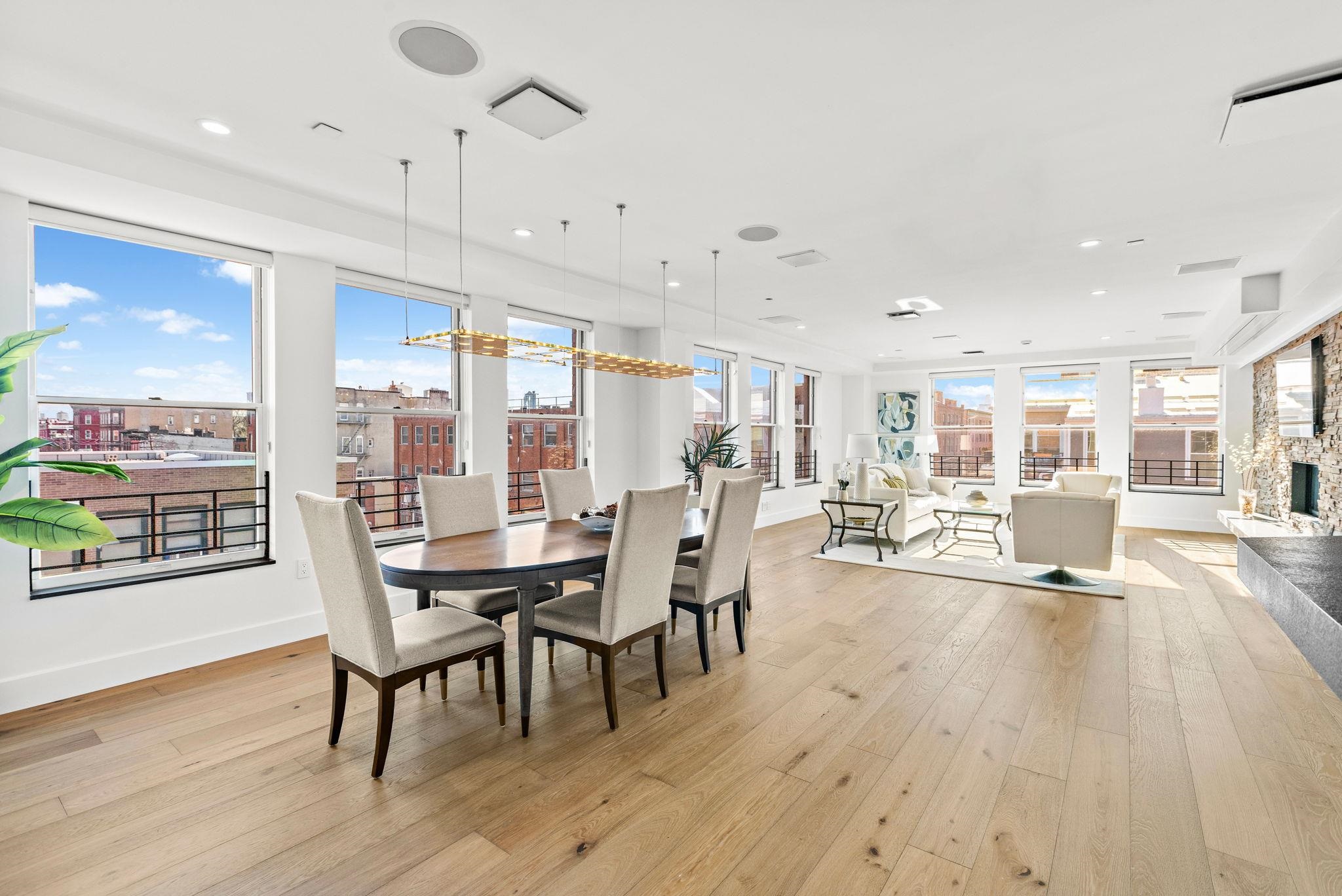 Welcome home to the Penthouse Residence at Clinton Crossings, a rare offering within this highly coveted steel-and-concrete elevator building, known for its quiet, refined living. Spanning an impressive 2,430 square feet, this expansive residence has been thoughtfully refreshed with brand-new hardwood floors throughout and a tastefully updated kitchen. The flexible layout offers four bedrooms, including a dedicated home office with custom built-ins and a queen-size Murphy bed, ideal for today’s lifestyle. The primary suite serves as a private retreat with a generously sized, spa-inspired bathroom and custom his-and-hers walk-in closets. The chef’s kitchen features Viking appliances, gas cooking, Miele dishwasher, built-in Miele espresso machine, complemented by abundant pantry storage and integrated refrigerated drawers, making it ideal for entertaining. Additional highlights include stunning NYC skyline views, dual-zone central air with Nest thermostats, a multi-zone built-in speaker system, deeded garage parking with large private storage, and unmatched commuter convenience with an express bus to Port Authority just outside the building. Ideally located in uptown Hoboken near Washington Street’s shops, dining, and waterfront transportation, this exceptional penthouse offers a rare combination of scale, luxury, and location.