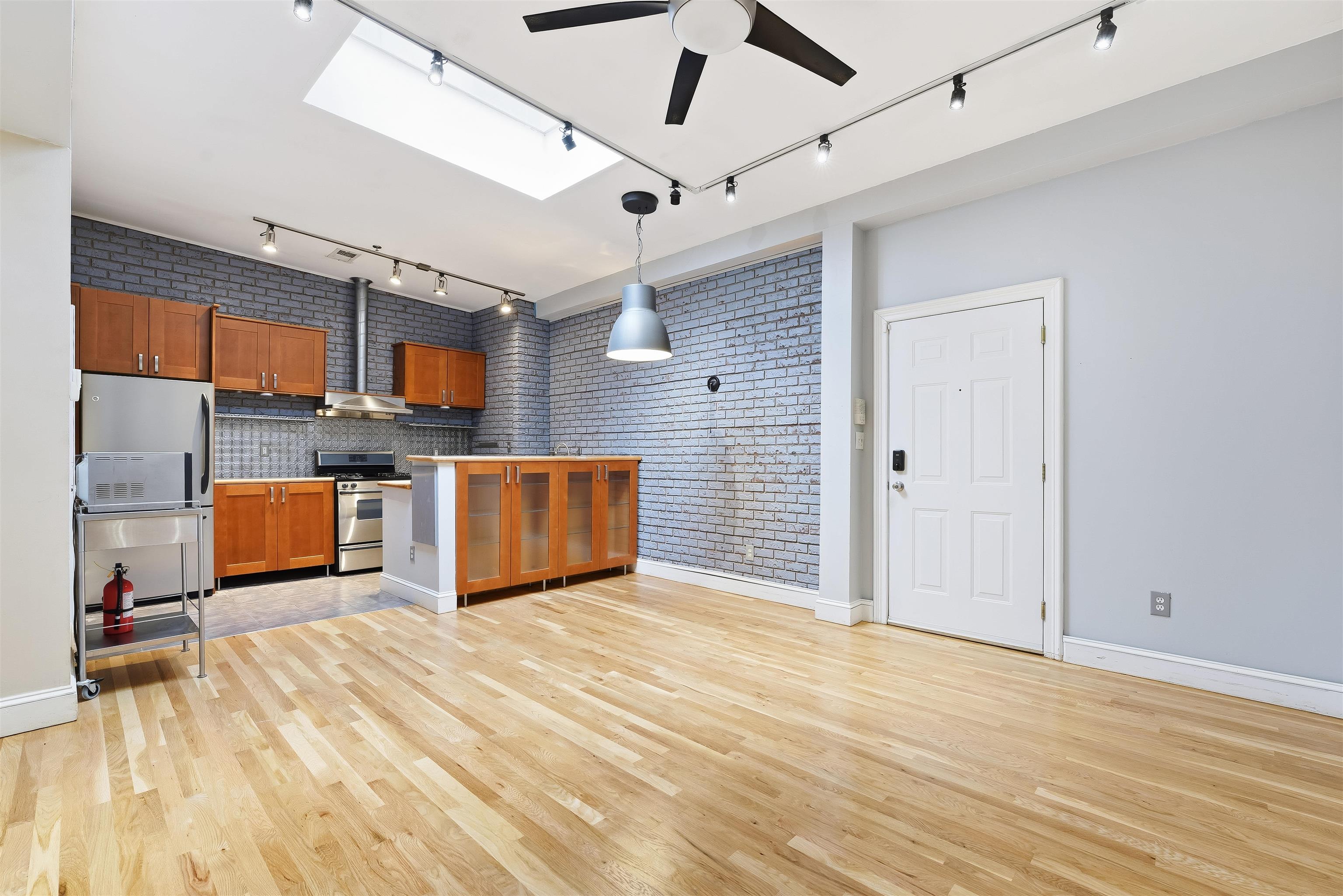 Discover your ideal home at 519 Monroe St. This spacious 2-bedroom, 1-bath residence offers 1,049 sq ft of comfortable living space, featuring central air, a fully equipped kitchen, and the convenience of an in-unit washer and dryer. A generous private terrace provides the perfect outdoor retreat, complemented by hardwood floors and an intercom system. Ideally located near parks and train and bus transportation, the home includes two garage parking spaces in a semi-private garage shared with only one other owner, plus a large private storage area at the back of the garage. This exceptional property is not to be missed.