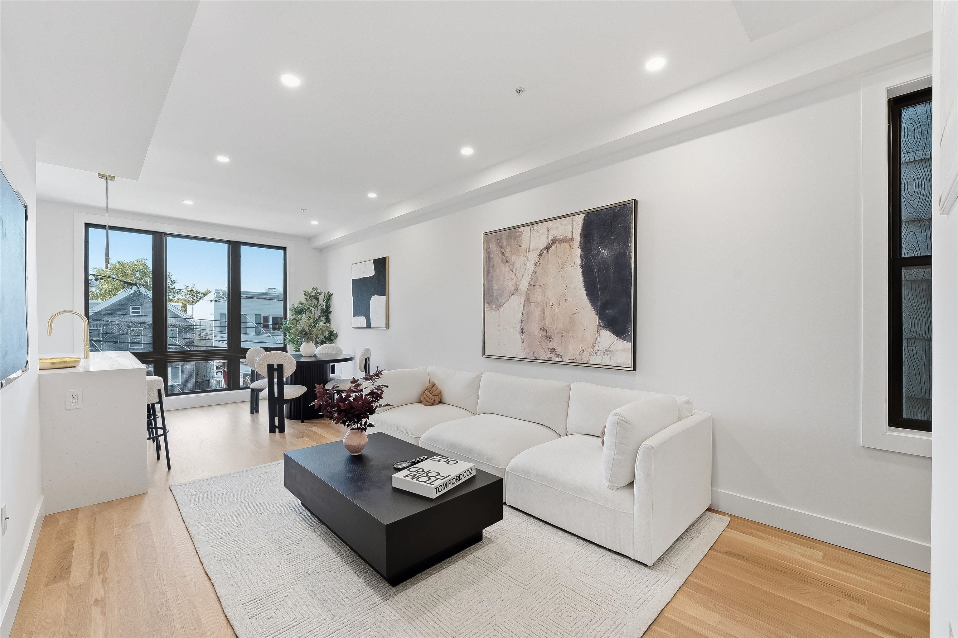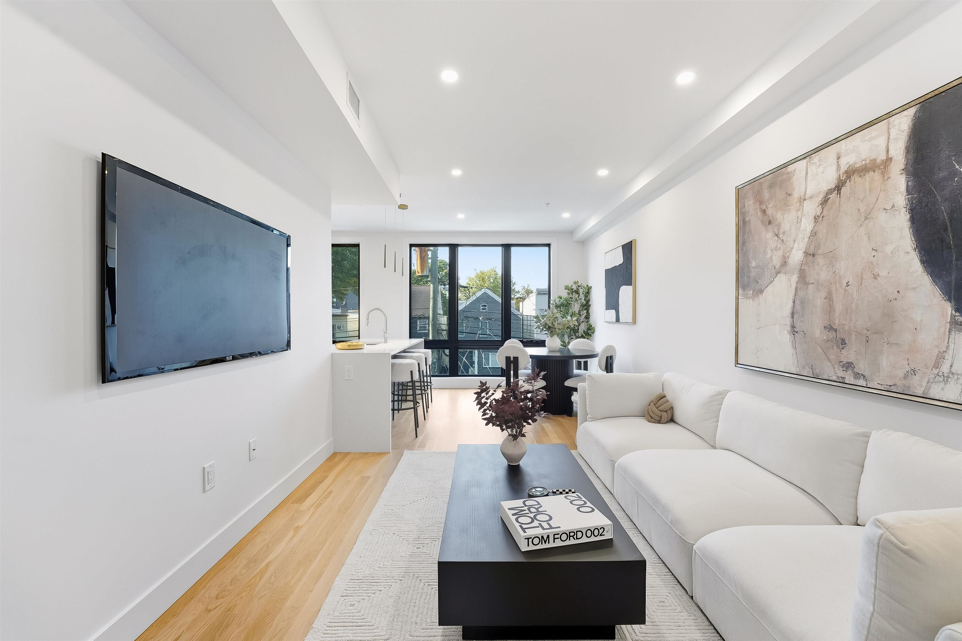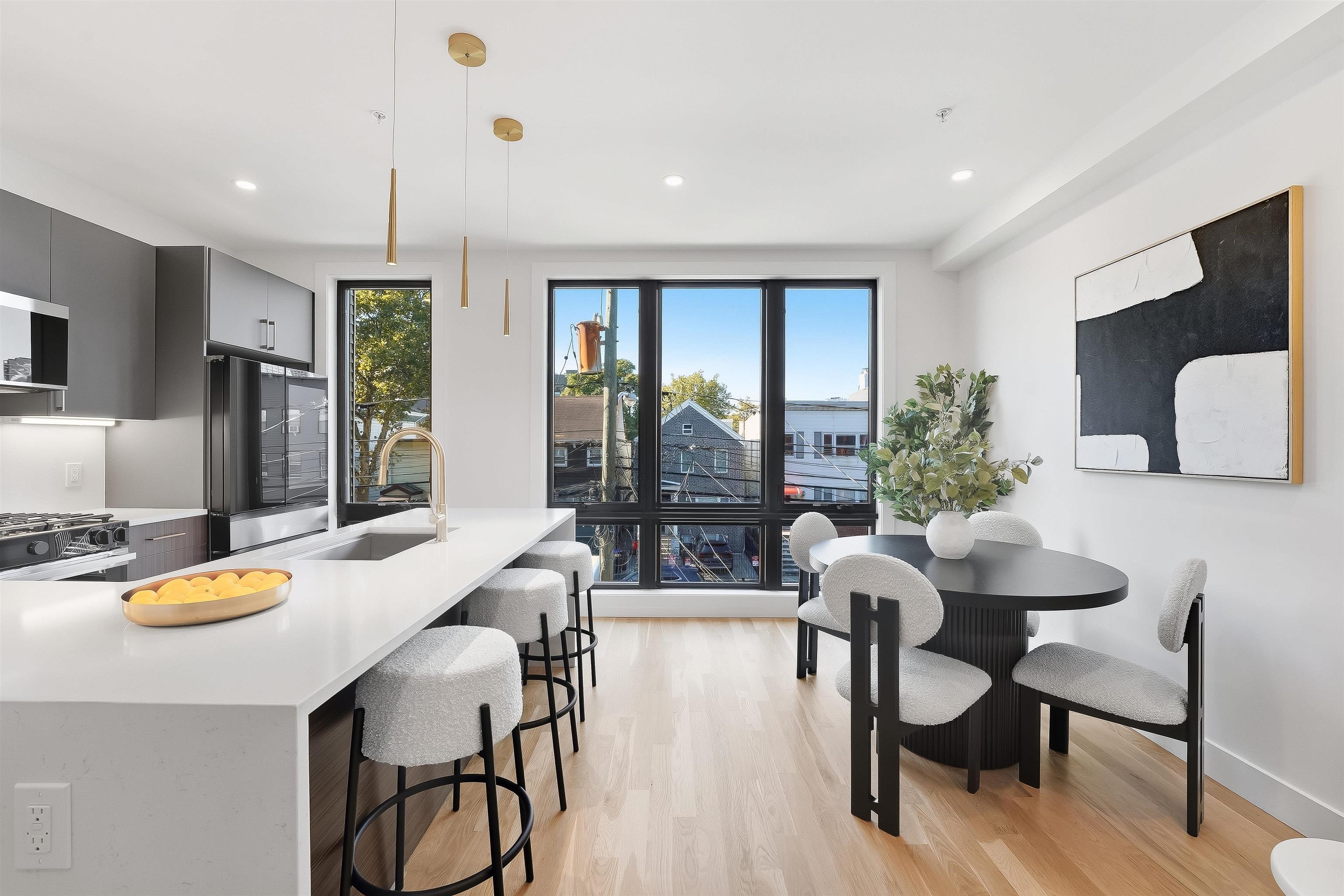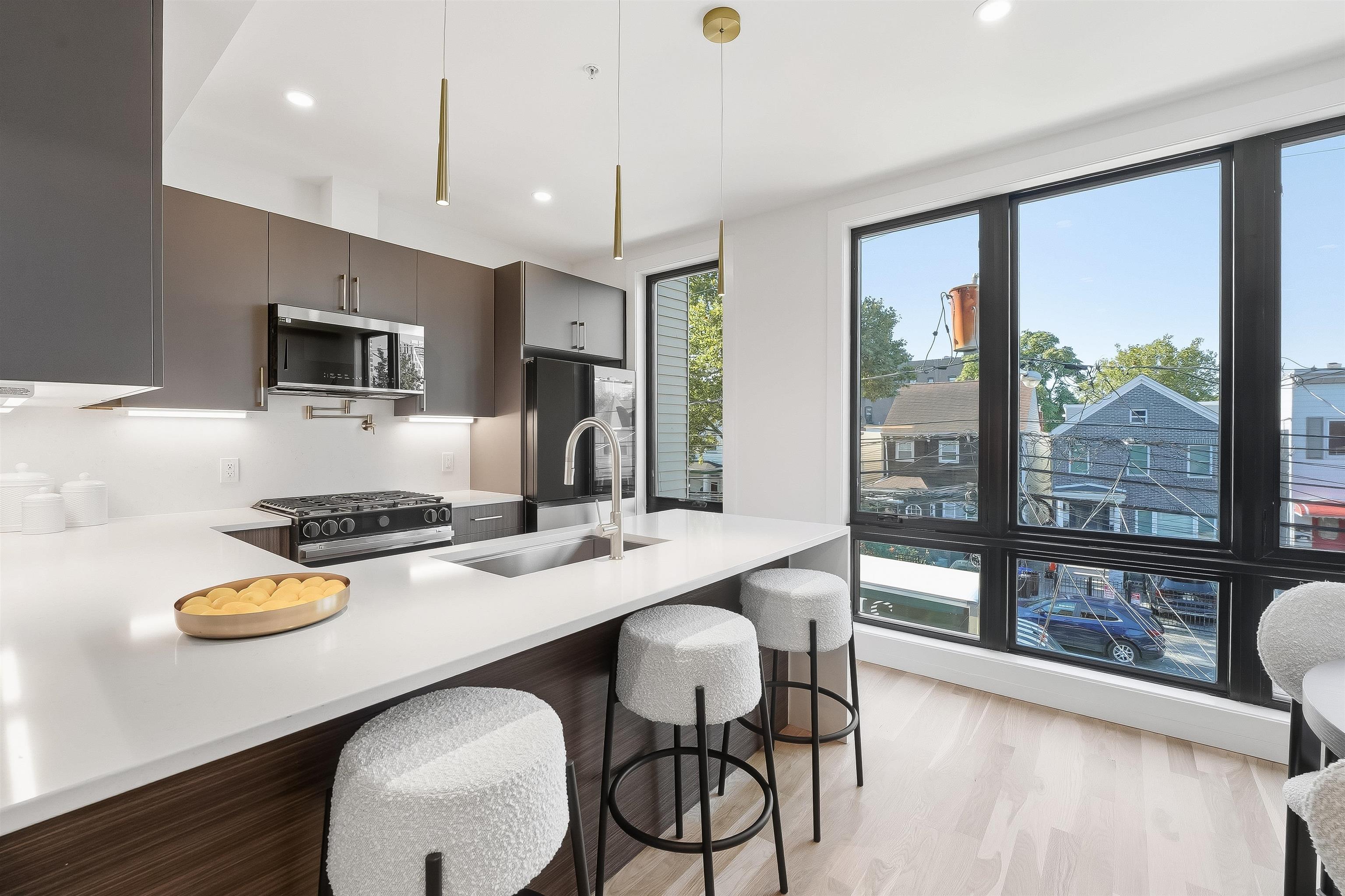 EXCEPTIONAL VALUE AND INCREDIBLE OPPORTUNITY with one year of off-site parking prepaid and a five-year tax abatement approved. Situated in the heart of the highly desirable Jersey City Heights, this meticulously rebuilt boutique building offers a limited collection of three distinctive residences, seamlessly blending elevated design with modern functionality. This sun-drenched 3-bedroom, 2-bath home showcases refined finishes and thoughtful design throughout. A classic red brick façade with bold black accents delivers standout curb appeal, while the interior features high ceilings, solid white oak flooring, recessed lighting, and floor-to-ceiling windows that flood the space with natural light. At the heart of the home, the chef’s kitchen makes a bold statement with sleek two-tone cabinetry, quartz waterfall countertops and full-height backsplash, a pot filler, and a full suite of top-of-the-line smart Samsung appliances. Designed for both everyday living and effortless entertaining, the space balances style and functionality with ease. The primary suite features double closets and an en-suite bath with double vanities, designer fixtures, and a high-end smart toilet. Step out onto your private balcony and enjoy the tranquil setting—perfect for morning coffee or an evening drink, offering a personal escape from the bustle of city life. Two additional bedrooms provide flexibility for children, guests, or a home office, served by a stylish full bathroom. Built for efficiency and modern comfort, the home includes spray foam insulation and smart home upgrades such as a Honeywell thermostat, Ring doorbell, keyless entry, and Wi-Fi–enabled appliances. A private 9’ x 5’ storage room on the lower level provides convenient space for bikes, strollers, and seasonal items. NYC access is seamless via the NJ-119 bus to Midtown, Citibike or the NJ-83 bus to the Journal Square PATH, or an easy 10-minute walk to the station. Enjoy a vibrant neighborhood with popular cafes, restaurants, and shops, along with nearby parks featuring walking trails, sports fields, playgrounds, an ice rink, and a seasonal heated pool.