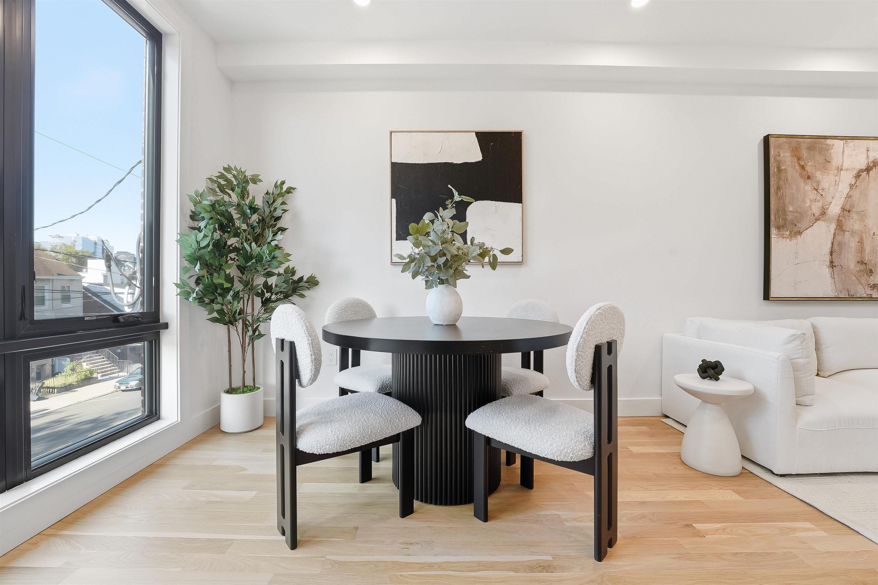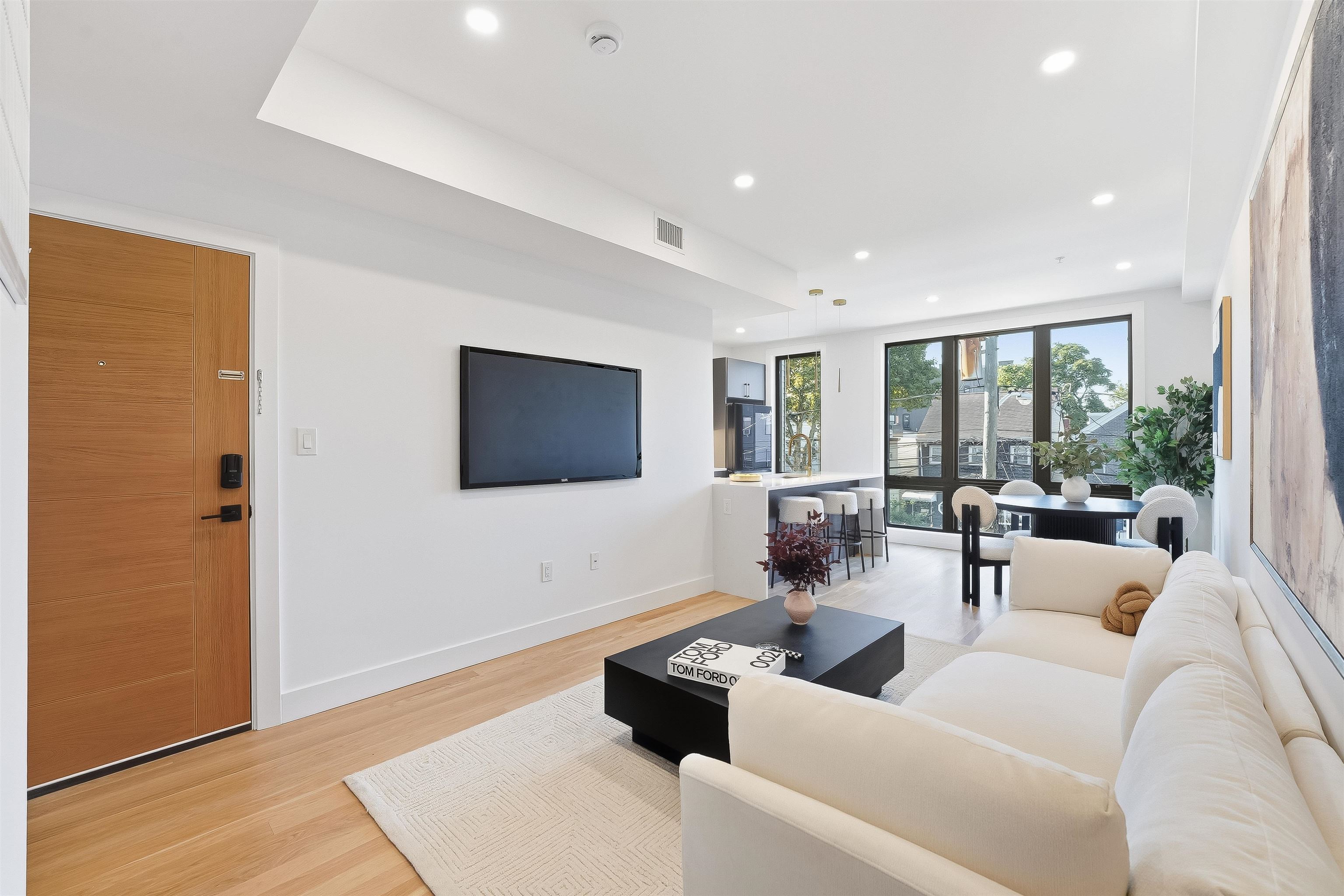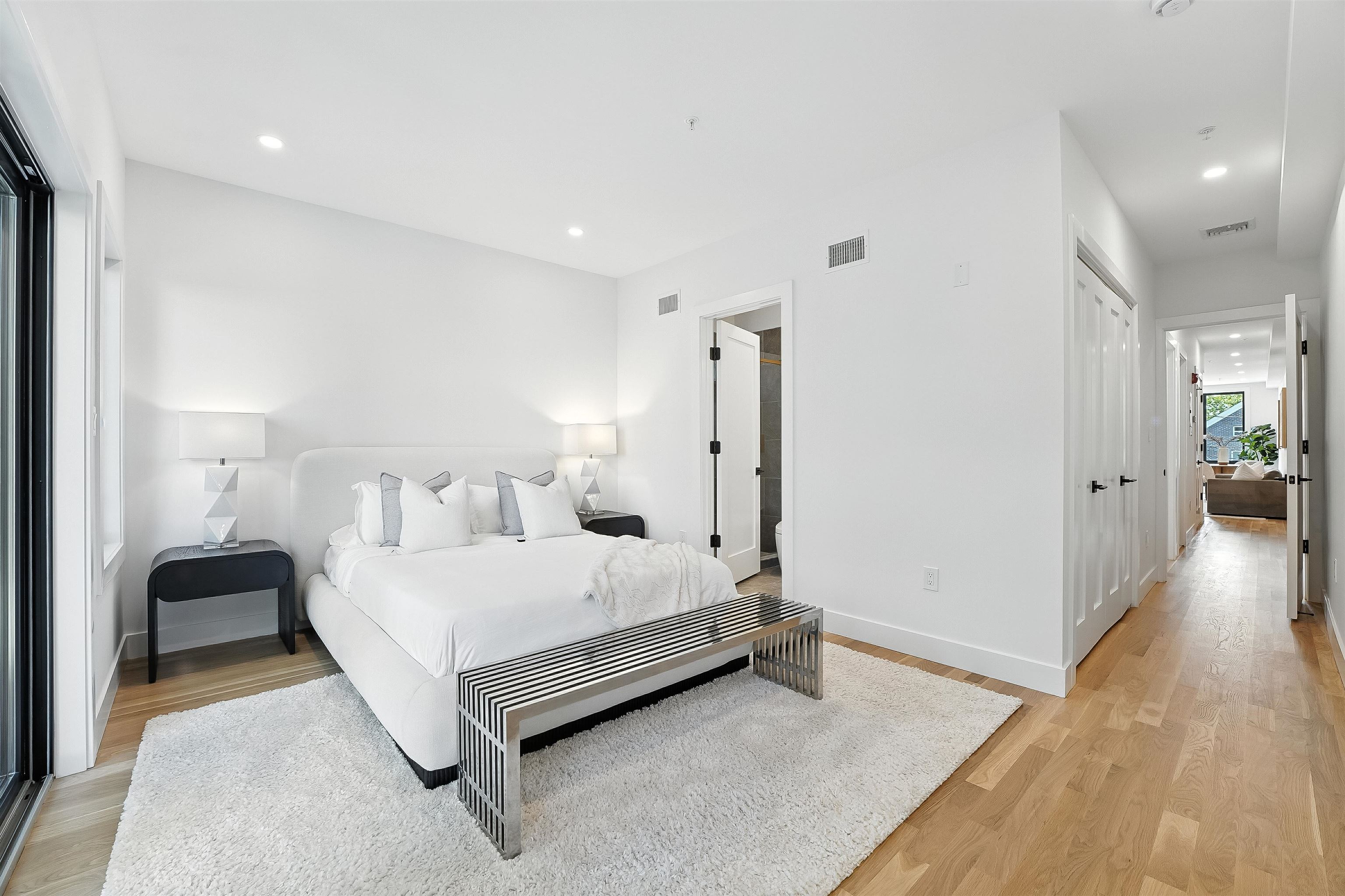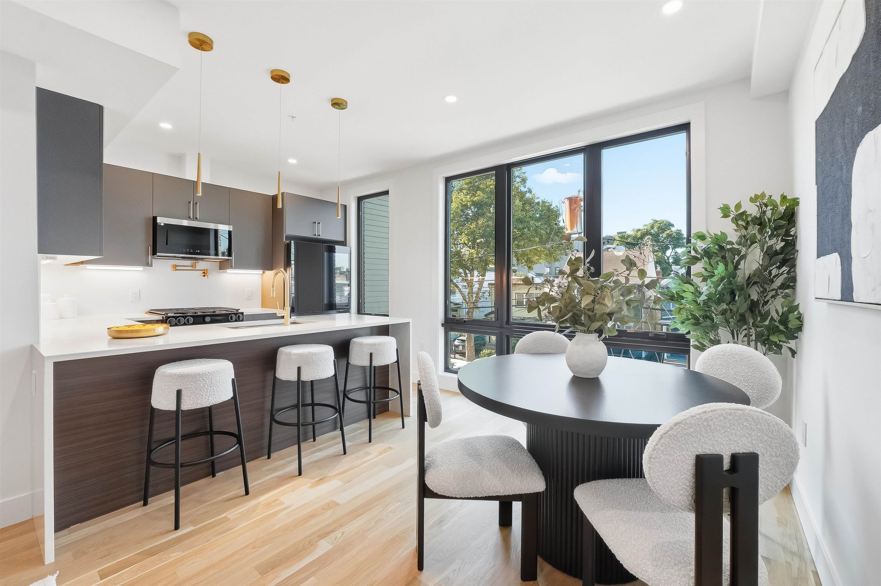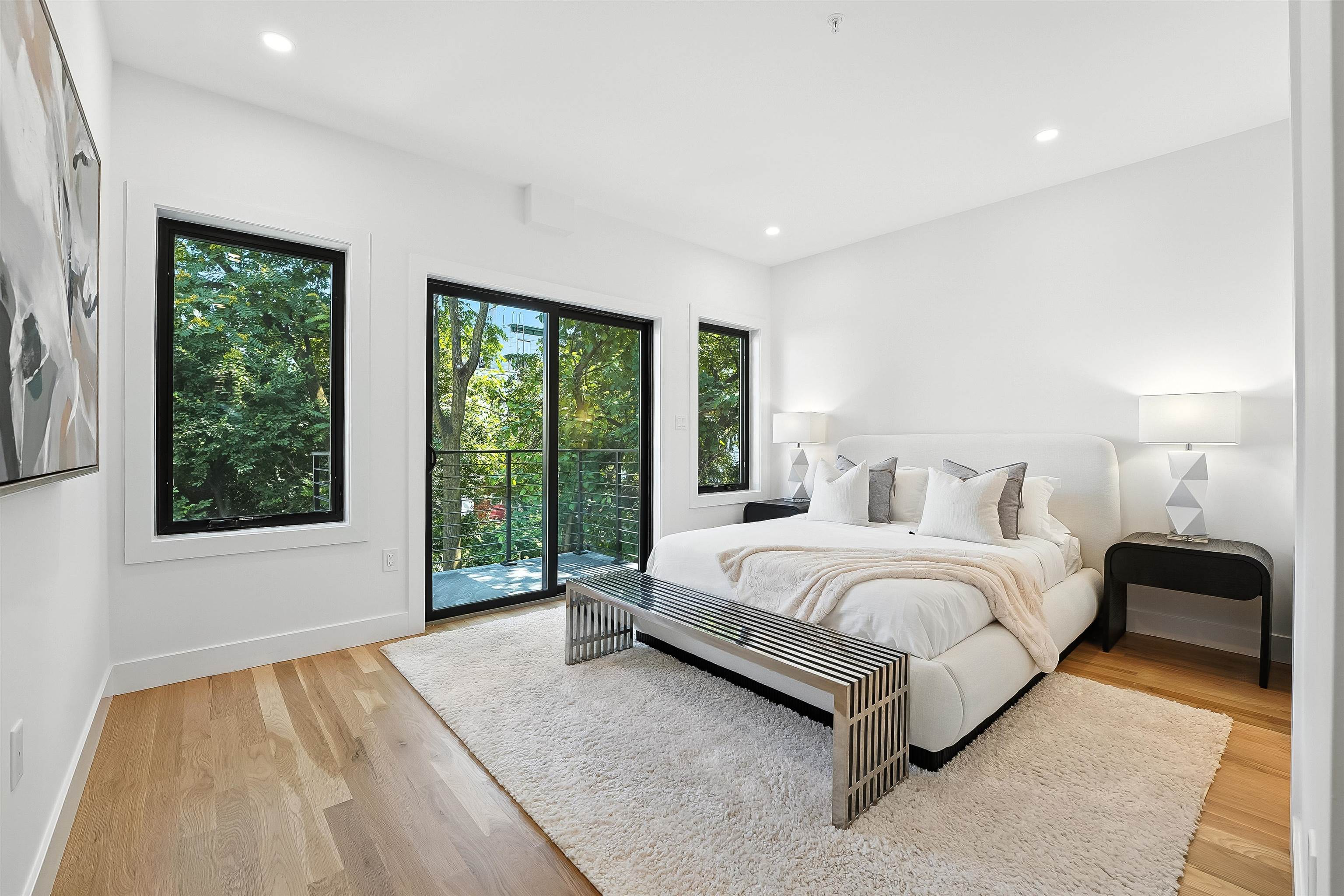 EXCEPTIONAL VALUE AND INCREDIBLE OPPORTUNITY with one year of off-site parking prepaid and a five-year tax abatement approved. Situated in the heart of the highly desirable Jersey City Heights, this meticulously rebuilt boutique building offers a limited collection of three distinctive residences, seamlessly blending elevated design with modern functionality. This sun-drenched 3-bedroom, 2-bath home showcases refined finishes and thoughtful design throughout. A classic red brick façade with bold black accents delivers standout curb appeal, while the interior features high ceilings, solid white oak flooring, recessed lighting, and floor-to-ceiling windows that flood the space with natural light. At the heart of the home, the chef’s kitchen makes a bold statement with sleek two-tone cabinetry, quartz waterfall countertops and full-height backsplash, a pot filler, and a full suite of top-of-the-line smart Samsung appliances. Designed for both everyday living and effortless entertaining, the space balances style and functionality with ease. The primary suite features double closets and an en-suite bath with double vanities, designer fixtures, and a high-end smart toilet. Step out onto your private balcony and enjoy the tranquil setting—perfect for morning coffee or an evening drink, offering a personal escape from the bustle of city life. Two additional bedrooms provide flexibility for children, guests, or a home office, served by a stylish full bathroom. Built for efficiency and modern comfort, the home includes spray foam insulation and smart home upgrades such as a Honeywell thermostat, Ring doorbell, keyless entry, and Wi-Fi–enabled appliances. A private 9’ x 5’ storage room on the lower level provides convenient space for bikes, strollers, and seasonal items. NYC access is seamless via the NJ-119 bus to Midtown, Citibike or the NJ-83 bus to the Journal Square PATH, or an easy 10-minute walk to the station. Enjoy a vibrant neighborhood with popular cafes, restaurants, and shops, along with nearby parks featuring walking trails, sports fields, playgrounds, an ice rink, and a seasonal heated pool.