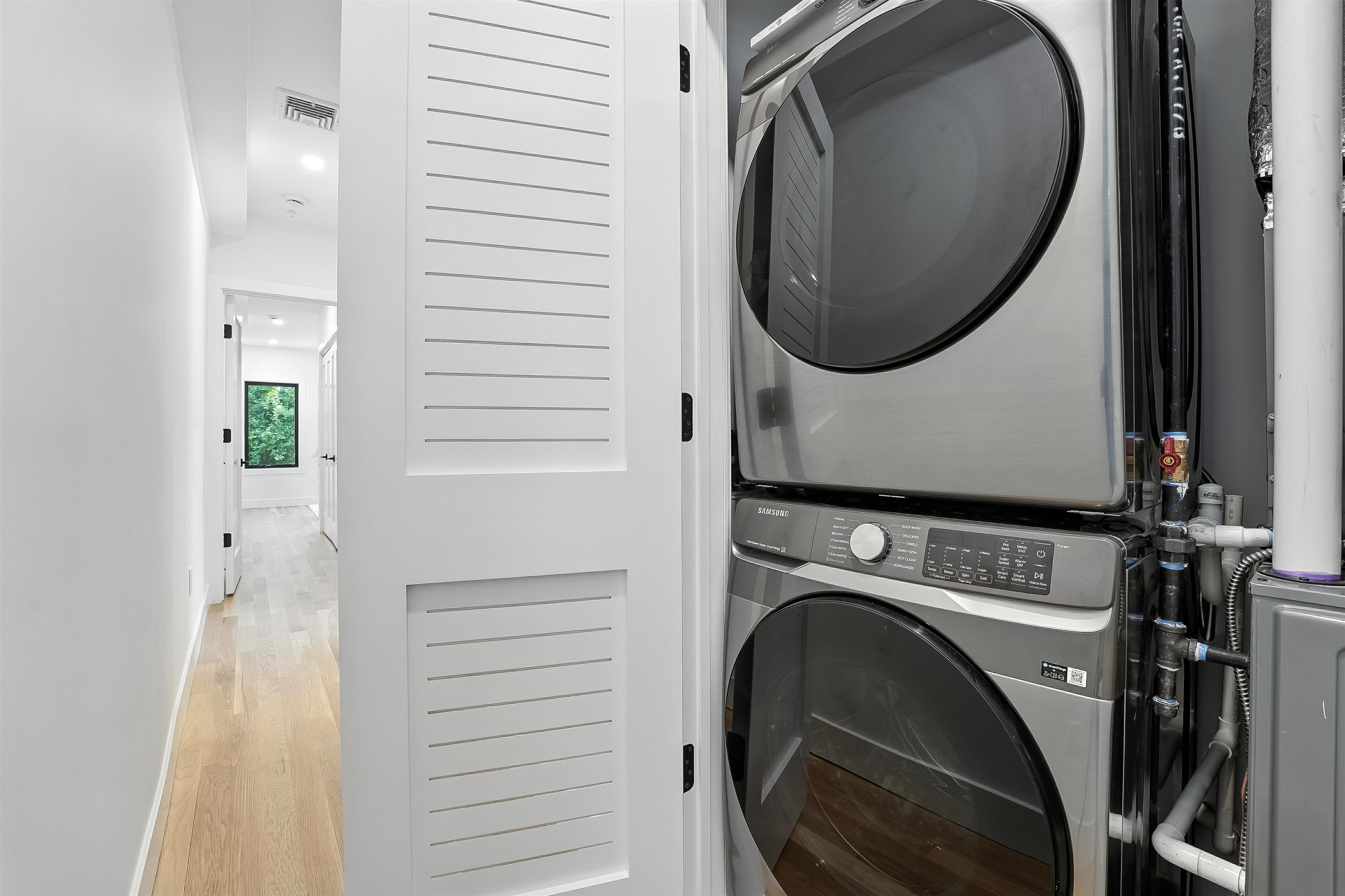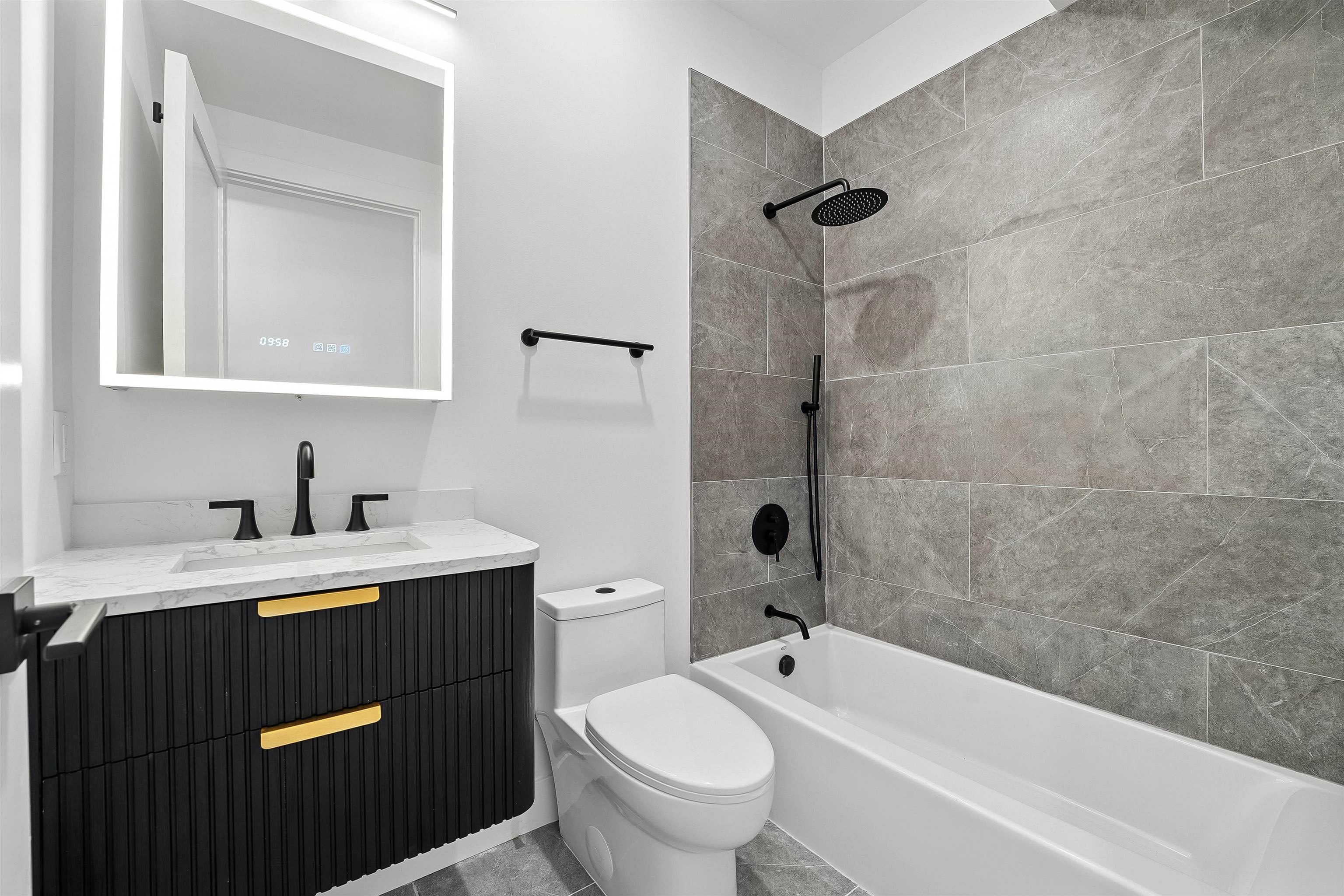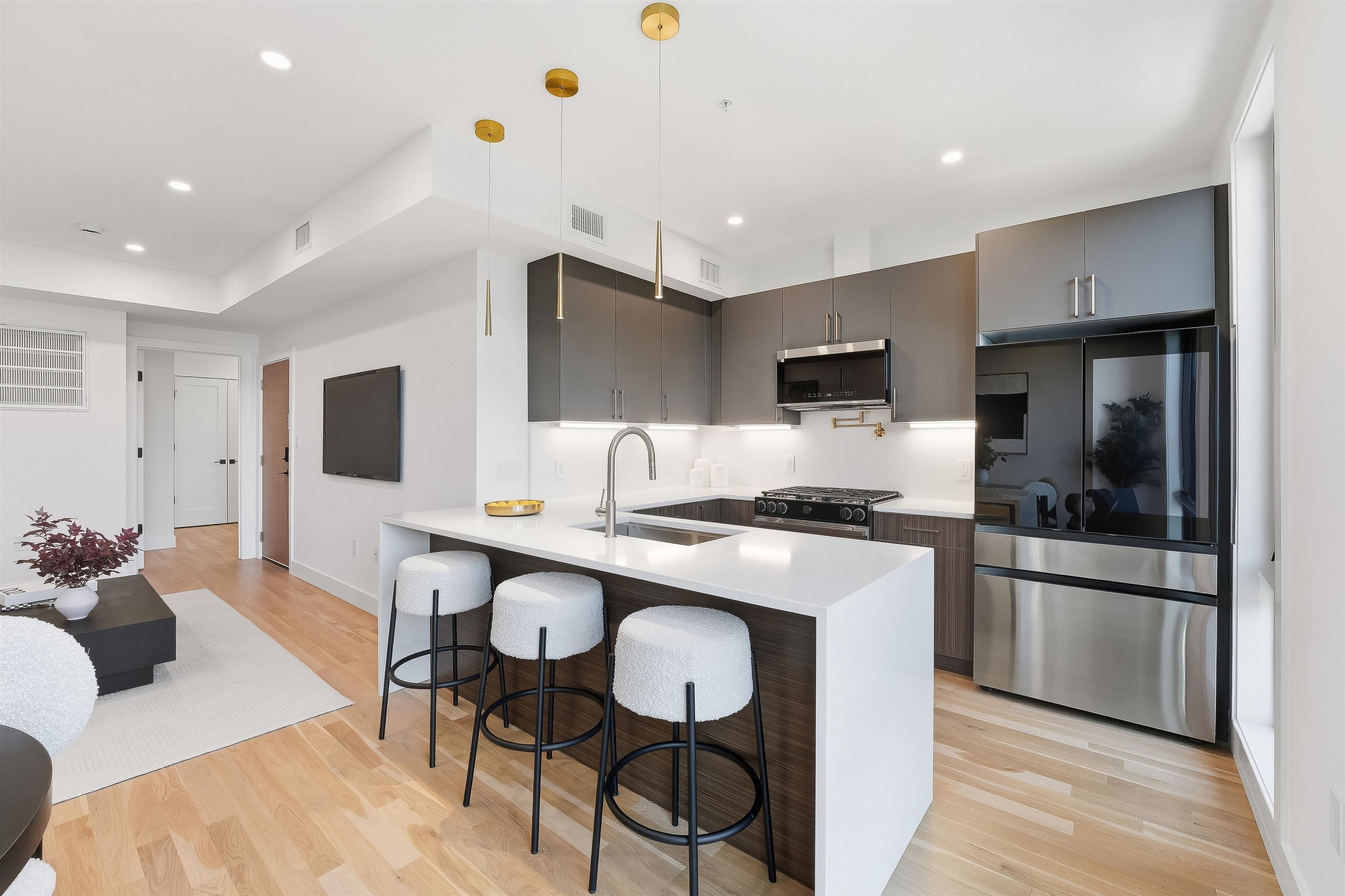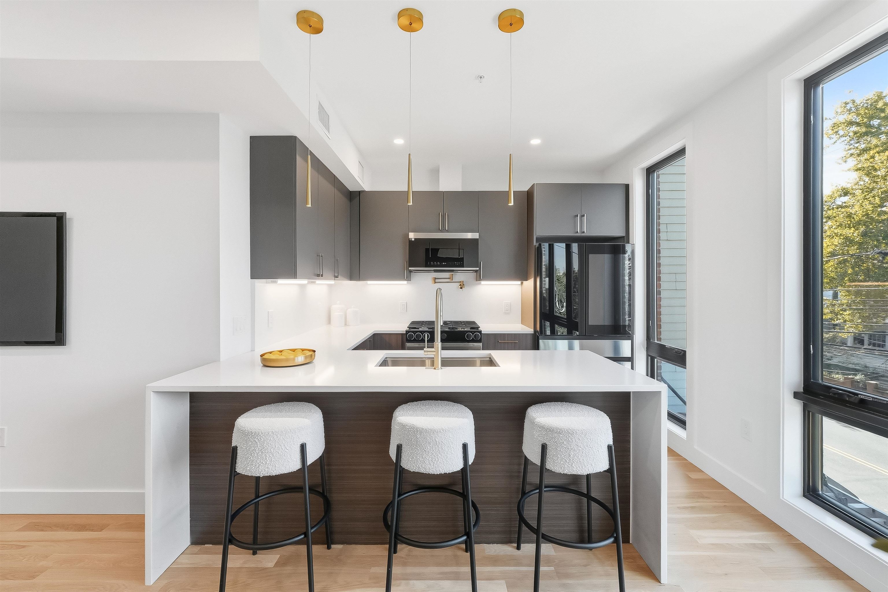 EXCEPTIONAL VALUE AND INCREDIBLE OPPORTUNITY with one year of off-site parking prepaid and a five-year tax abatement approved. Situated in the heart of the highly desirable Jersey City Heights, this meticulously rebuilt boutique building offers a limited collection of three distinctive residences, seamlessly blending elevated design with modern functionality. This sun-drenched 3-bedroom, 2-bath home showcases refined finishes and thoughtful design throughout. A classic red brick façade with bold black accents delivers standout curb appeal, while the interior features high ceilings, solid white oak flooring, recessed lighting, and floor-to-ceiling windows that flood the space with natural light. At the heart of the home, the chef’s kitchen makes a bold statement with sleek two-tone cabinetry, quartz waterfall countertops and full-height backsplash, a pot filler, and a full suite of top-of-the-line smart Samsung appliances. Designed for both everyday living and effortless entertaining, the space balances style and functionality with ease. The primary suite features double closets and an en-suite bath with double vanities, designer fixtures, and a high-end smart toilet. Step out onto your private balcony and enjoy the tranquil setting—perfect for morning coffee or an evening drink, offering a personal escape from the bustle of city life. Two additional bedrooms provide flexibility for children, guests, or a home office, served by a stylish full bathroom. Built for efficiency and modern comfort, the home includes spray foam insulation and smart home upgrades such as a Honeywell thermostat, Ring doorbell, keyless entry, and Wi-Fi–enabled appliances. A private 9’ x 5’ storage room on the lower level provides convenient space for bikes, strollers, and seasonal items. NYC access is seamless via the NJ-119 bus to Midtown, Citibike or the NJ-83 bus to the Journal Square PATH, or an easy 10-minute walk to the station. Enjoy a vibrant neighborhood with popular cafes, restaurants, and shops, along with nearby parks featuring walking trails, sports fields, playgrounds, an ice rink, and a seasonal heated pool.