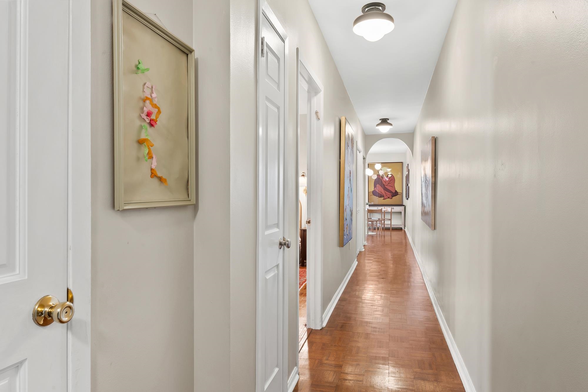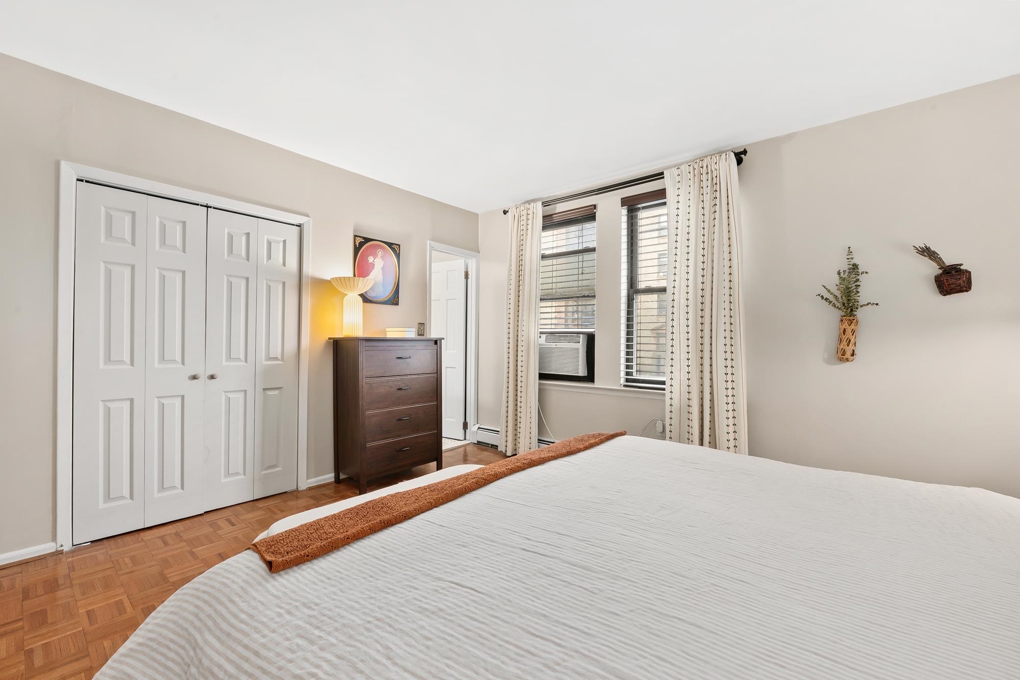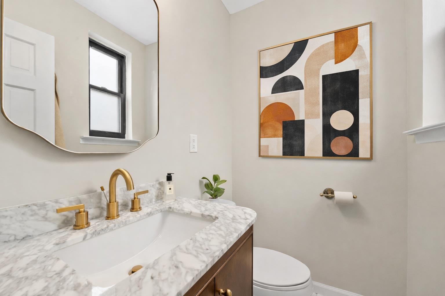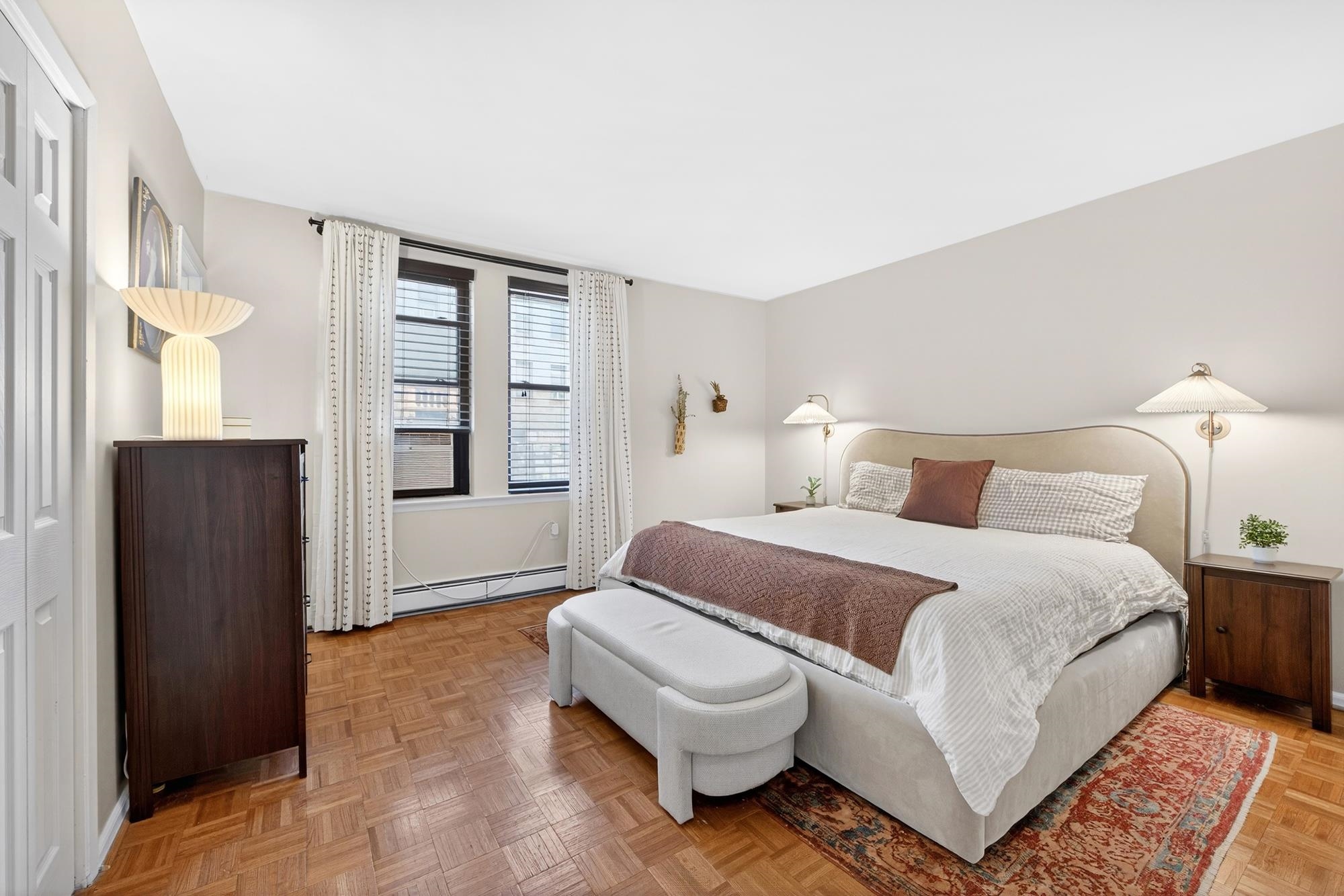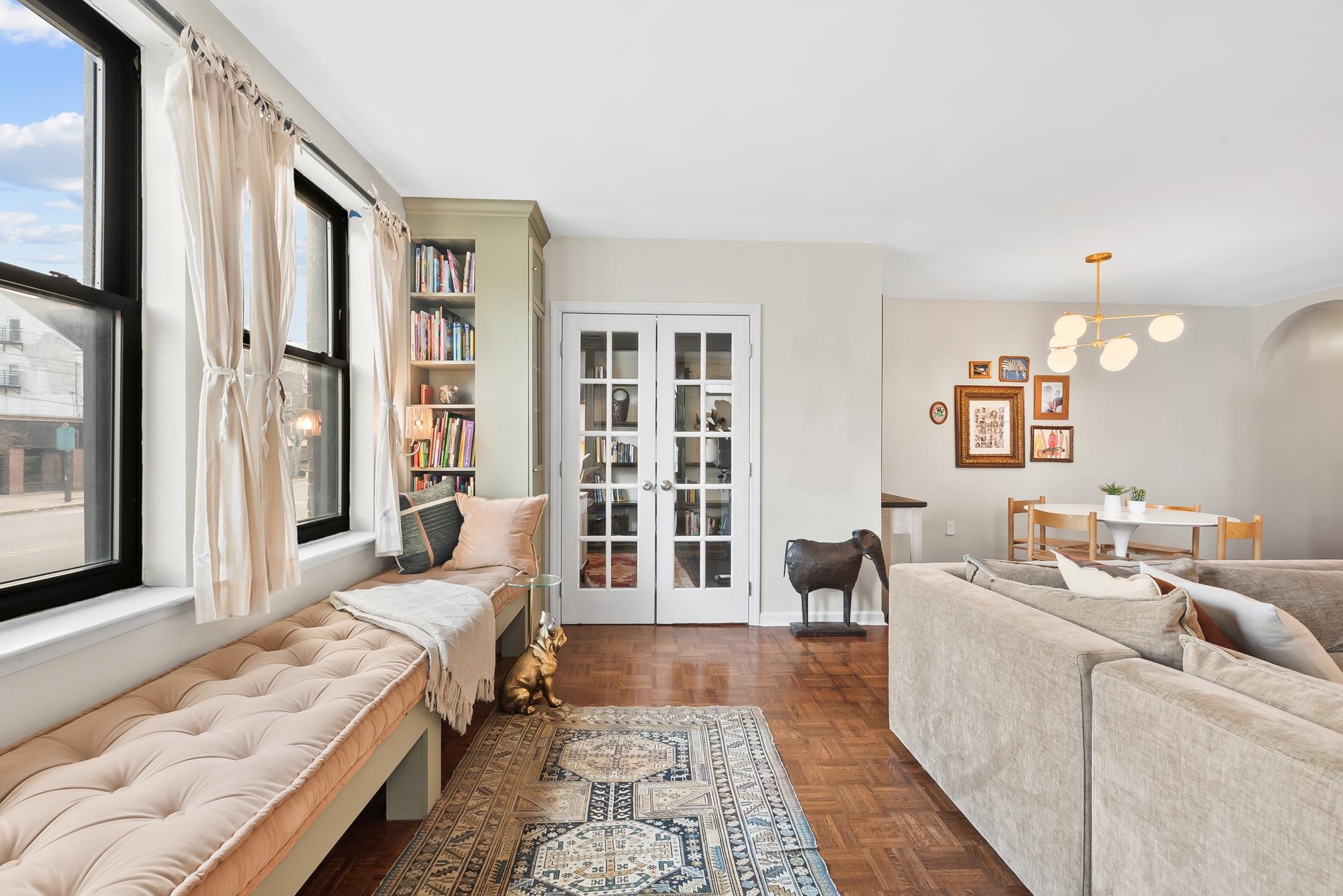 Move right into this expertly designed 3 bedroom (or 2 + den) corner home at the Summit, a grand pre-war building just 2 blocks from Journal Square Path. Masterfully updated by the interior designer-homeowner, this 1200 sq ft condo features oversized living and dining areas, ideal for entertaining, an inviting custom window seat, and floor to ceiling cabinetry. The stunning open kitchen has striking quartzite countertops / breakfast bar and custom 10’’deep quartzite slab sink, with updated stainless appliances, and white shaker cabinetry. The tranquil and generous primary bedroom features a large closet and an en-suite updated bath with new vanity, lighting, and medicine cabinet. The second bedroom easily accommodates a queen bed. The full bath is also newly renovated, with new vanity, medicine cabinet, lighting, and wainscoting. The office / den / 3rd bedroom with French doors, built-in bookcase and new lighting has multiple uses. Custom, thoughtful design touches added throughout: gallery hall entry with custom entry closet and lighting, additional closets, tasteful arches, cabinetry and storage. Original parquet floors. The HOA includes heat, hot & cold water, and cooking gas. The Summit includes many amenities: doorman, elevator, gym, sauna, storage, laundry room, and secure package room. Residences are offered gated assigned parking (currently $180/month). Centrally located for ease of commuting: 2 blocks from the Journal Square PATH, where you'll pass the brand-new Target, and convenient NYC bus just outside the building. Enjoy the nearby restaurants, grocery stores, and Lincoln Park.