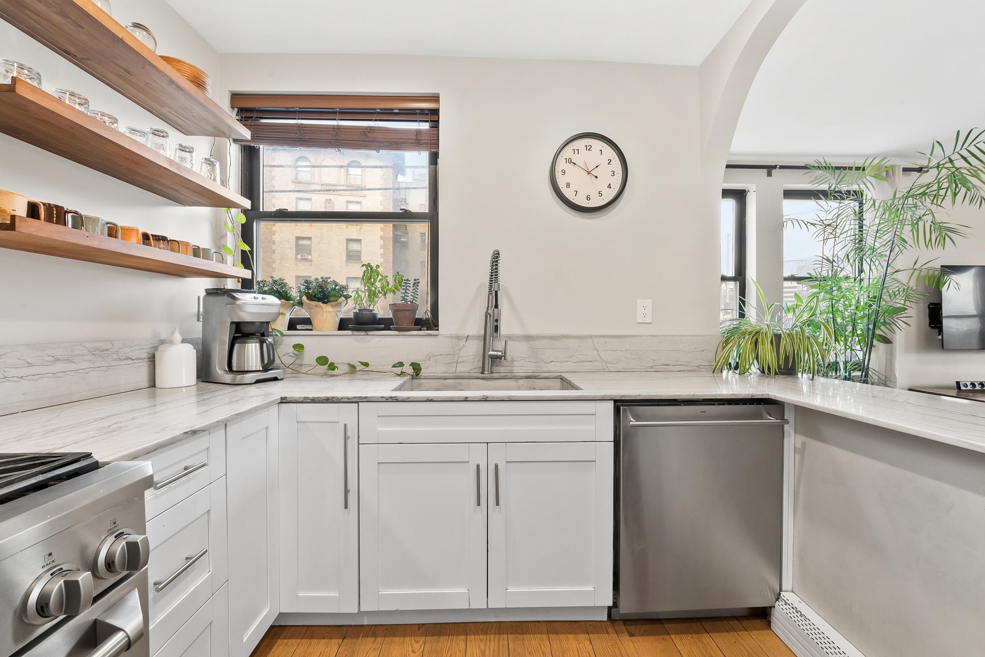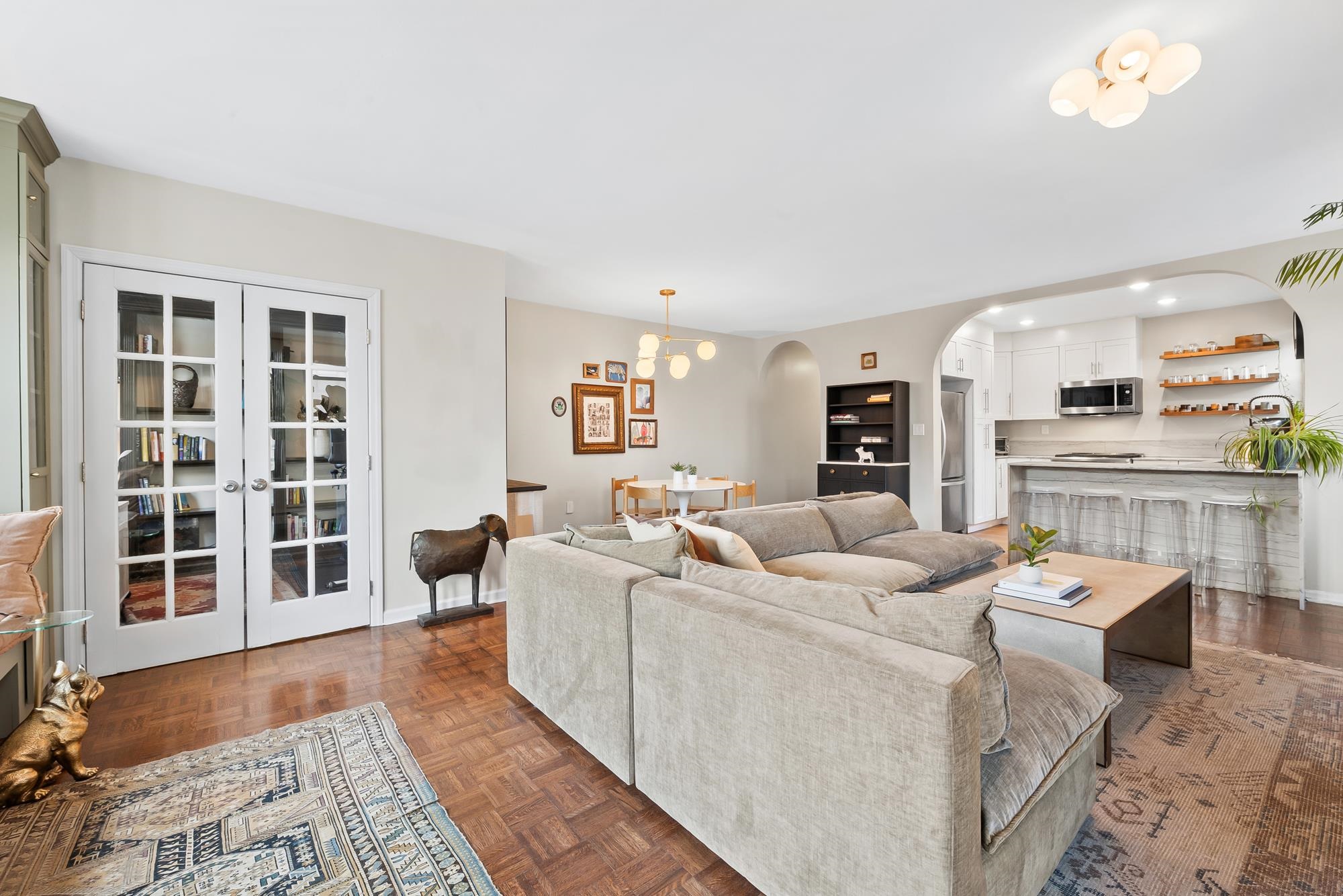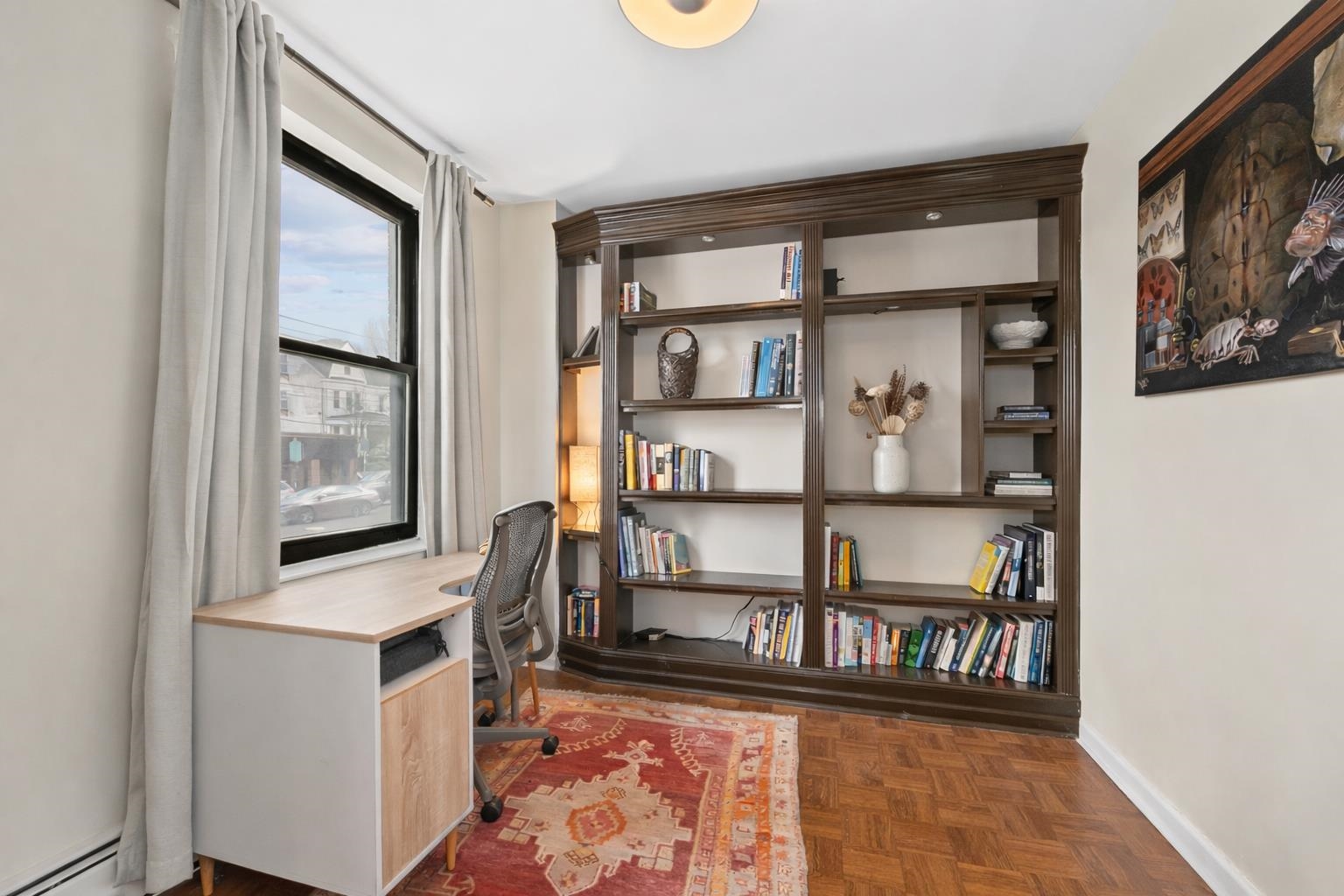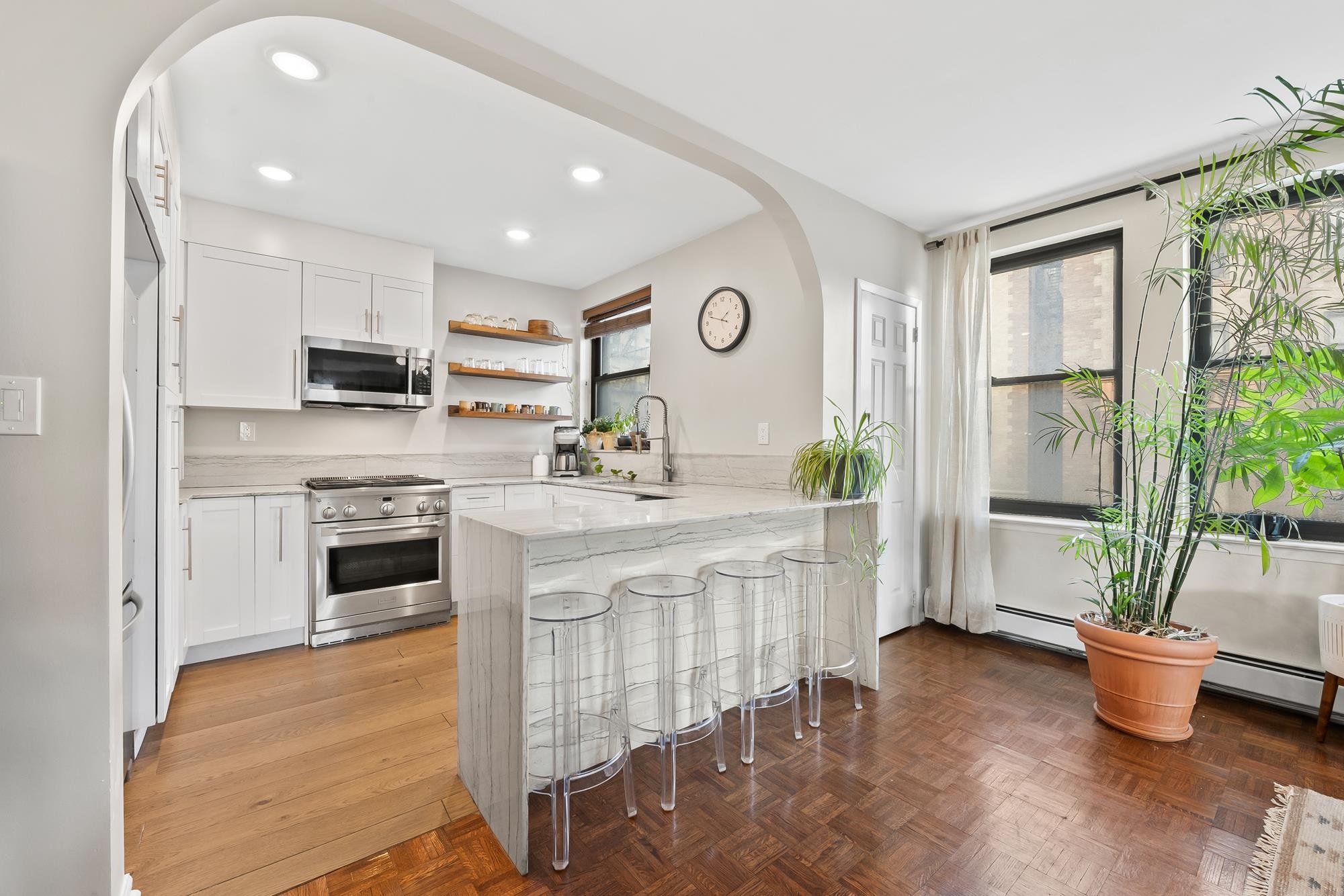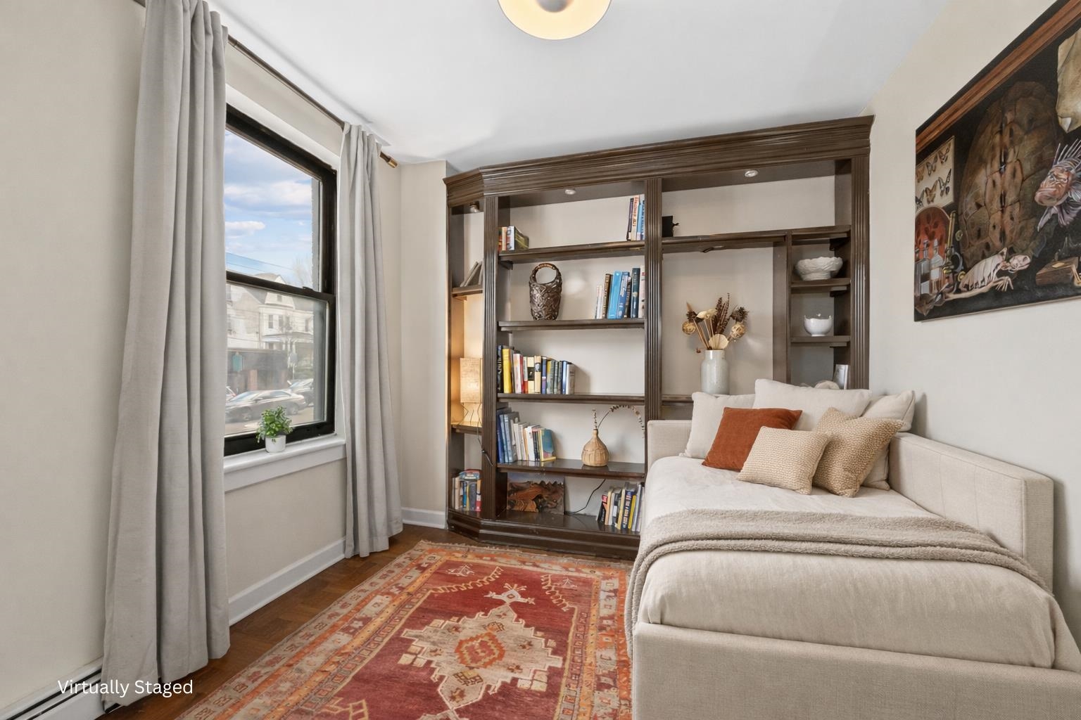Move right into this expertly designed 3 bedroom (or 2 + den) corner home at the Summit, a grand pre-war building just 2 blocks from Journal Square Path. Masterfully updated by the interior designer-homeowner, this 1200 sq ft condo features oversized living and dining areas, ideal for entertaining, an inviting custom window seat, and floor to ceiling cabinetry. The stunning open kitchen has striking quartzite countertops / breakfast bar and custom 10’’deep quartzite slab sink, with updated stainless appliances, and white shaker cabinetry. The tranquil and generous primary bedroom features a large closet and an en-suite updated bath with new vanity, lighting, and medicine cabinet. The second bedroom easily accommodates a queen bed. The full bath is also newly renovated, with new vanity, medicine cabinet, lighting, and wainscoting. The office / den / 3rd bedroom with French doors, built-in bookcase and new lighting has multiple uses. Custom, thoughtful design touches added throughout: gallery hall entry with custom entry closet and lighting, additional closets, tasteful arches, cabinetry and storage. Original parquet floors. The HOA includes heat, hot & cold water, and cooking gas. The Summit includes many amenities: doorman, elevator, gym, sauna, storage, laundry room, and secure package room. Residences are offered gated assigned parking (currently $180/month). Centrally located for ease of commuting: 2 blocks from the Journal Square PATH, where you'll pass the brand-new Target, and convenient NYC bus just outside the building. Enjoy the nearby restaurants, grocery stores, and Lincoln Park.