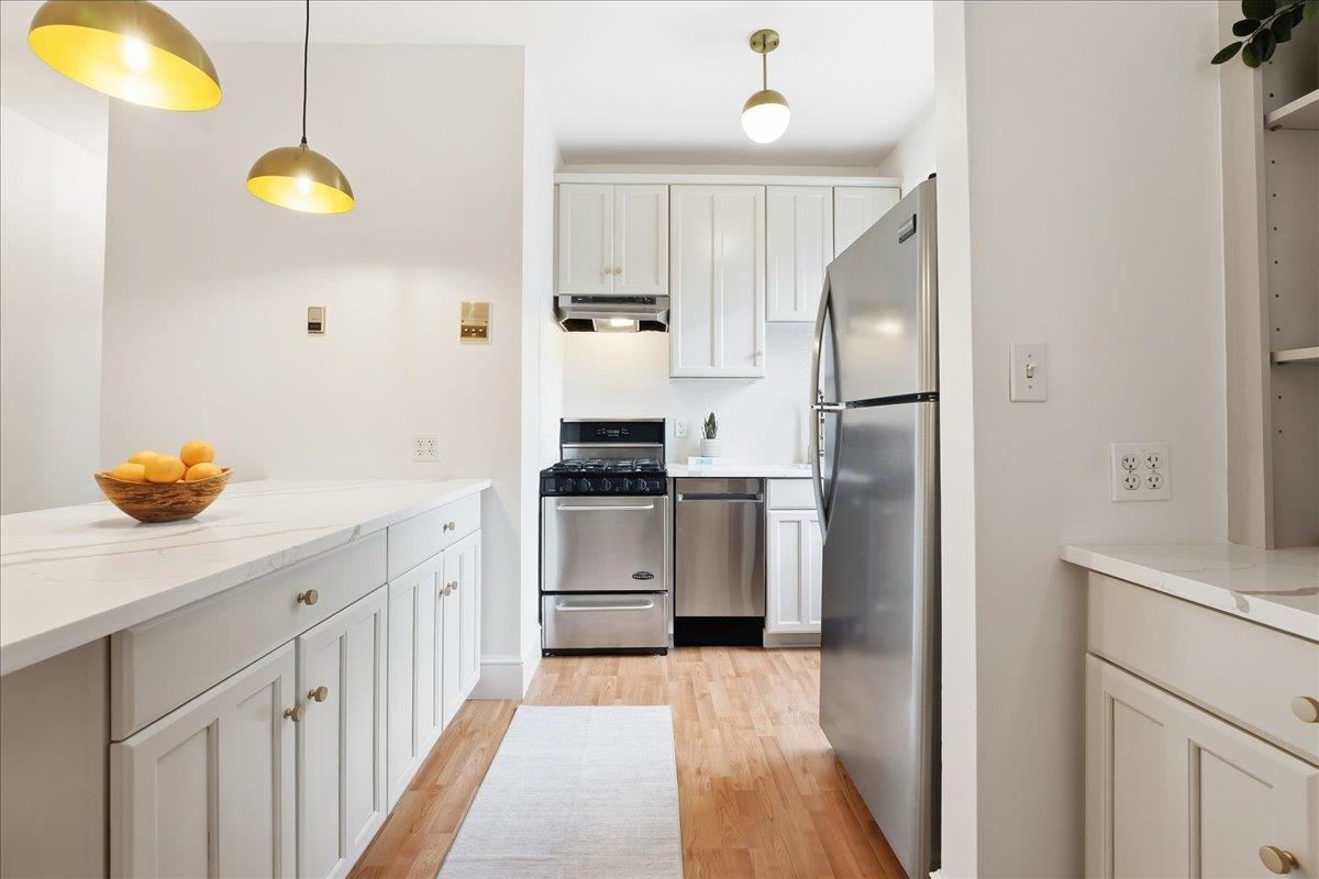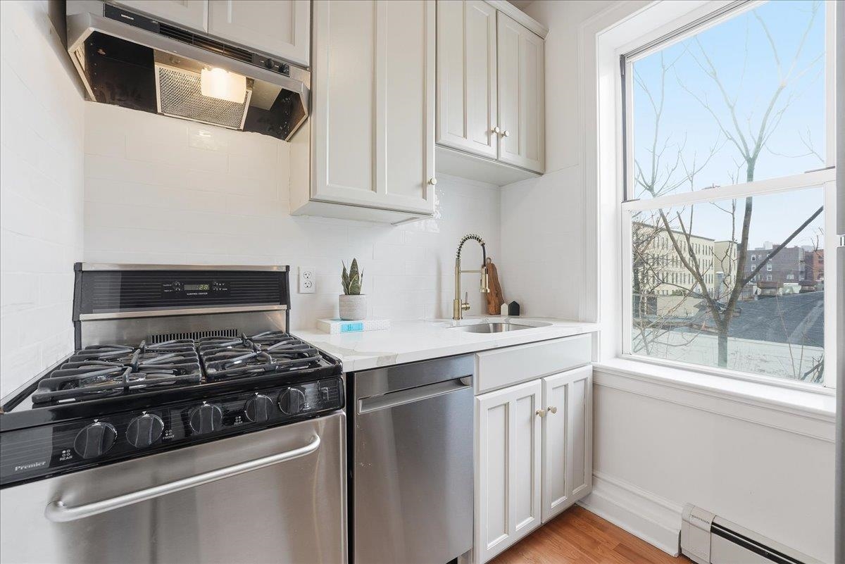 Don’t miss this newly updated beautiful corner 1BR/1Bath home offering 747 sq ft of comfortable living space in a prime Hoboken location. Large windows, abundant natural light, spacious living / dining area perfect for entertaining, and great storage throughout. The renovated kitchen is equipped with stainless steel appliances, quartz countertops, ample cabinetry, and a breakfast bar. The large bedroom offers two generous closets and is adjacent to the bathroom featuring subway tile and a shower over the bathtub. This unit comes with dedicated storage and shared laundry facilities and is ideally situated near transportation, parks, shopping, and dining, making it an excellent opportunity for convenient and modern city living.