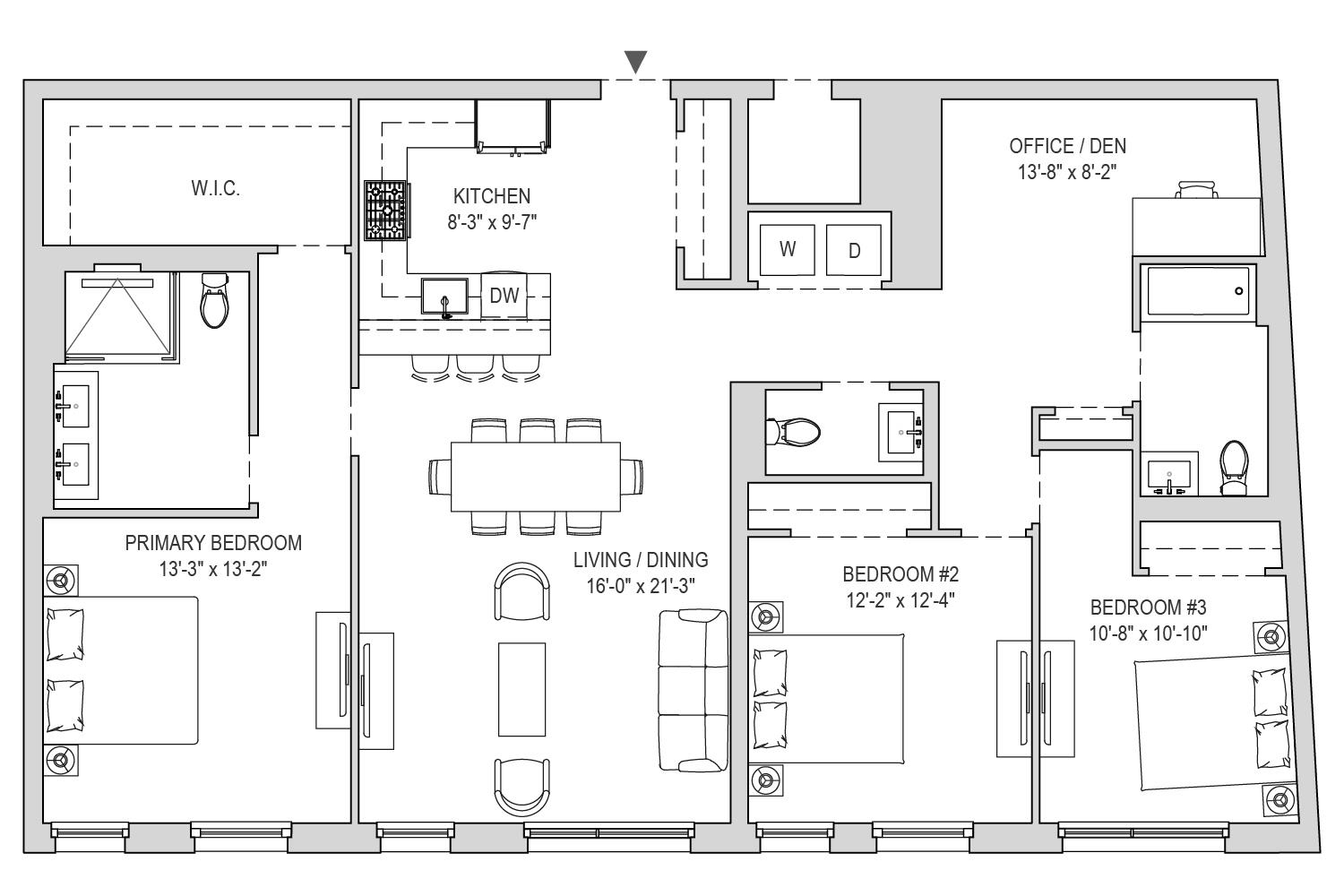 Experience elevated urban living with Residence 8B at Vista Pointe at Port Imperial, West New York’s newest premier condominium community. This thoughtfully designed 1771 sq. ft. three-bedroom, two-and-a-half-bathroom home blends modern form with refined function. Expansive east-facing windows offer direct views of NYC. White oak floors and 9' ceilings create a lofty feeling throughout. The home also offers a sizable den. The open-concept kitchen effortlessly integrates the living and dining areas and is appointed with custom painted matte gray cabinetry, quartz countertops, and Bosch and Thermador appliances – including a gas stove. The home includes a full-sized Whirlpool washer and dryer. The primary suite offers a peaceful retreat, featuring a spacious layout with a walk-in closet and a spa-inspired ensuite bathroom with dual custom vanities, Kohler fixtures, and elegant porcelain tile accents. The auxiliary bathrooms offer custom vanities with quartz countertops and porcelain tile floors. Located at 8 Avenue at Port Imperial on the Hudson River waterfront-- with the New York City skyline as a backdrop-- the 9-story building features 73 residences. Homes range from 1- to 4-bedrooms, with many larger homes offering dens. Residents enjoy access to world-class amenities, including an attended lobby, children’s playroom, game room, pet wash, fitness center, steam room & sauna, library, café, maker space, demonstration kitchen, seasonal outdoor pool, outdoor grills, and terraces on the third floor and rooftop. Every home comes with an EV-enabled parking space. Located just moments from the Port Imperial NY Waterway Ferry station, with easy access to the NJ Transit bus to Port Authority NYC, Vista Pointe at Port Imperial offers unparalleled convenience and sophistication.
