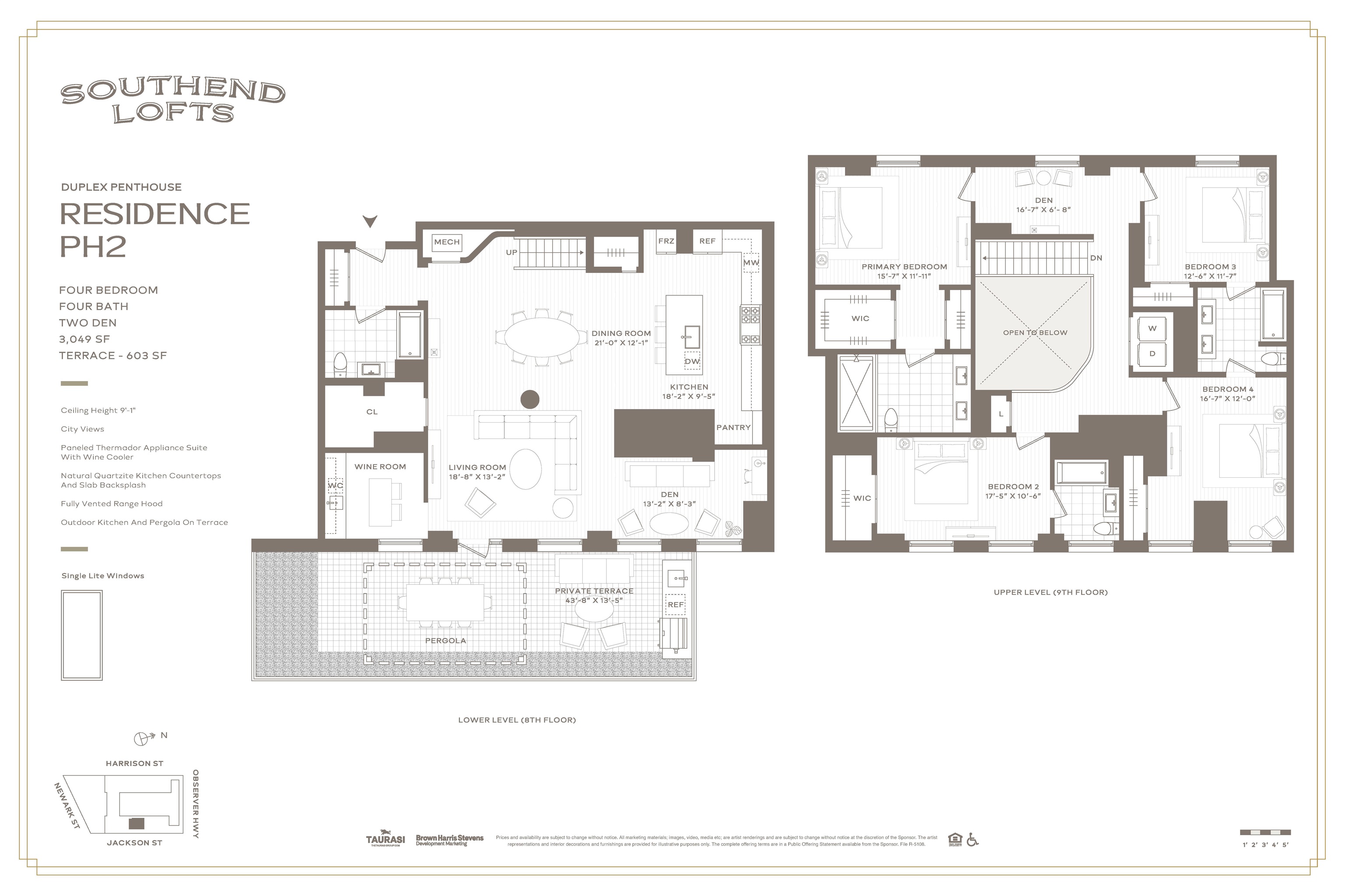 Magnificent 4 Bedroom Penthouse with City Views Penthouse 2 offers 3,049 SF of luxury living with 4 bedrooms, 4 baths, two dens, and a wine room and a fabulous 600+ SF private terrace with retractable pergola and outdoor kitchen with stunning Manhattan skyline views. This dramatic duplex residence features double-height living spaces and oversized windows flooding the home with natural light. The lower level is ideal for entertaining, while the upper level offers four private, serene bedrooms. The penthouse kitchen features white lacquer Shaker-style cabinetry, quartzite countertops and backsplash, satin brass hardware, and a full suite of Thermador appliances, including paneled refrigerator/freezer, wine cooler, gas range, and double ovens. The primary spa-like bathroom features Calacatta Lucca slab walls, freestanding soaking tub, glass-enclosed shower with black onyx fixtures, and a custom floating vanity. Secondary baths are flawlessly designed with porcelain tile, walk-in showers, floating vanities, and Kohler Veil toilets with matte black fixtures throughout. Southend Lofts features 1 - 5 bedroom newly built condominiums offering over 20,000 square feet of amenities including a massive roof garden with incredible Manhattan Views, a 40' pool, BBQ stations, recreation area and lounging, 24 hour attended lobby, fitness center, co-working areas, a Golf and Multi Sports Simulator and Children's Playroom. Indoor parking available at an additional cost. Exclusive Sales and Marketing Agent: Brown Harris Stevens Development Marketing. The complete offering terms are in a Public Offering Statement available from the Sponsor. File R-5108. Equal Housing Opportunity