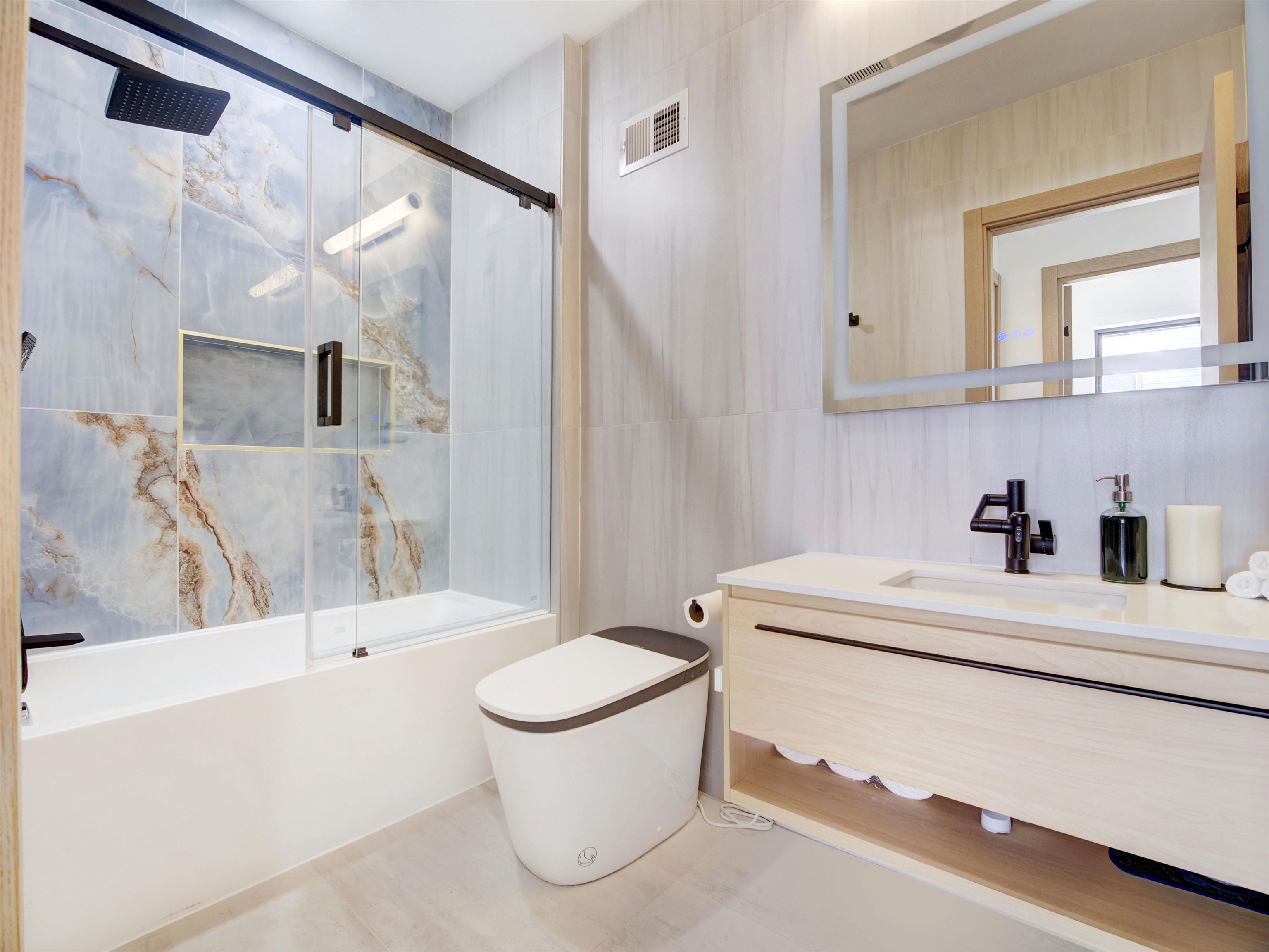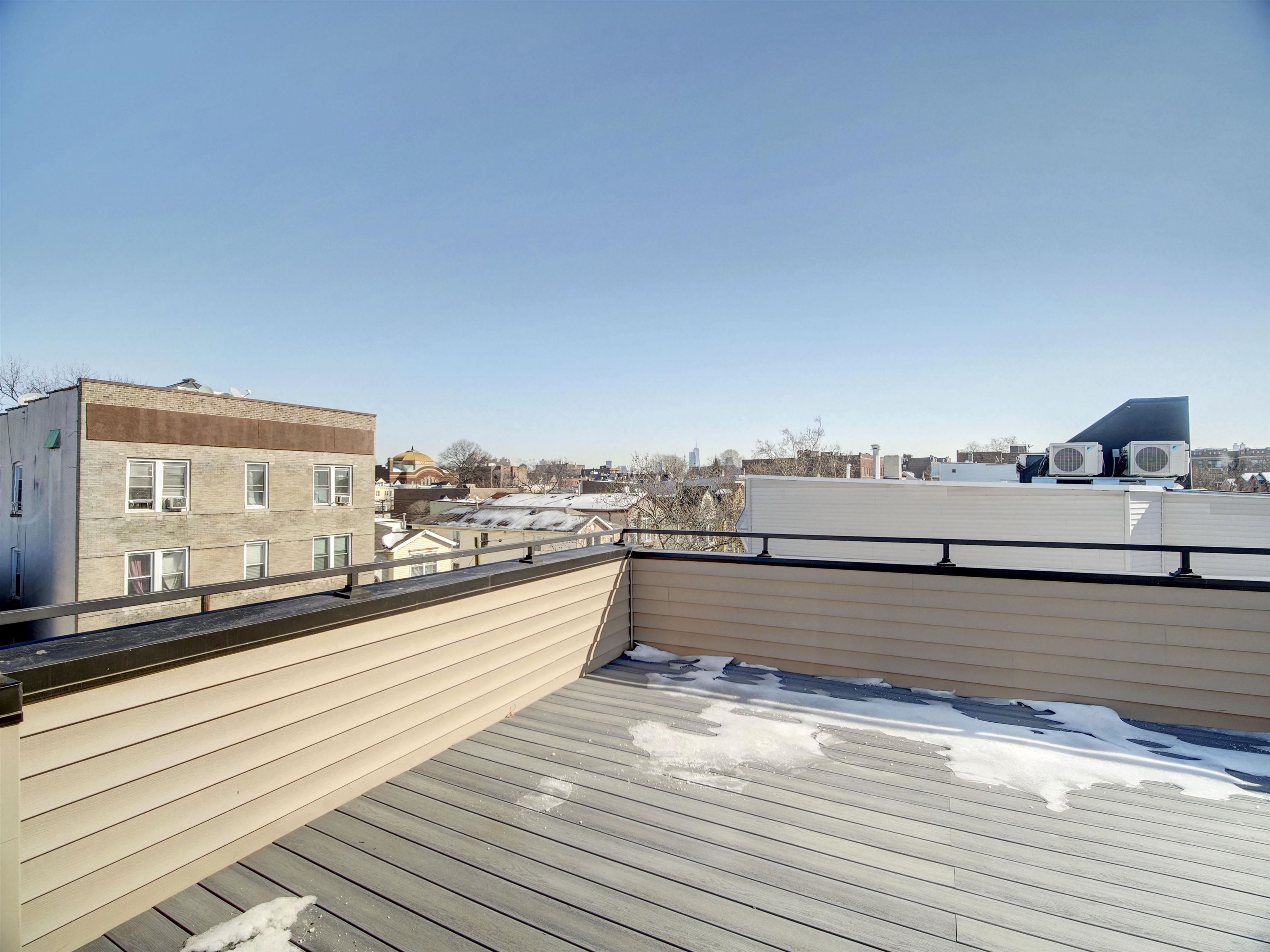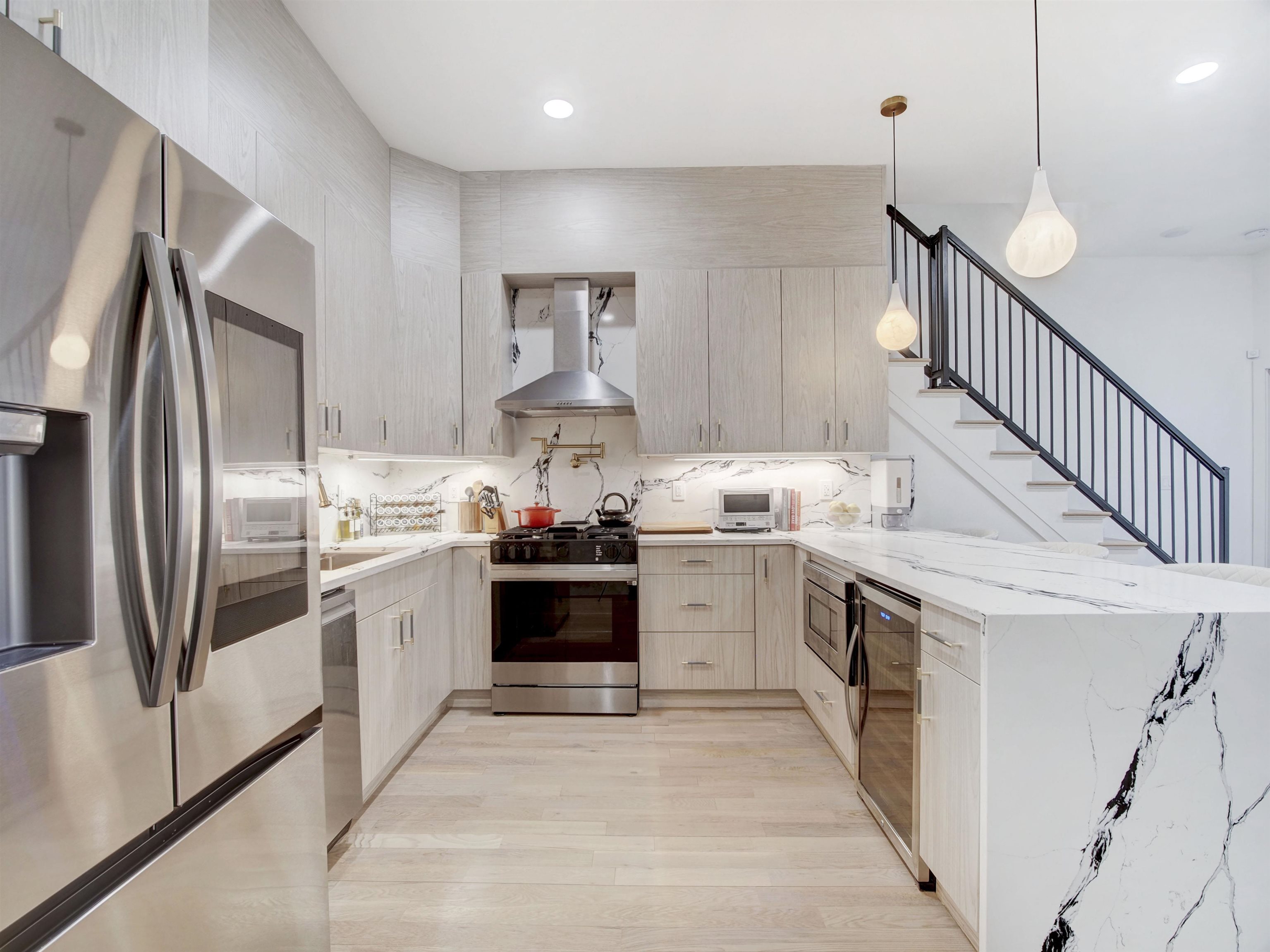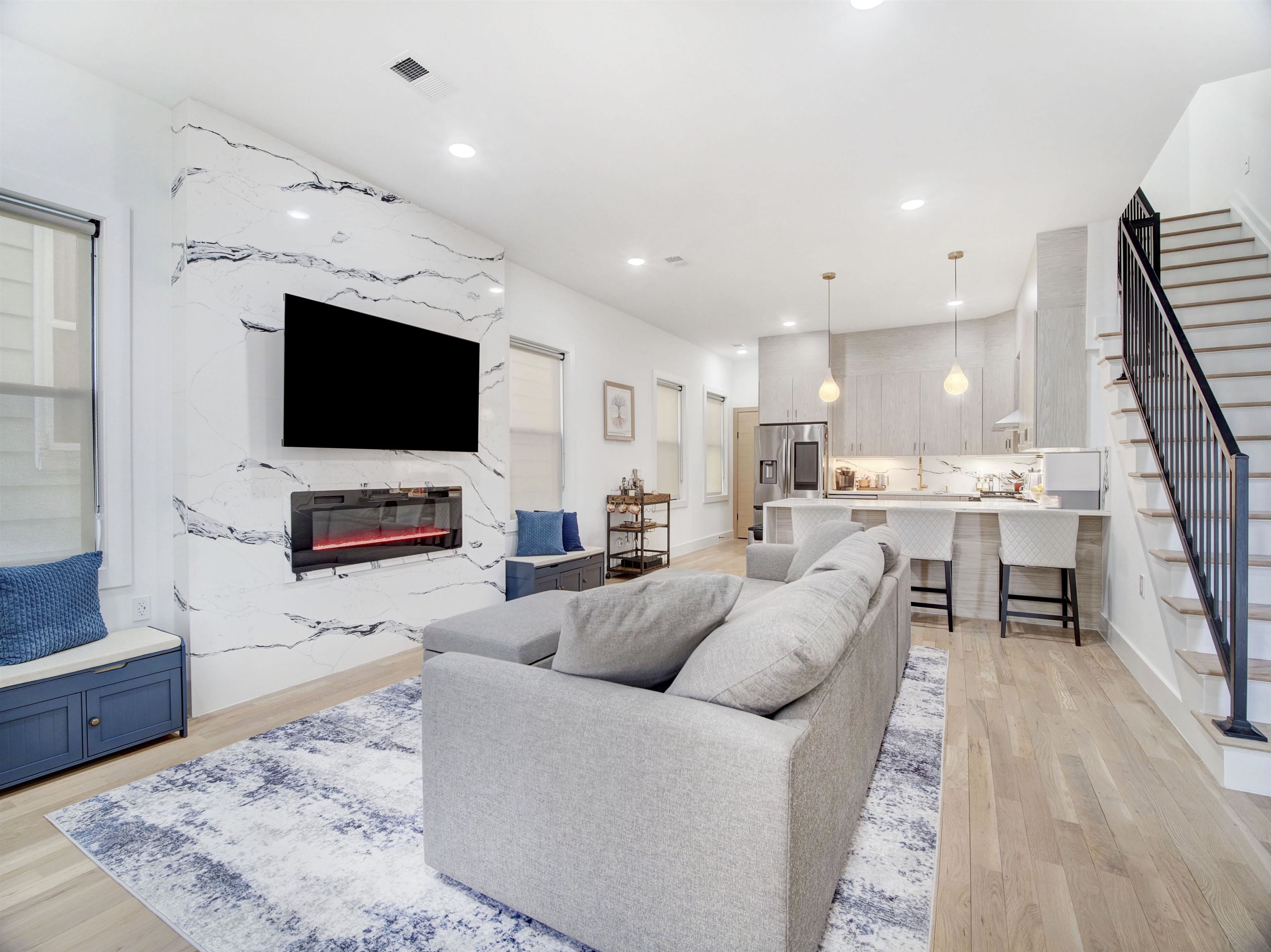 Welcome to this stunning, modern three-bedroom, 2.5-bath luxury condominium designed for elevated living. The sleek chef’s kitchen features state-of-the-art SMART appliances, including a gas range and oven, refrigerator, dishwasher, wine refrigerator, and a convenient pot filler. Sun-filled and open, the living space showcases light-toned hardwood floors and a striking quartz slab feature wall with a marble-like finish, centered around a heated electric fireplace with a mounted TV. The unit is fully wired for a security system and Ring doorbell for added peace of mind. All three bedrooms are located on the second level, highlighted by a spa-inspired primary suite and a secondary bath with a deep soaking tub. Each bathroom offers true luxury with heated floors and smart toilets featuring bidet functionality. Crowning the home is a private rooftop terrace with sweeping panoramic views—an entertainer’s dream complete with an outdoor kitchen and pizza oven, perfect for hosting or relaxing under the open sky.