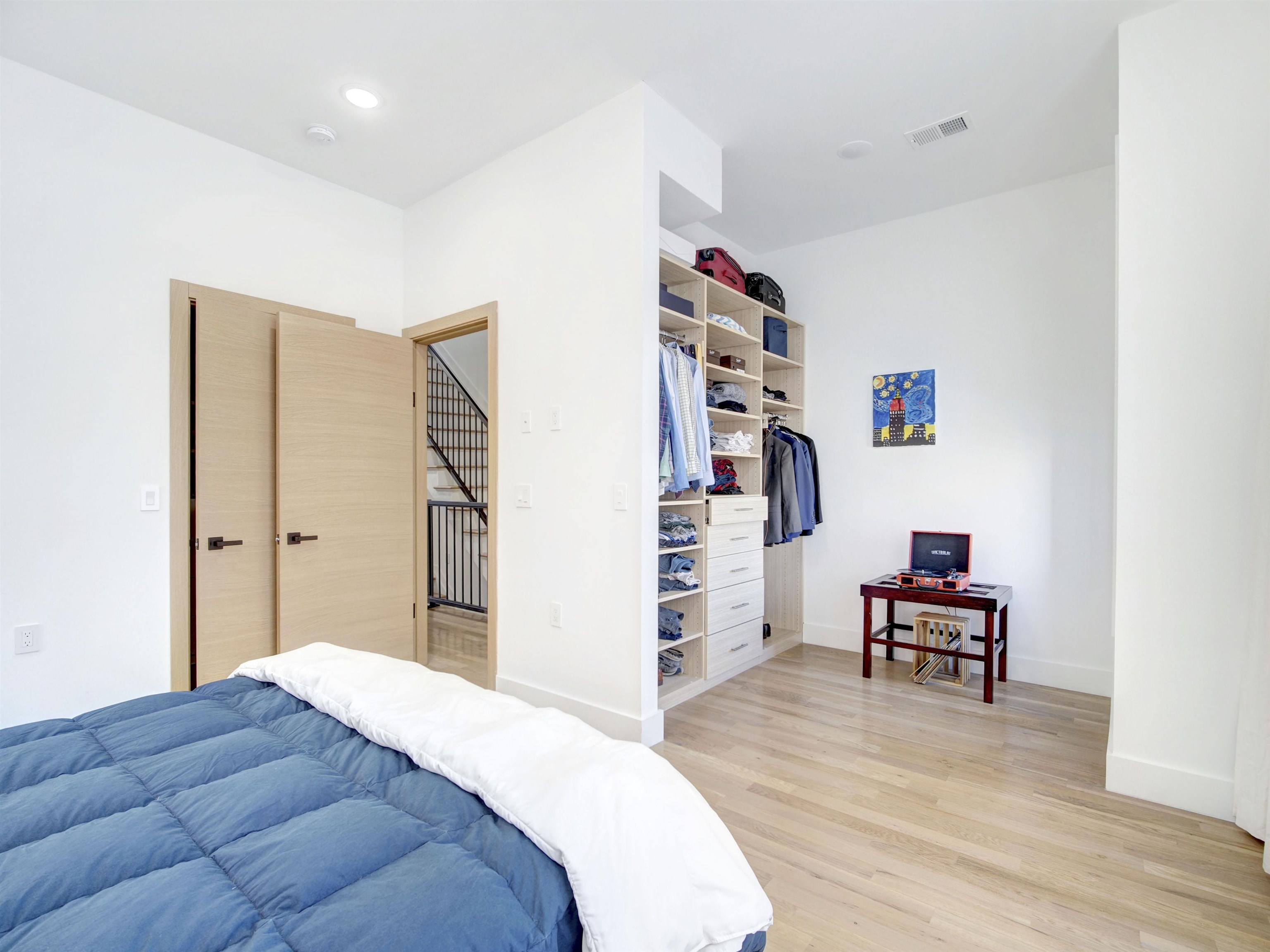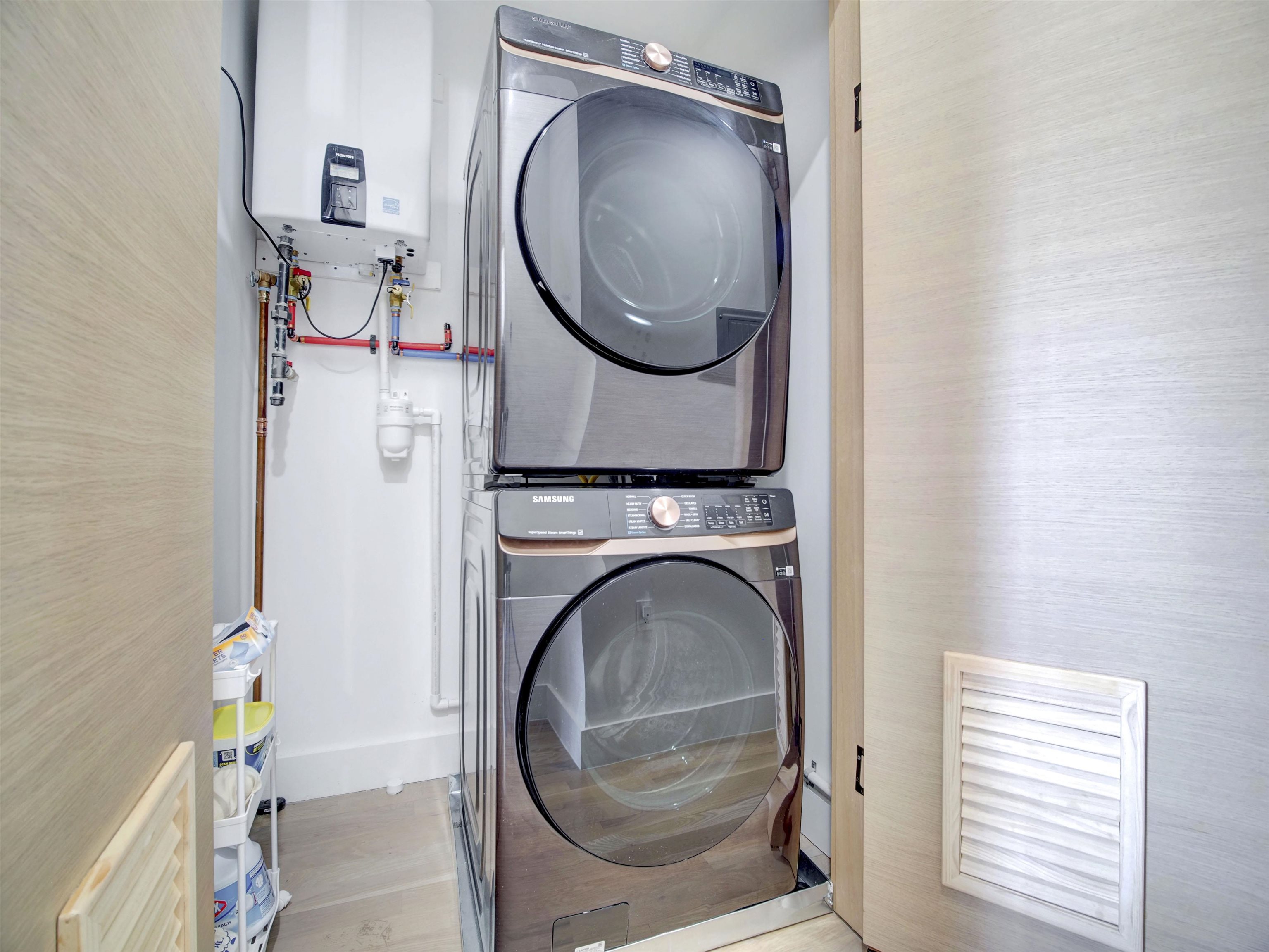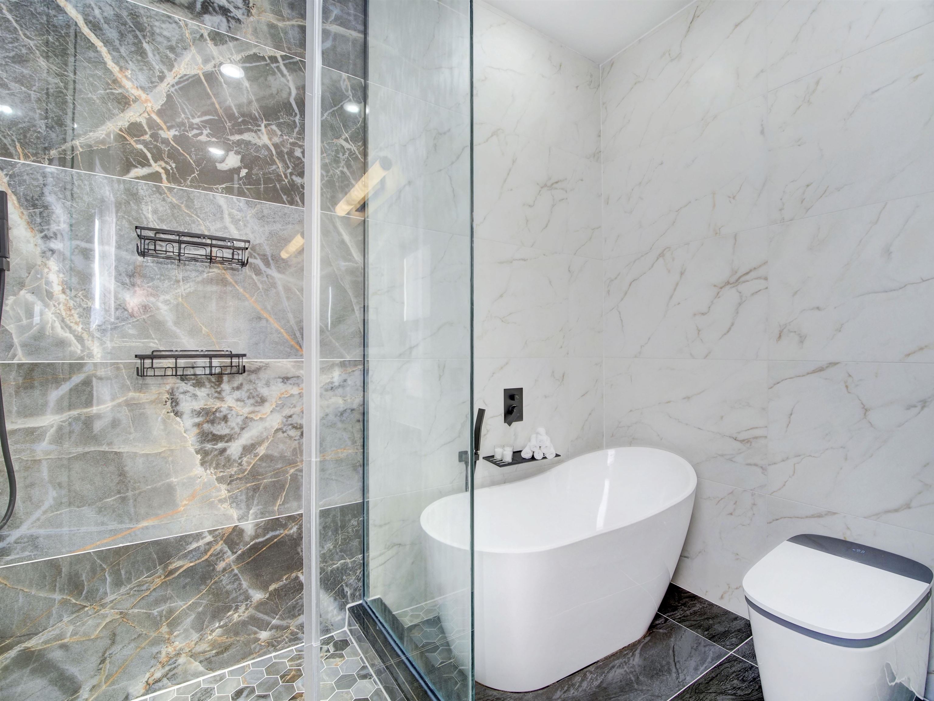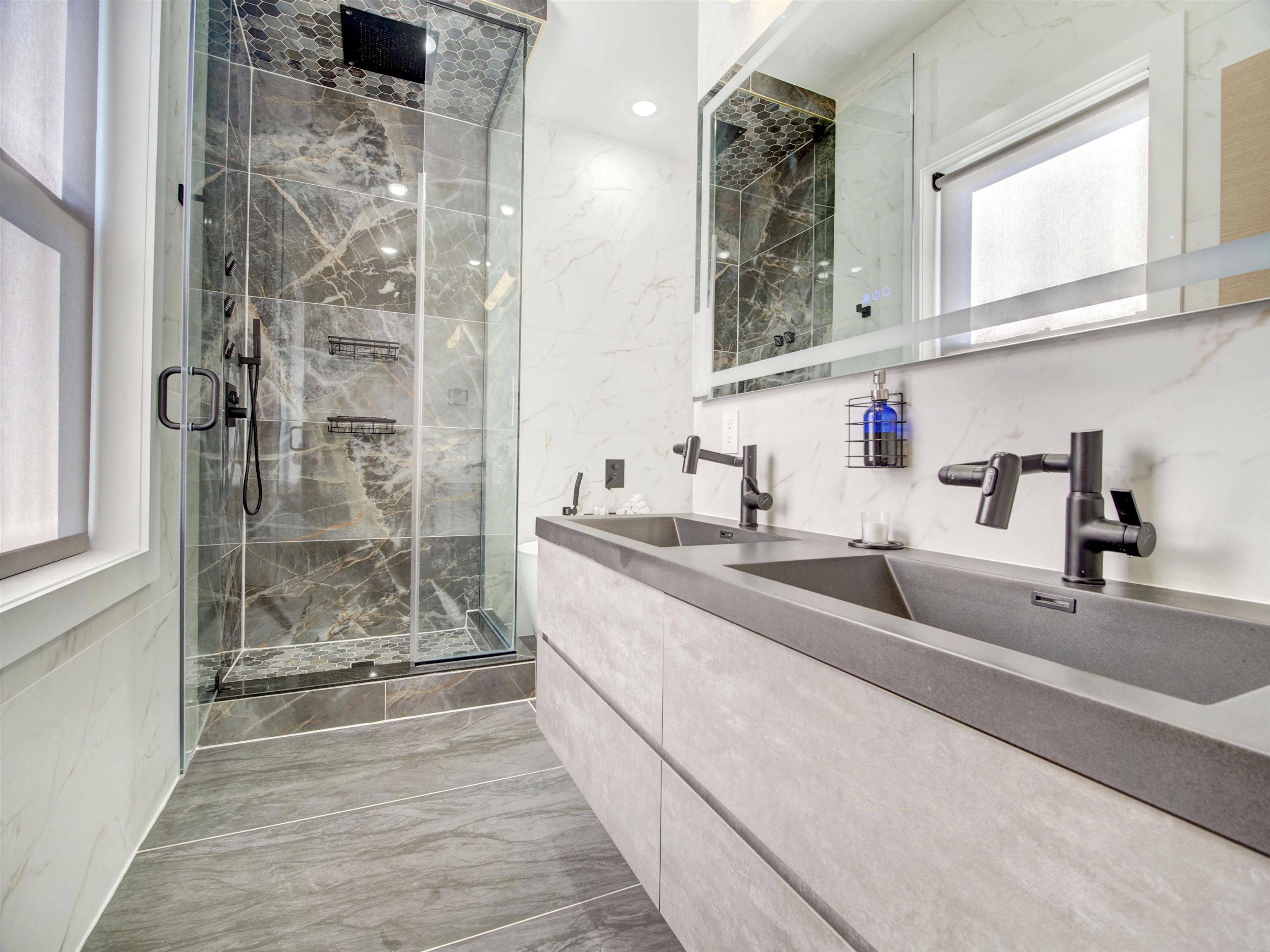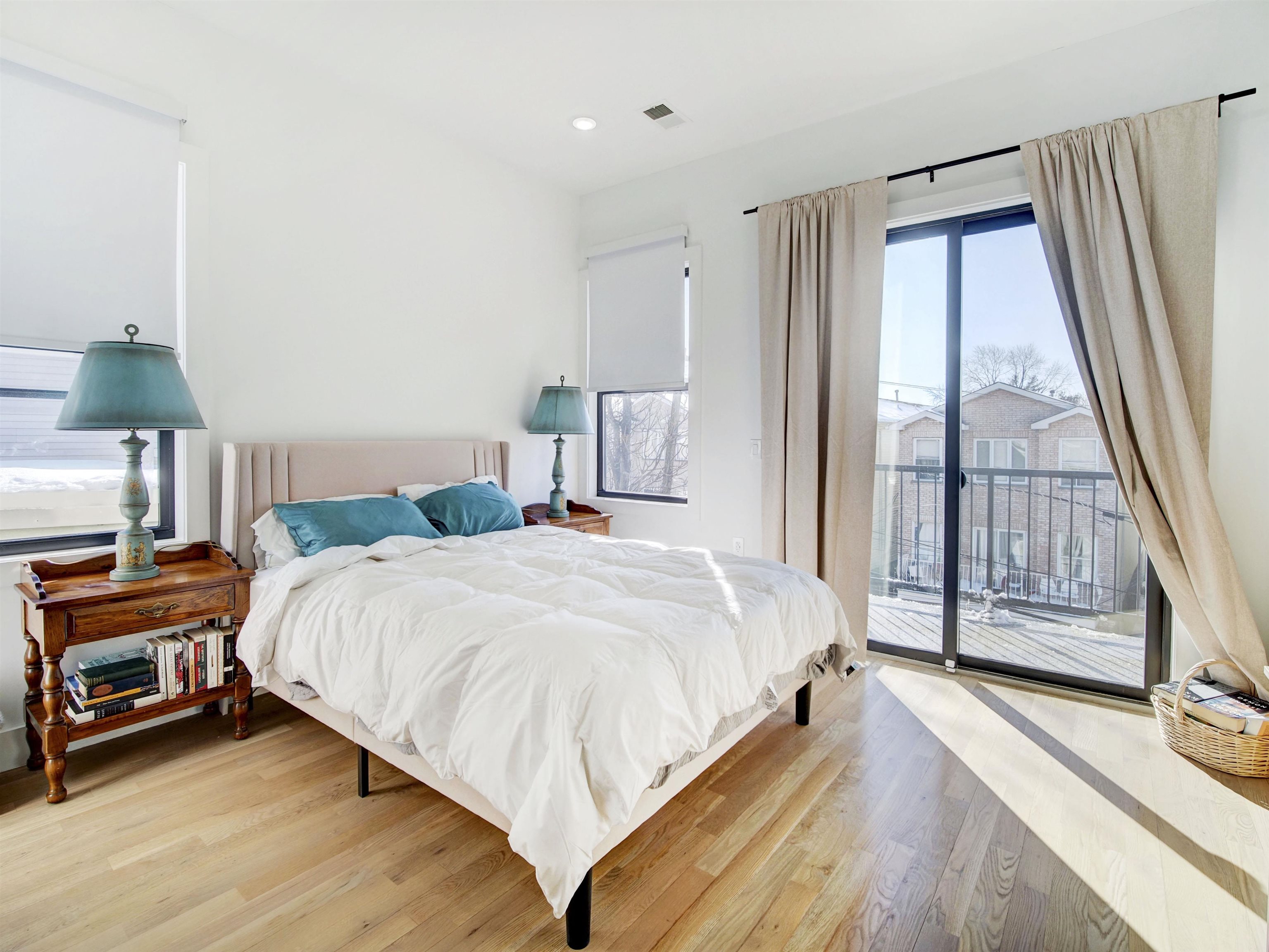 Welcome to this stunning, modern three-bedroom, 2.5-bath luxury condominium designed for elevated living. The sleek chef’s kitchen features state-of-the-art SMART appliances, including a gas range and oven, refrigerator, dishwasher, wine refrigerator, and a convenient pot filler. Sun-filled and open, the living space showcases light-toned hardwood floors and a striking quartz slab feature wall with a marble-like finish, centered around a heated electric fireplace with a mounted TV. The unit is fully wired for a security system and Ring doorbell for added peace of mind. All three bedrooms are located on the second level, highlighted by a spa-inspired primary suite and a secondary bath with a deep soaking tub. Each bathroom offers true luxury with heated floors and smart toilets featuring bidet functionality. Crowning the home is a private rooftop terrace with sweeping panoramic views—an entertainer’s dream complete with an outdoor kitchen and pizza oven, perfect for hosting or relaxing under the open sky.