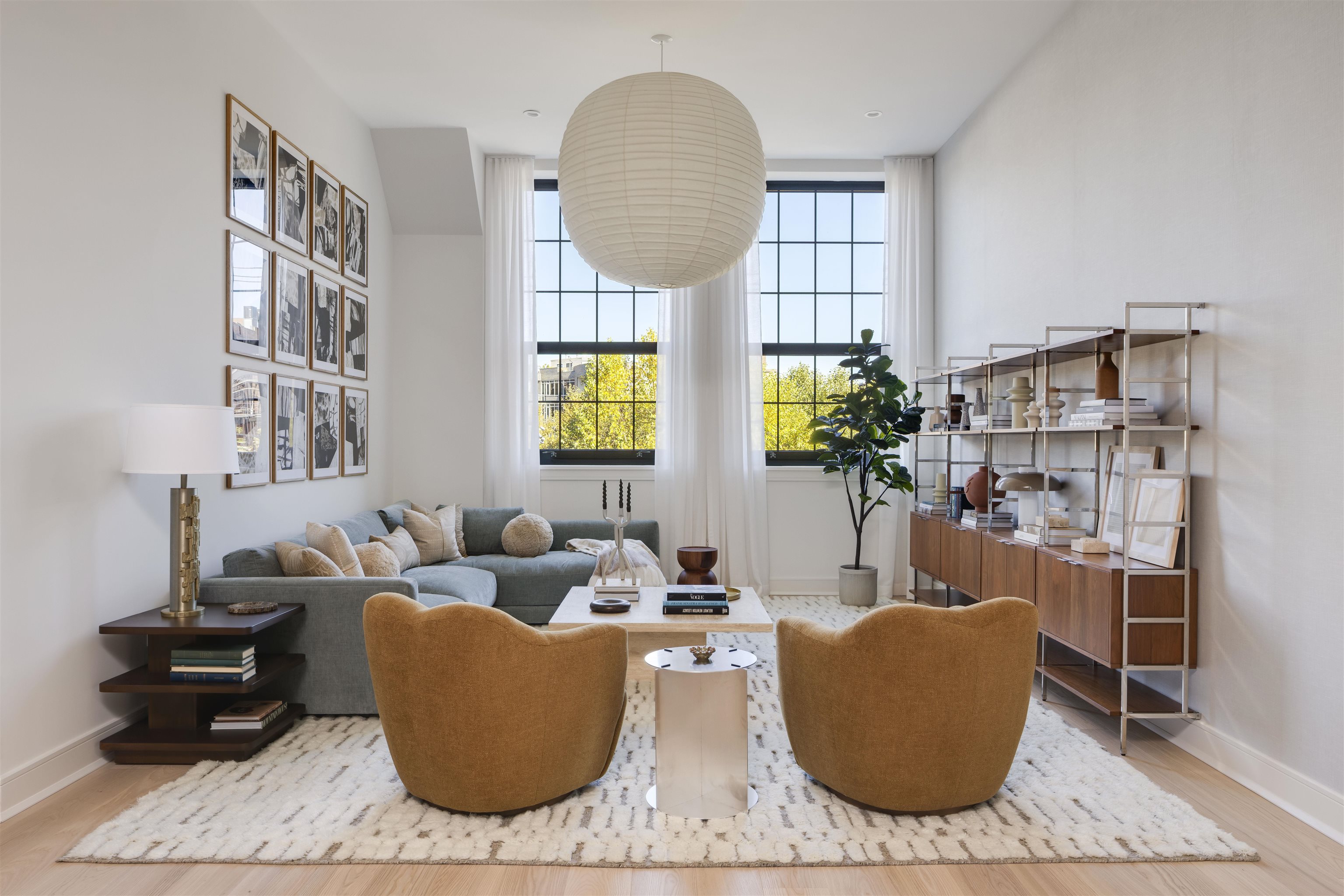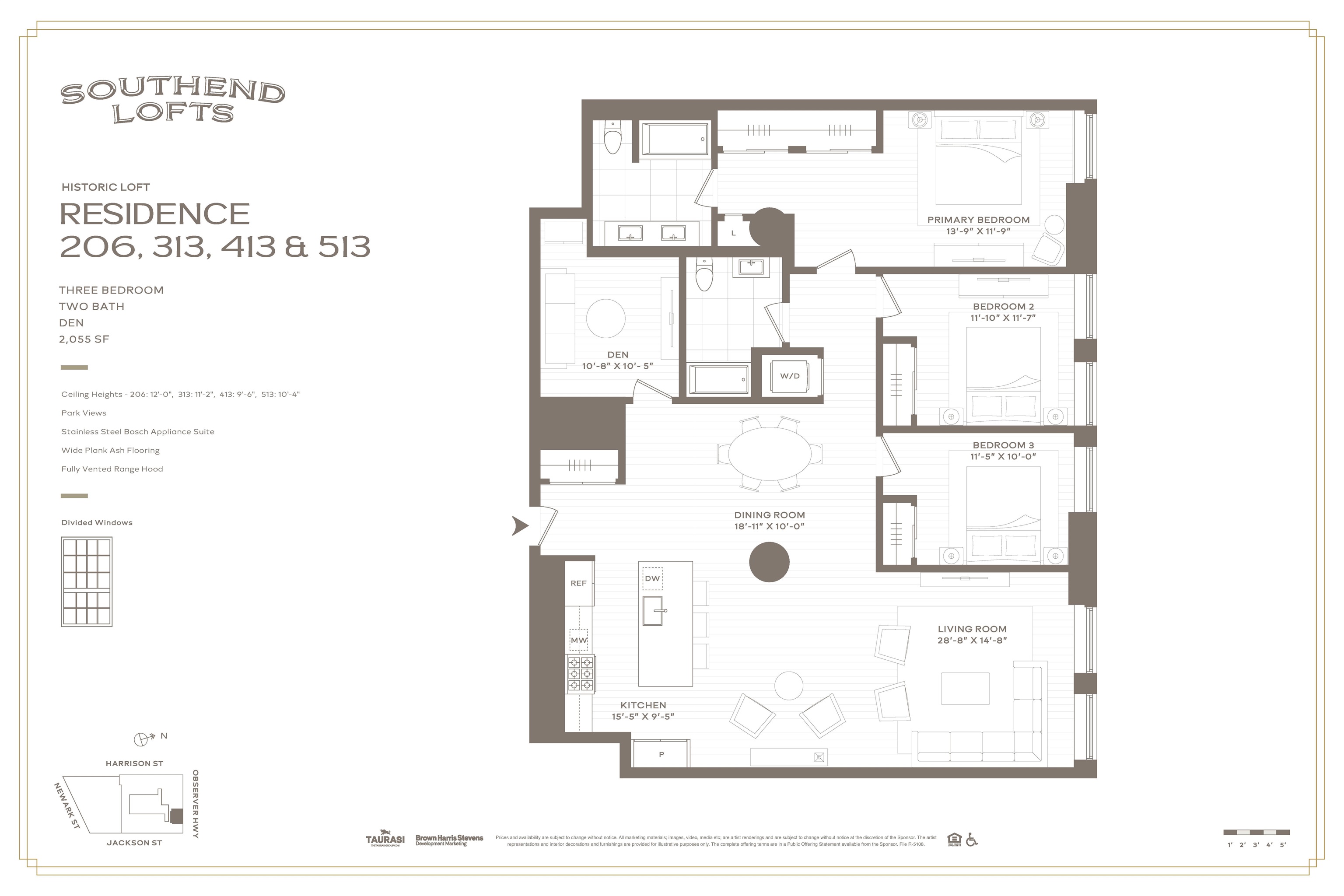 Massive Three Bedroom + Den Loft Residence 313 is a sprawling 2,055 sf park facing 3 bedroom, 2bath home with den (flexible fourth bedroom) and separate dining area. The 28’8†X 14’8†living room features soaring ceilings and oversized windows that fill the home with natural light. The custom kitchen offers abundant storage, Calacatta Valentin countertops and backsplash, and a full suite of Bosch stainless steel appliances, including a vented range hood, microwave drawer, and dishwasher. The primary suite features three closets and a four-fixture spa-inspired bath adorned with Calacatta Lucca wall and floor tiles, a Duravit soaking tub/shower, double vanity with white quartz countertop, Kohler sinks, and distinctive pill-shaped mirrors with integrated lighting. Wide plank ash wood floors, high-performance VRF heating and cooling, and an LG washer with state-of-the-art heat pump dryer completes the exceptional finish package of this brand-new home. Southend Lofts features 1 - 5 bedroom newly built condominiums offering over 20,000 square feet of amenities including a massive roof garden with incredible Manhattan Views, a 40' pool, BBQ stations, recreation area and lounging, 24 hour attended lobby, fitness center, co-working areas, a Golf and Multi Sports Simulator and Children's Playroom. Indoor parking available at an additional cost. Exclusive Sales and Marketing Agent: Brown Harris Stevens Development Marketing. The complete offering terms are in a Public Offering Statement available from the Sponsor. File R-5108. Equal Housing Opportunity