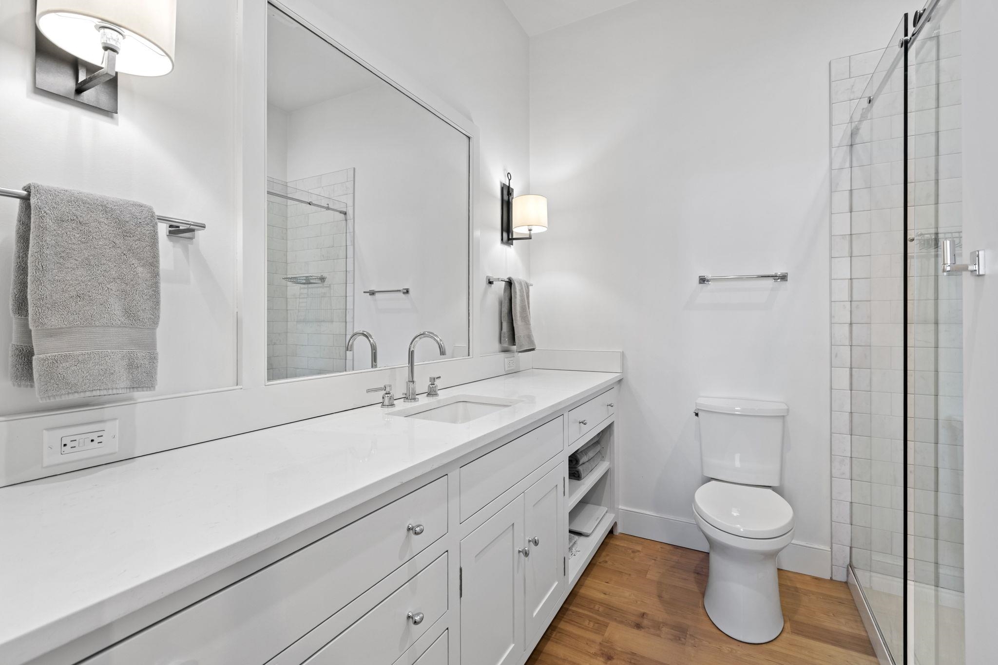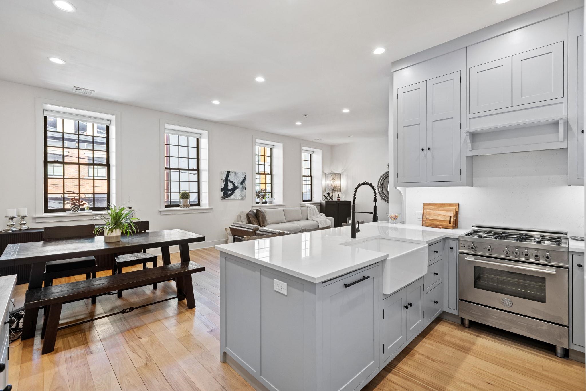 If you’re looking for cookie-cutter, this isn’t it. Welcome to 222 Clinton Street at The Mill, a loft-style home in the heart of downtown Hoboken. Enter through a proper foyer, the perfect landing strip for art, featuring a large coat closet plus bonus overhead storage. Just off the entry is a charming powder room before the home opens into the main living space. The living room stuns with 13-foot ceilings and oversized black-pane windows, filling the home with natural light. The open-concept layout makes entertaining effortless. Cook, host, and connect all at once. The dining area easily accommodates large gatherings or doubles as an ideal work-from-home setup. The kitchen is the true star of the show. Custom wood cabinetry in a timeless finish, farmhouse sink, white countertops, Bosch dishwasher, Sub-Zero refrigerator, Bertazzoni oven, and a commercial-grade hood. Whether you’re a seasoned chef or an enthusiastic beginner, this kitchen delivers, with no shortage of storage, including a matching built-in hutch. This is not a home built around trends. It’s one designed to age beautifully, whether you’re moving in tomorrow or selling years down the line. Comfort meets convenience with central A/C powered by an HVAC system and rooftop compressor, a Nest smart thermostat, and custom window treatments throughout. Who doesn’t love a little separation in a condo? Upstairs, a Samsung washer and dryer sit conveniently at the top of the stairs. The second bedroom is spacious and versatile, perfect as a bedroom, nursery, or home office, with a full bathroom across the hall featuring clean, modern finishes. Down the hall, the primary suite is a true retreat. Moody walls command attention, complemented by a stunning oversized light fixture. Storage is abundant with a large walk-in closet featuring built-in organizers, plus an additional closet. The en-suite bathroom is light and bright, offering generous storage and a double vanity. Located directly on Clinton Street is your private garage, large enough to accommodate most SUVs with plenty of additional storage. Owners at The Mill also enjoy a bonus storage area conveniently located near the front entrance. Step into the private courtyard and you’ll quickly realize this building is unlike anything else in town. Perfectly situated downtown, close to the PATH, next to the Willow Avenue bus line, and moments from Hoboken’s best restaurants, shops, and cafés. Why move to the suburbs when you can have your own slice of them right here in the Mile Square City?