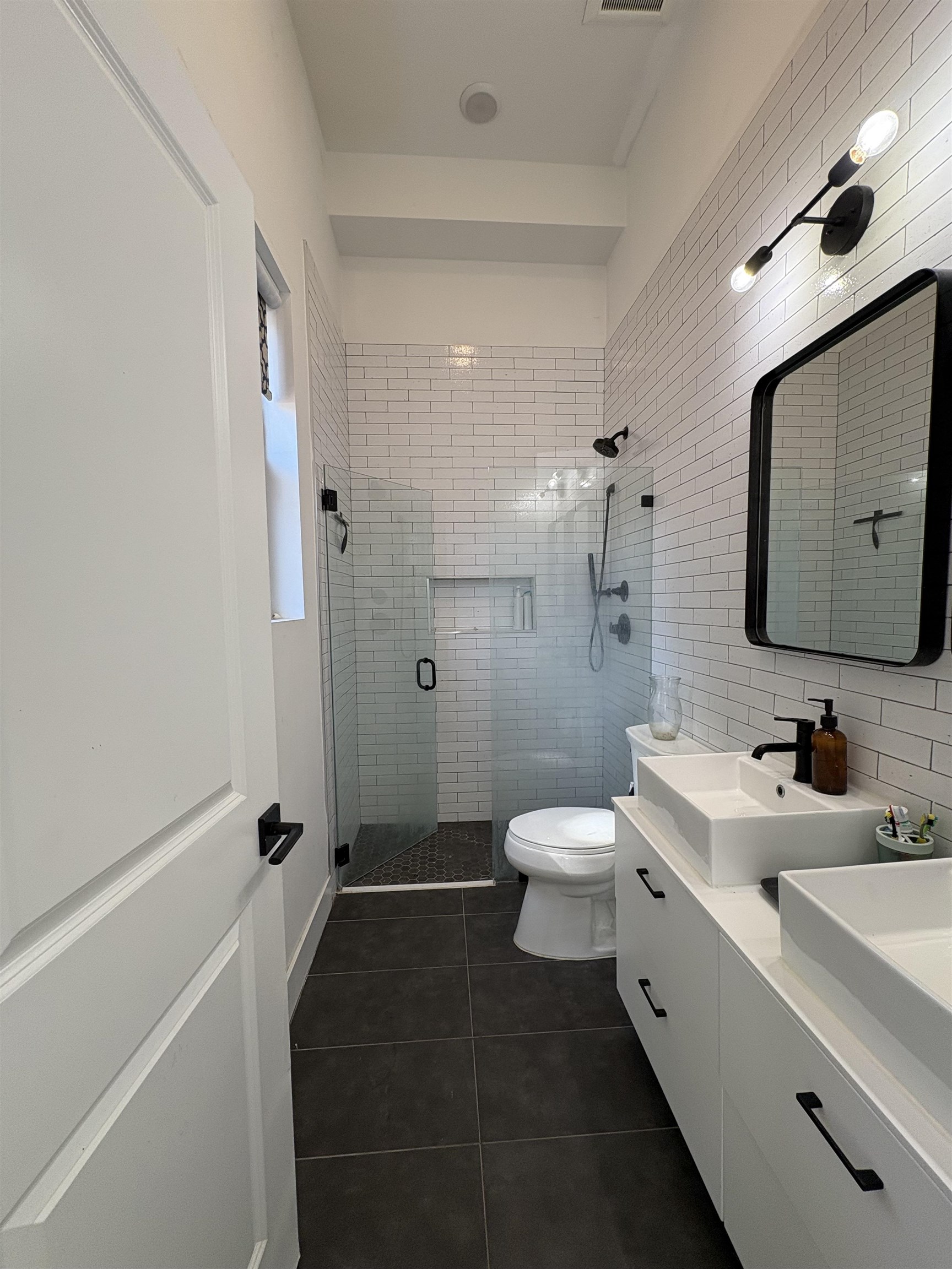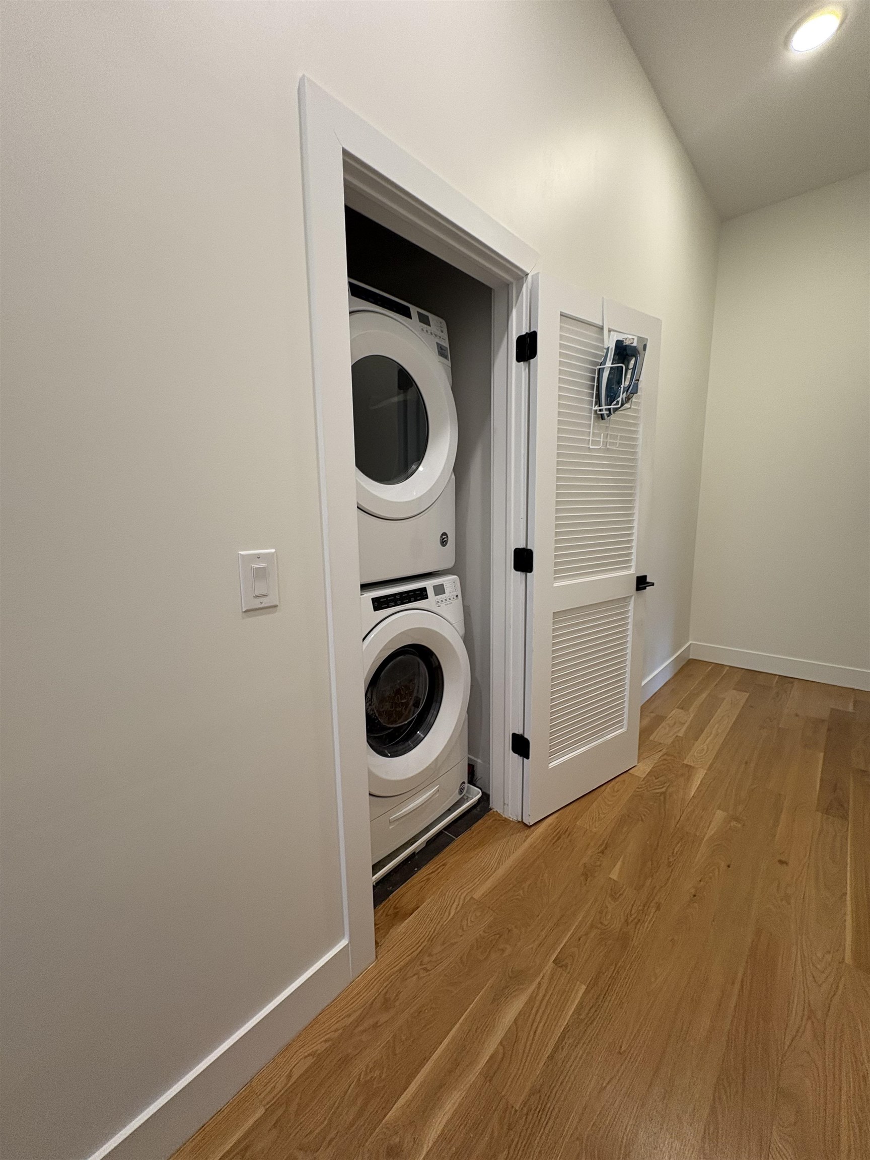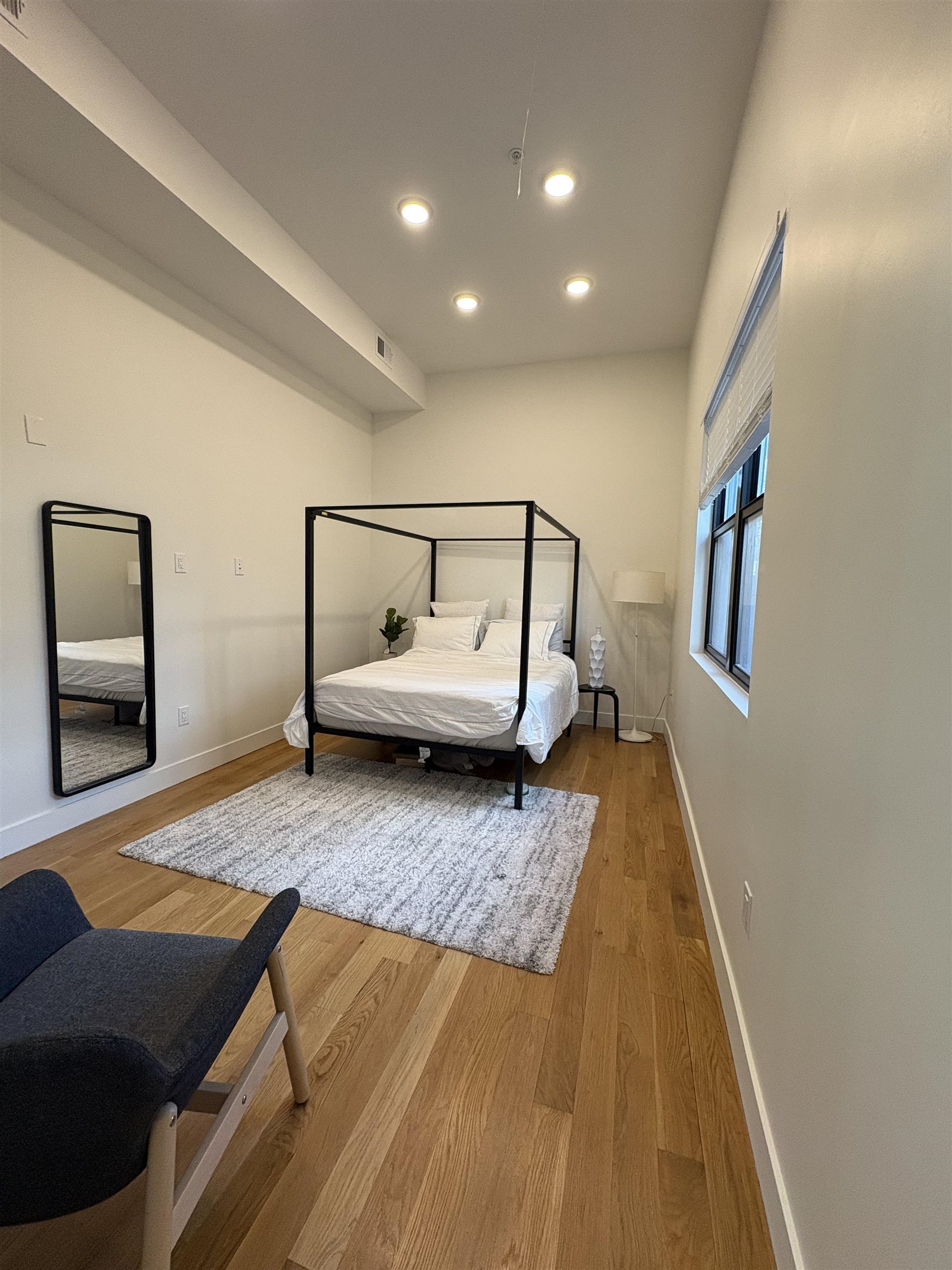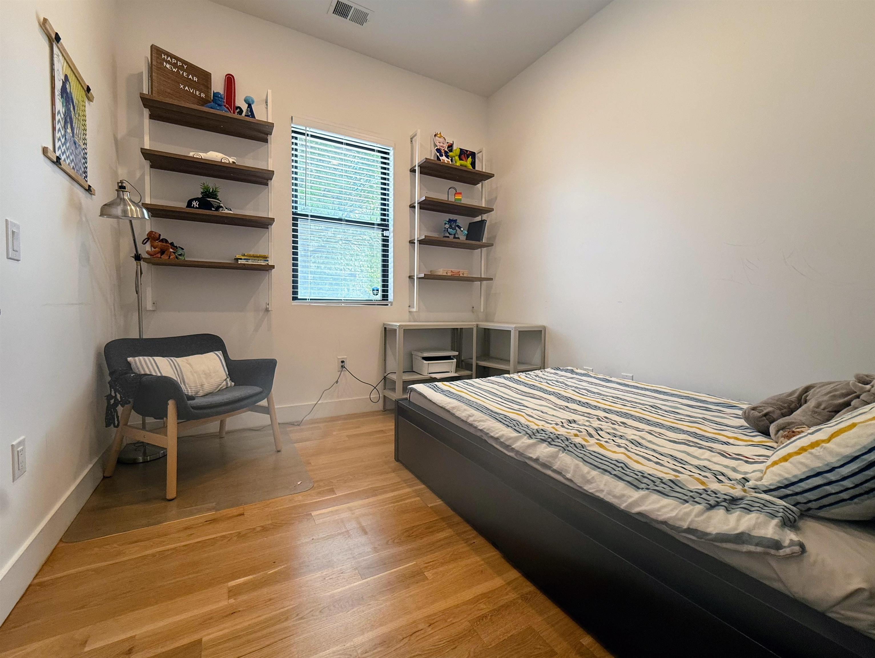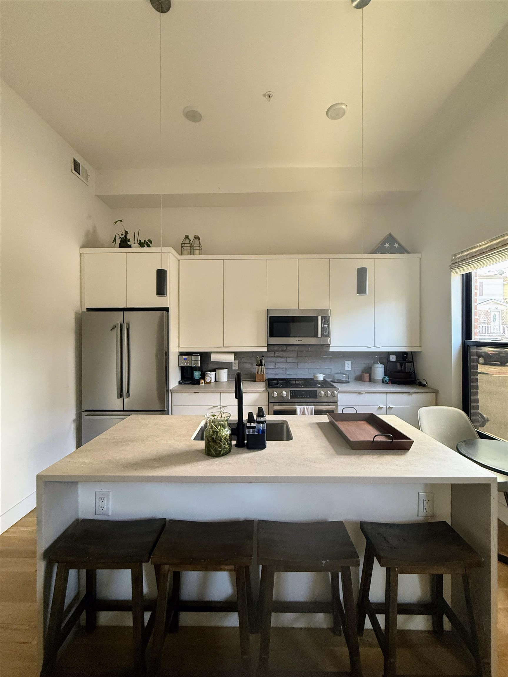 Gut-renovated 2BR/2BA condo in Jersey City Heights featuring white oak floors, matte black windows, and a bright open layout. Kitchen boasts waterfall concrete-textured quartz island, Bosch stainless appliances, inset sink, and glass backsplash. Spa-style baths with floating vanities, dark-grout tile, and glass showers. Full-size Whirlpool W/D in unit. Prime location near Central Ave, Washington Park, and easy NYC access. Extra storage available. Must see