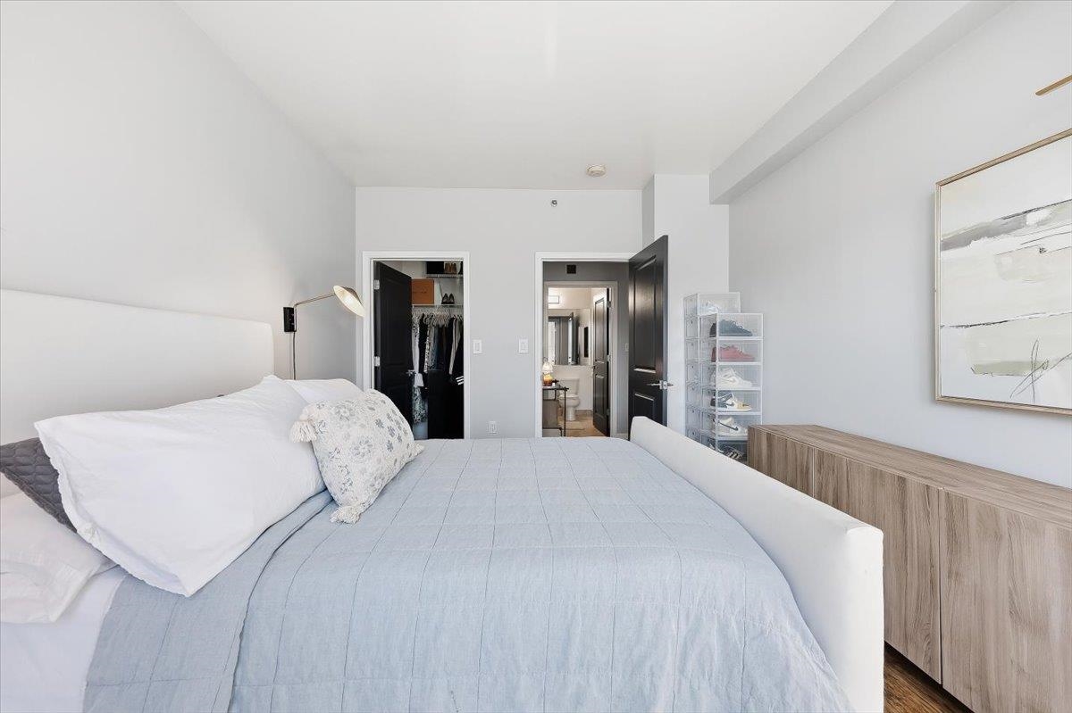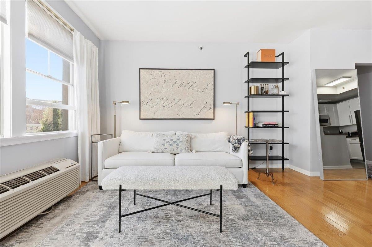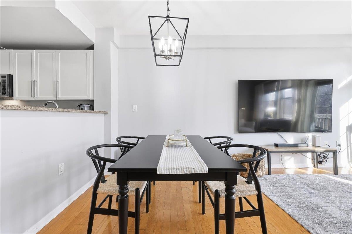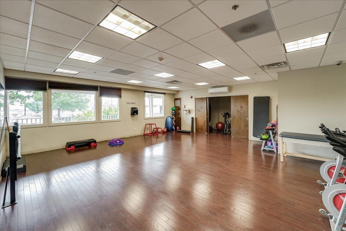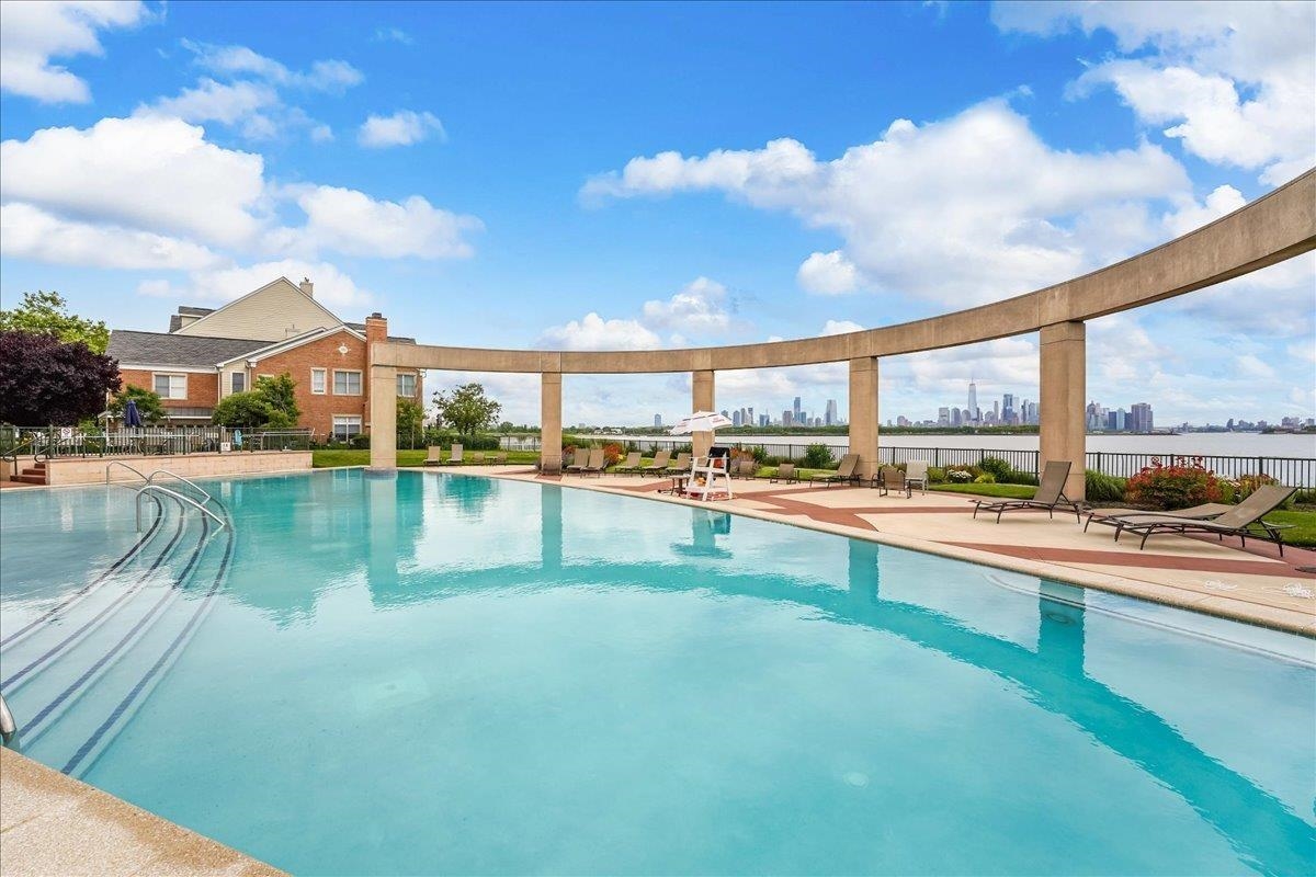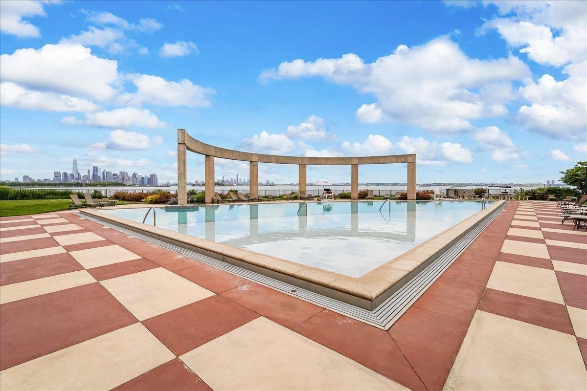 Luxury waterfront living in Port Liberte! This sun-filled, south-facing, top-floor one-bedroom, one-bath condo features a private courtyard-facing balcony with tree-top views and one-car assigned parking. A meticulously maintained open-concept home that seamlessly blends the kitchen, living, and dining areas, making it perfect for both entertaining and everyday living. The spacious bedroom fits a king-sized bed and includes a generously sized walk-in closet with custom organizers. The modern kitchen is equipped with stainless steel appliances, including a gas range, and ample cabinet space. Additional highlights in the home include hardwood floors, an intercom system, and the convenience of an in-unit washer and dryer. Located along the Hudson River and adjacent to the Liberty National Golf Club, Port Liberte is an amenity-rich community that features: Two pools, tennis and basketball courts, 4600 sf fitness center with sauna, clubhouse, play areas and dog runs, and 24-hour gated security. The monthly maintenance fee covers heat, hot water, water, parking, daily trash removal, snow removal as well as full access to all community amenities. Commuting is made easy with an on-site NY Waterway Ferry Terminal providing service to lower Manhattan and a shuttle to the Grove Street PATH station. An exceptional opportunity to make the exclusive community of Port Liberte your new home!