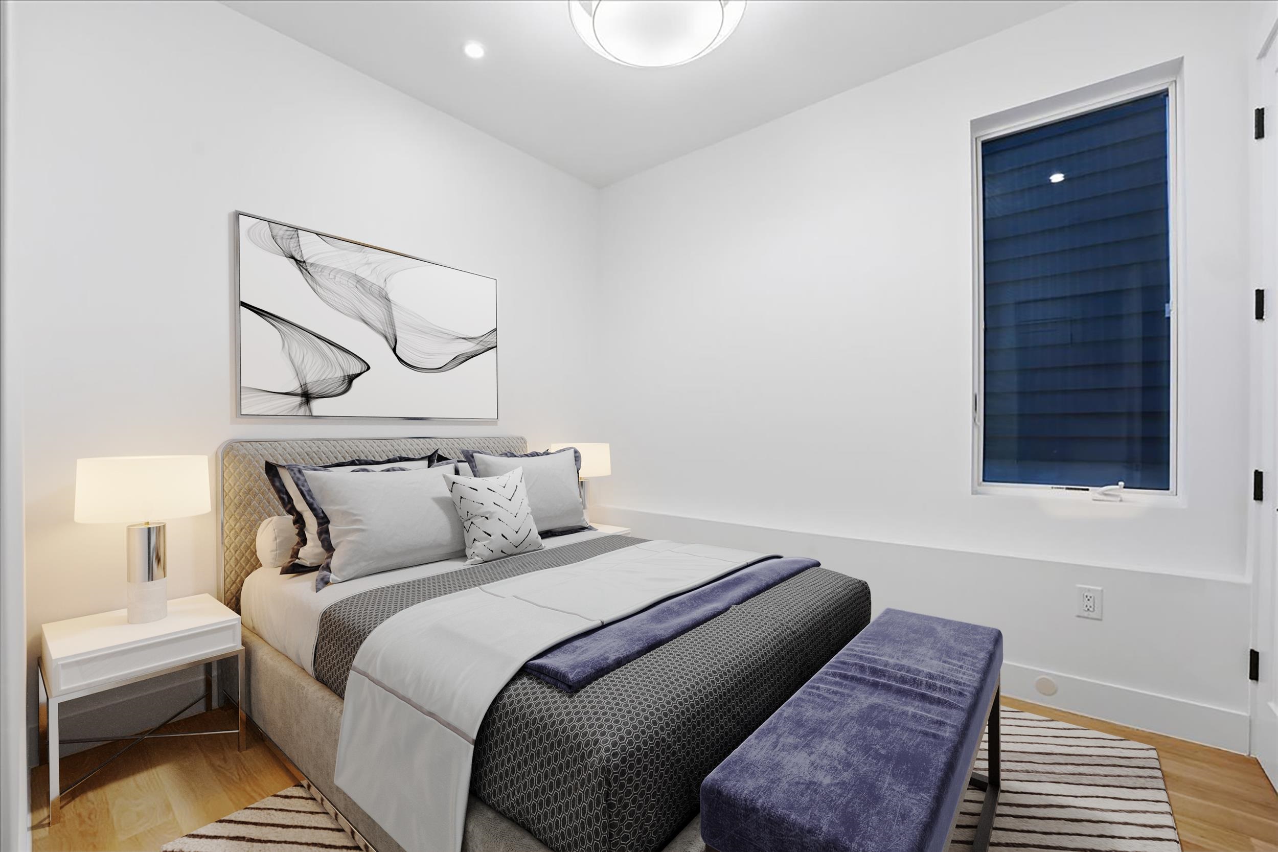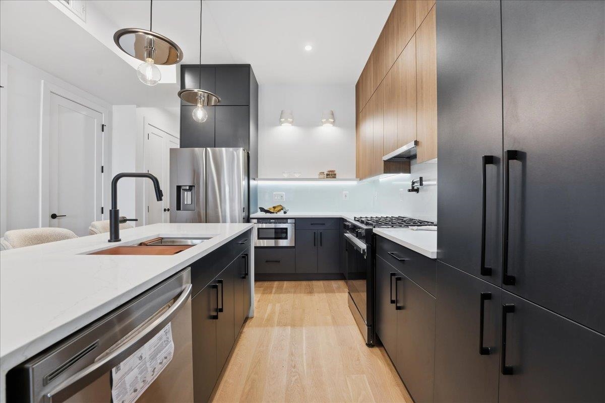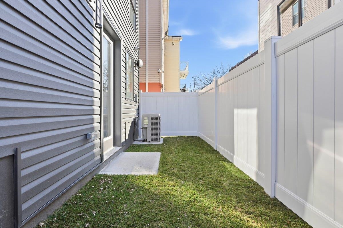 Set amid a striking four-unit development in The Heights, this brand new residence redefines modern living, bold style and curated comfort. Spanning two levels and showcasing modern mood, elevated design and layered luxury, this 3 bedroom, 2 bath home also includes a bonus room and private backyard. Floor-to-ceiling and wall-to-wall windows welcome you into the living space illuminating warm hardwood floors and the beautiful open floorplan. The kitchen commands attention with a waterfall white quartz island, seamless backsplash, matte black and natural wood custom cabinetry, and premium stainless appliances including a microwave drawer. Matte black pendant lighting and fixtures finish the look, including a pot filler for added style and functionality. Retreat to the primary ensuite designed to impress with soft grey wood-panelling, striking chandelier, and spacious walk-in-closet. Glass doors allow secluded access to the private backyard finished with lush lawn and brand new white fencing. Bathroom finishes include elements like matte black vessel sinks, vertical tile to the ceiling, glass-enclosed multi-spray shower or soaker tub, and accent lighting in the shower niche. Head downstairs to the flexible bonus space and endless opportunities, such as a playroom, studio, office, home gym or more. Additional upgrades abound with extras like Bose surround sound speakers throughout the home, plus an added laundry room with side-by-side brand new Samsung washer and dryer. Two blocks to Reservoir #3 or Pershing Field Park, and easy access to Journal Square PATH, this location offers comfort, community and convenience. Set on a tree-lined street in Jersey City Heights, this quiet neighborhood is known for its creative, inclusive community, boutique shops and restaurants, excellent parks and schools and gorgeous skyline views.