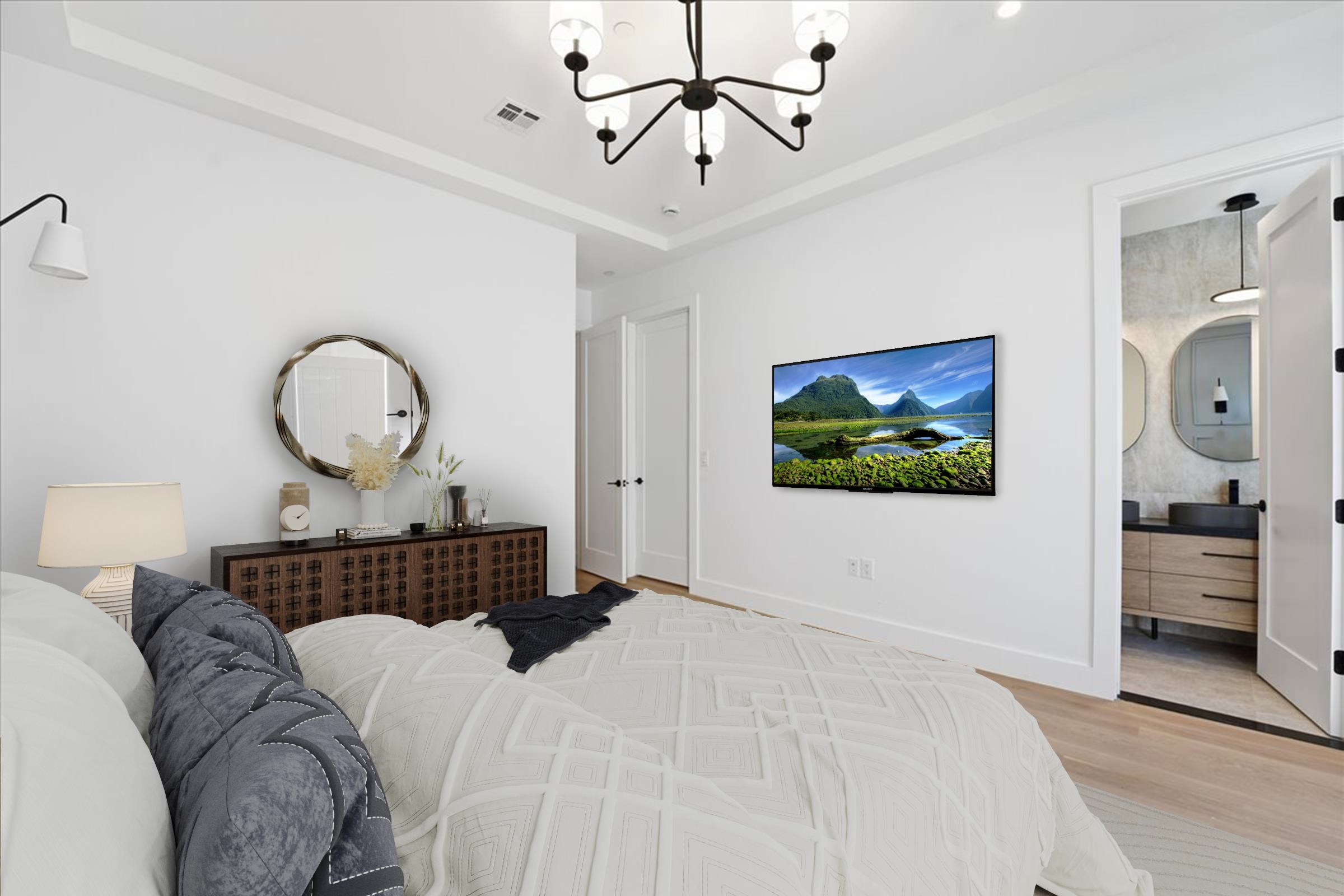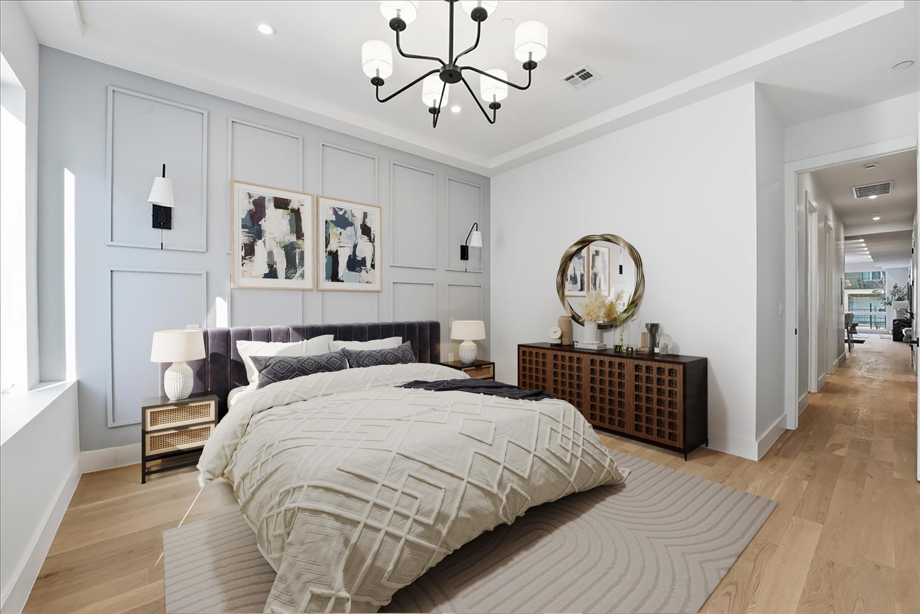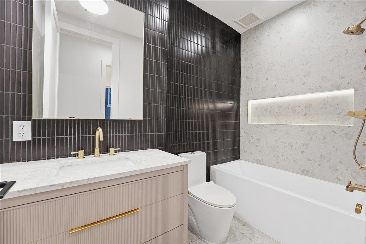 Set amid a striking four-unit development in The Heights, this brand new residence redefines modern living, bold style and curated comfort. Spanning two levels and showcasing modern mood, elevated design and layered luxury, this 3 bedroom, 2 bath home also includes a bonus room and private backyard. Floor-to-ceiling and wall-to-wall windows welcome you into the living space illuminating warm hardwood floors and the beautiful open floorplan. The kitchen commands attention with a waterfall white quartz island, seamless backsplash, matte black and natural wood custom cabinetry, and premium stainless appliances including a microwave drawer. Matte black pendant lighting and fixtures finish the look, including a pot filler for added style and functionality. Retreat to the primary ensuite designed to impress with soft grey wood-panelling, striking chandelier, and spacious walk-in-closet. Glass doors allow secluded access to the private backyard finished with lush lawn and brand new white fencing. Bathroom finishes include elements like matte black vessel sinks, vertical tile to the ceiling, glass-enclosed multi-spray shower or soaker tub, and accent lighting in the shower niche. Head downstairs to the flexible bonus space and endless opportunities, such as a playroom, studio, office, home gym or more. Additional upgrades abound with extras like Bose surround sound speakers throughout the home, plus an added laundry room with side-by-side brand new Samsung washer and dryer. Two blocks to Reservoir #3 or Pershing Field Park, and easy access to Journal Square PATH, this location offers comfort, community and convenience. Set on a tree-lined street in Jersey City Heights, this quiet neighborhood is known for its creative, inclusive community, boutique shops and restaurants, excellent parks and schools and gorgeous skyline views.
