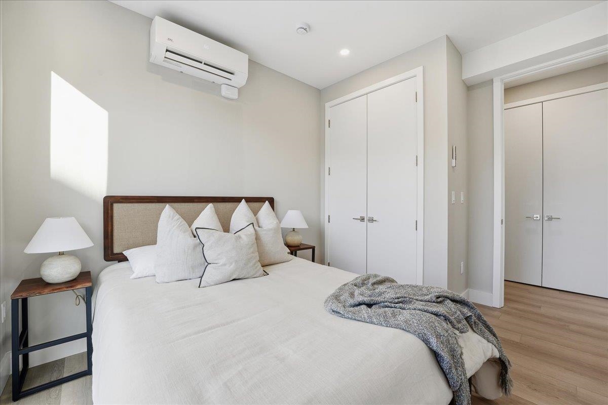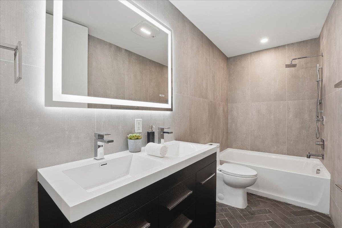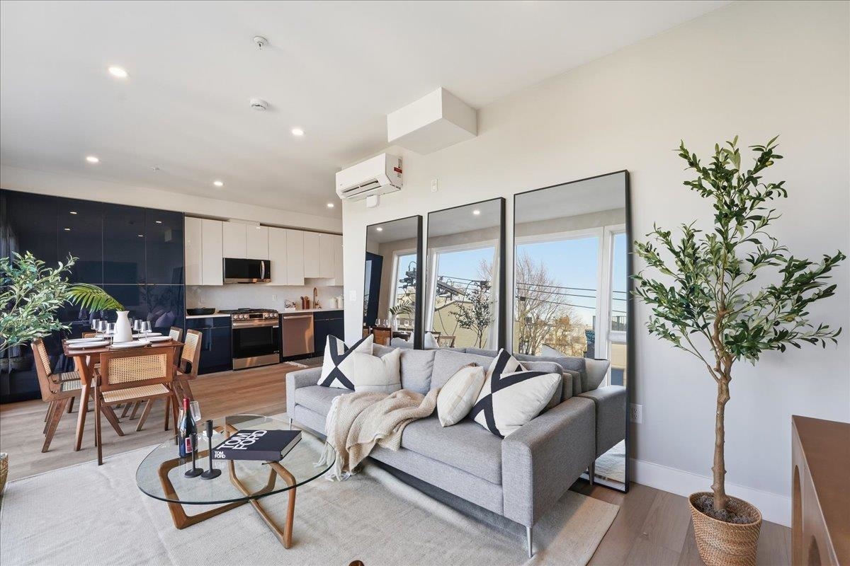 Designed for both serenity and sophistication, this elevated home offers modern finishes, tree-top views and an unbeatable Heights location just 1 block to 2nd Street stairs and Lightrail station. A hidden haven in the Heights, this beautifully crafted 3 bed, 2 bath residence blends bespoke finishes with gorgeous private rooftop-shared with unit 3- for a rare retreat. Wide plank floors ground the space, while natural light floods through the floor-to-ceiling windows illuminating the open floorplan. The kitchen offers clean lines and contemporary flair with modern white & blue cabinetry, gleaming quartz countertops, herringbone tile backsplash, sleek brass-accented fixtures and stainless steel appliances. Both bathrooms are beautifully finished with floor-to-ceiling porcelain tile, herringbone floors, and luxurious rainhead multi-spray shower systems and soaking tub. One bedroom is shielded with privacy glass giving both sunshine and seclusion, while the primary ensuite showcases a full wall of glass for a gorgeous view & lots of natural light. Top it off with a brand new stacking LG washer and dryer for everyday ease and convenience. Situated just one block from the 2nd Street Light Rail station, this home not only provides direct access to Hoboken and NYC connections, but also Riverview Fisk and Pershing Field Park and Reservoir. Jersey City Heights is known for its vibrant community, excellent parks and schools, boutique shops and restaurants and close proximity to NYC and surrounding areas.