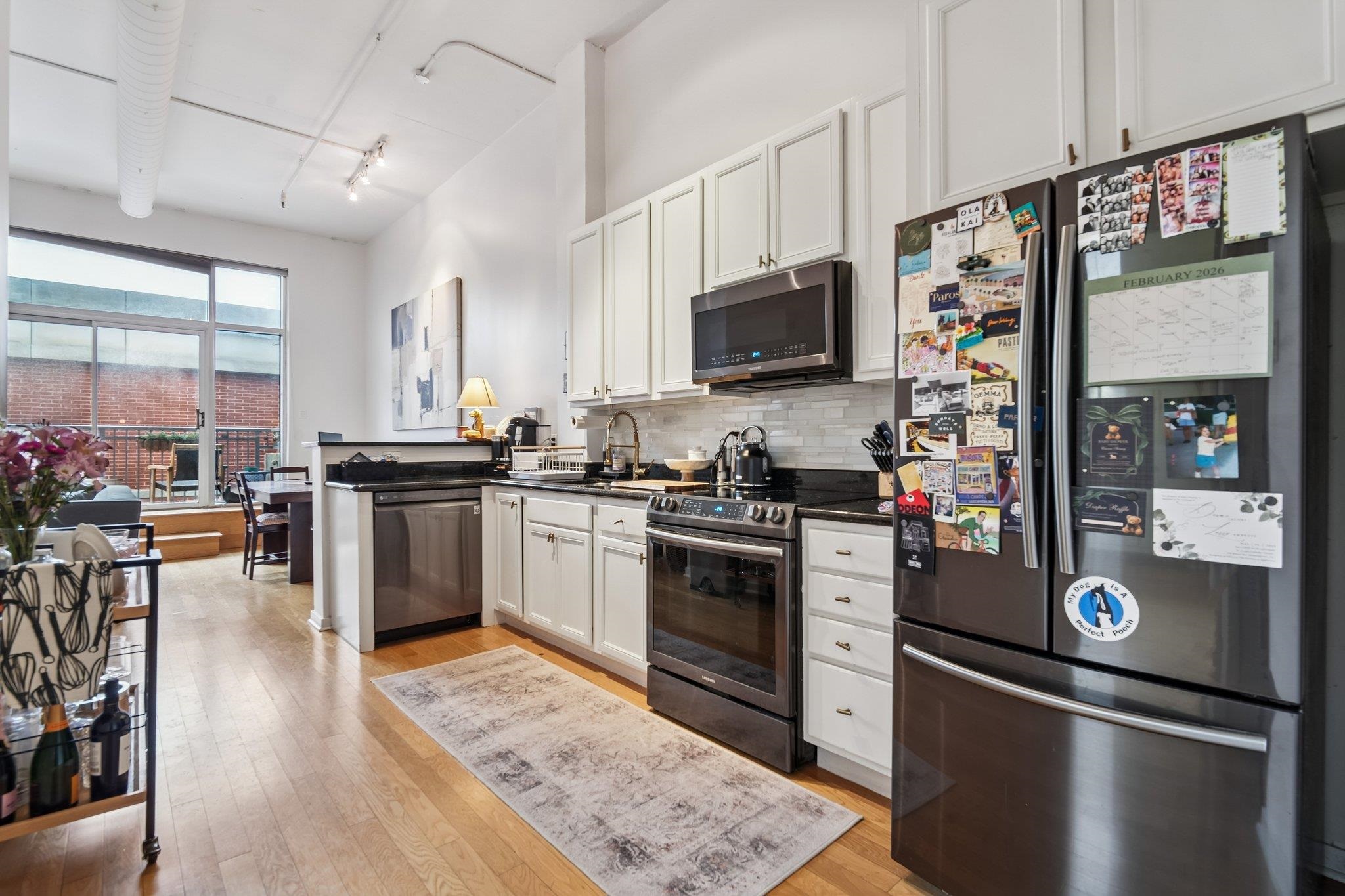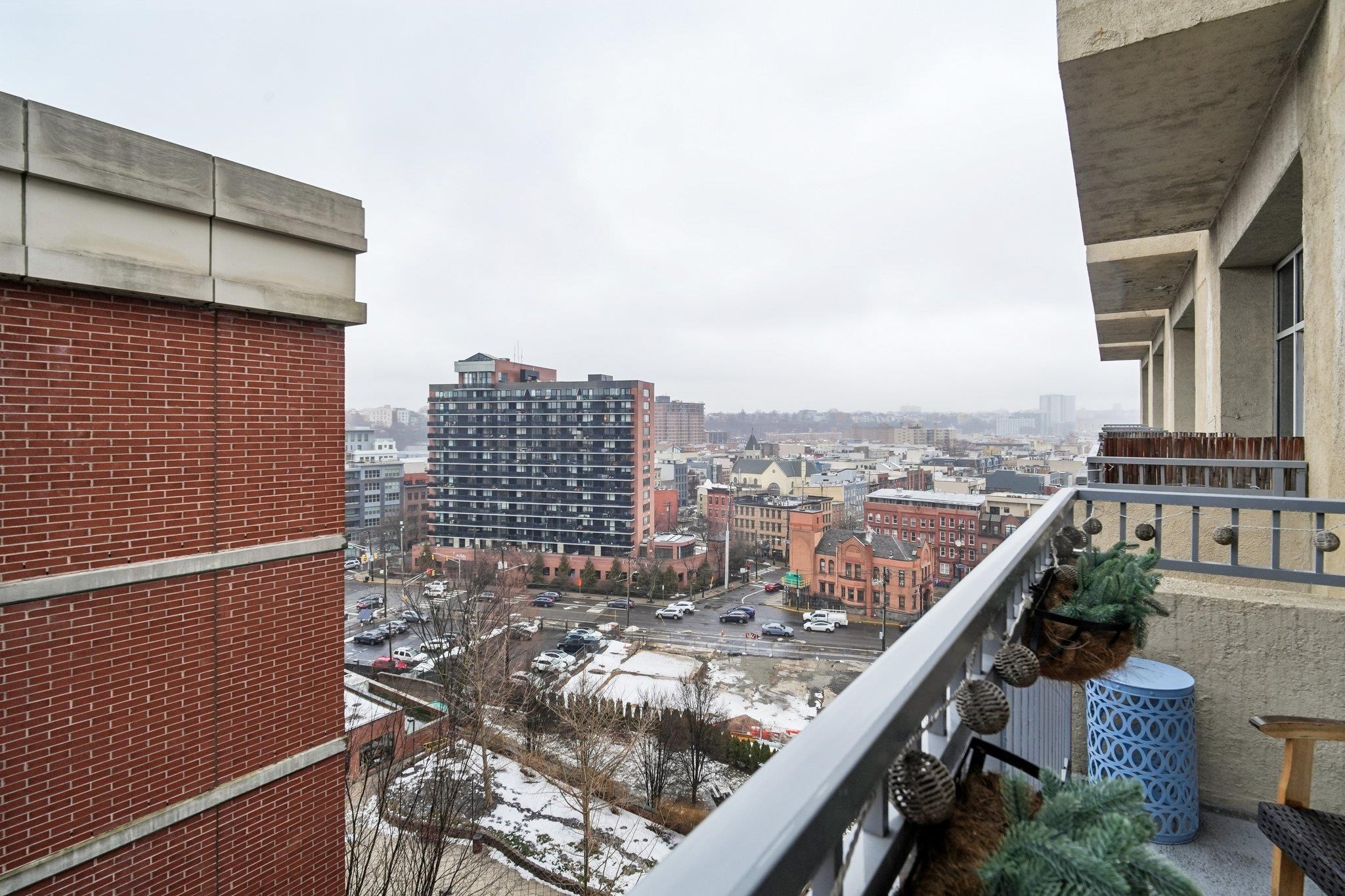 Experience elevated living in this sun-drenched 10th-floor residence offering over 990 sq ft of bright and inviting space. This spacious 2-bedroom, 1-bath condo features gleaming hardwood floors throughout, high ceilings, and an easy, functional layout designed for comfortable living. Both bedrooms are generously sized with ample closet space and large windows that bring in natural light, offering flexibility for a guest room, home office, or growing household. The full bath is well-appointed, and the kitchen showcases black granite countertops, a breakfast bar, glass tile backsplash, white cabinetry, and a clean, modern feel. The expansive living room is filled with natural light and serves as the heart of the home, providing plenty of space for both lounging and dining. Sliding glass doors lead to a private 100 sq ft balcony, creating a seamless indoor-outdoor flow and offering the perfect setting for morning coffee, evening relaxation, or entertaining guests. A brand new in-unit washer and dryer add everyday convenience and ease to this thoughtfully designed home. This full-service, concierge building features an elevator, fitness center, bike storage, and 24/7 security for added convenience and peace of mind. Ideally located less than 10 minutes from the Hoboken Terminal (PATH station) and just blocks from shopping, parks, and local dining, this home offers comfort, space, and exceptional accessibility.