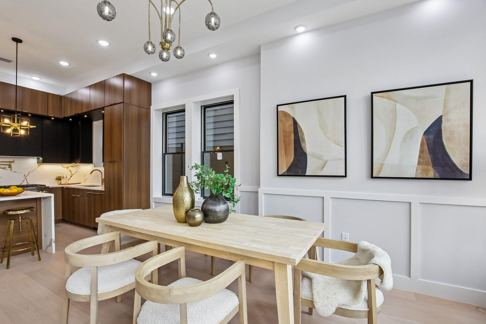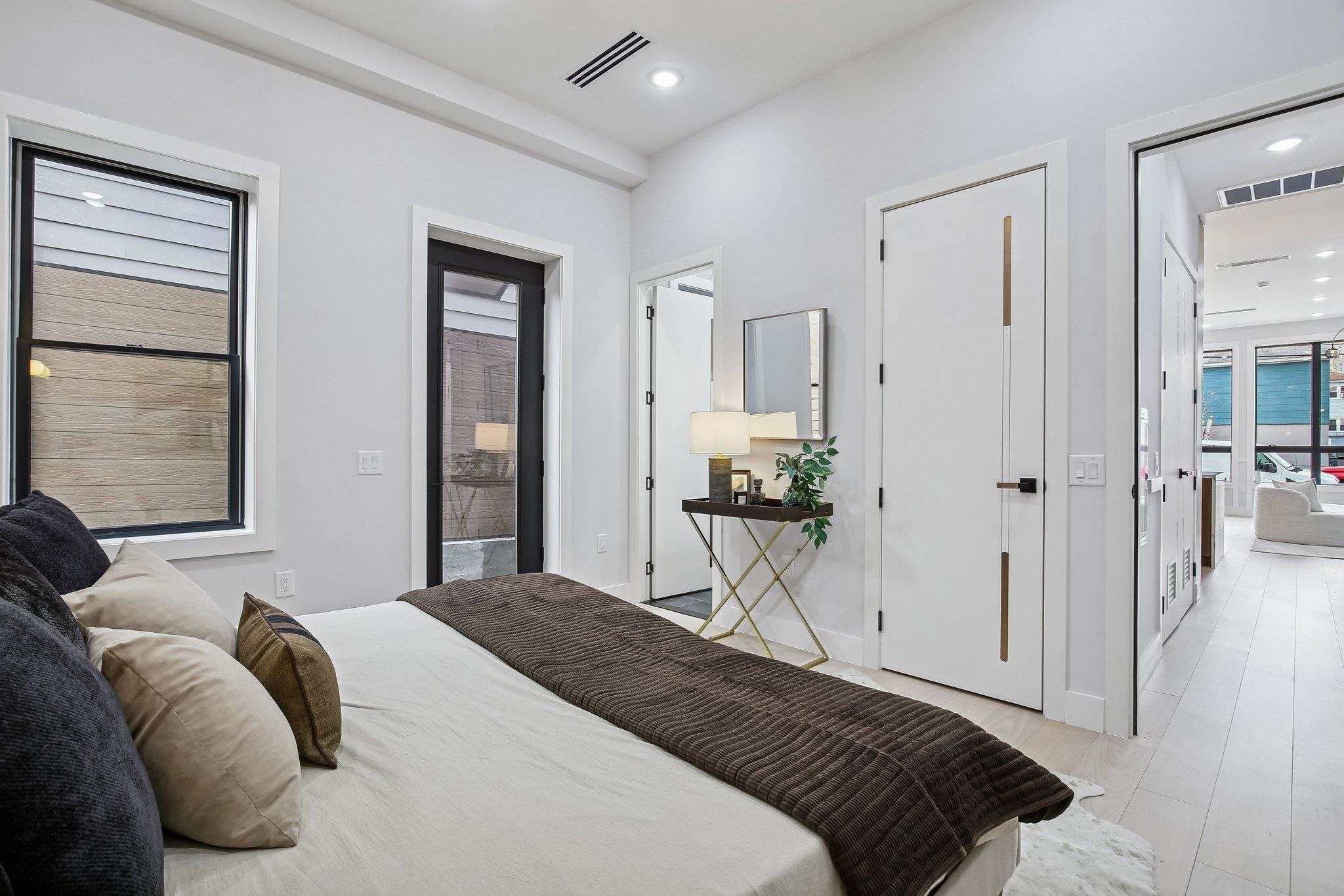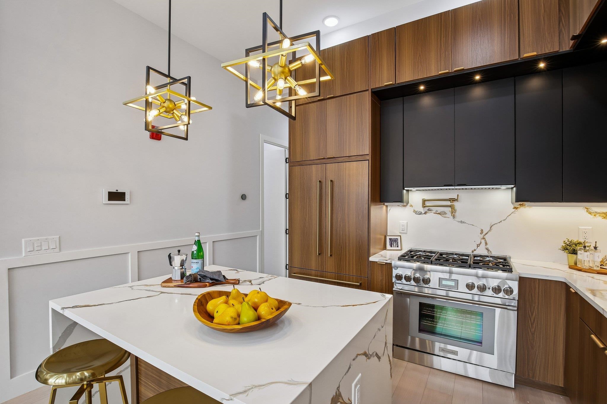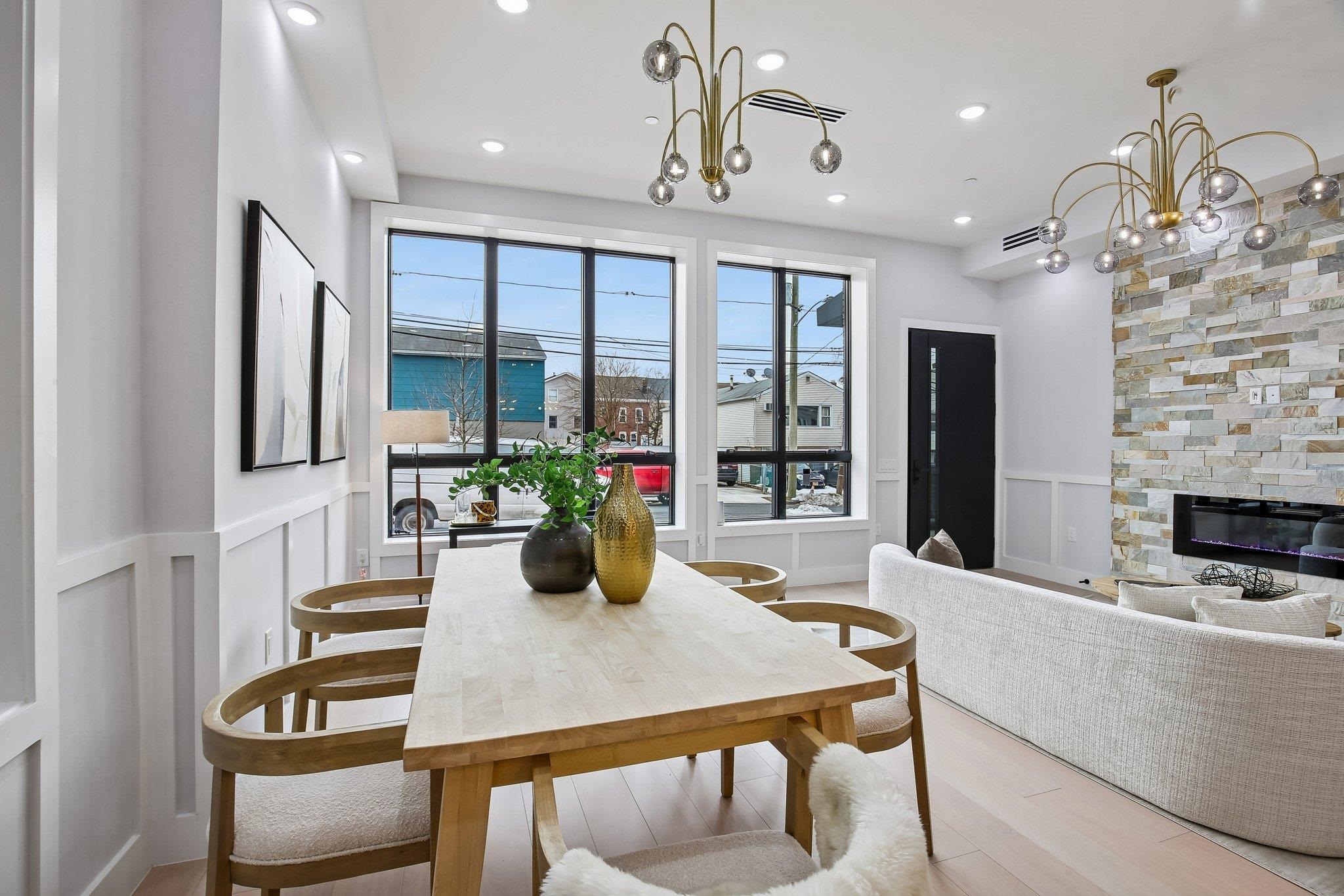 A statement in modern luxury, this newly constructed three-bedroom, two-bath residence is set on one of the most coveted streets in the prestigious Island section of Journal Square. Offering approximately 1,363 square feet of impeccably curated interiors, this PRIVATE BACKYARD home delivers a rare blend of architectural scale, refined finishes, and seamless indoor–outdoor living. Beyond a striking nine-foot custom entry door, the home unfolds into a dramatic open-concept living and dining space framed by soaring 12-foot ceilings and expansive Andersen windows that flood the interior with natural light. Six-inch wide-plank hardwood floors in a soft, contemporary finish enhance the airy, loft-like ambiance, while a bespoke electric fireplace anchors the space with understated elegance—equally suited for intimate evenings or elevated entertaining. The chef’s kitchen is designed to impress. Custom soft-close oversized cabinetry, quartz countertops, and a designer tile backsplash complement a substantial center island ideal for gathering. A full suite of premium Thermador appliances—including a concealed double-door refrigerator and six-burner professional range—offers both performance and polish for the discerning culinary enthusiast. The primary suite serves as a tranquil retreat, complete with a custom walk-in closet and a spa-inspired bath featuring a sleek rain shower and sophisticated designer finishes. Two additional generously scaled bedrooms provide oversized custom closets and abundant natural light, offering flexibility for guests, family, or a private home office. A true rarity in this market, the expansive PRIVATE BACKYARD extends the living experience outdoors—perfect for al fresco dining, curated entertaining, or serene morning coffee. Central heating and cooling and elevated finishes throughout complete the offering. Ideally positioned moments from downtown Jersey City and convenient NYC transportation, as well as neighborhood parks, cafés, and dining destinations, this residence presents a refined urban lifestyle defined by privacy, scale, and effortless luxury.