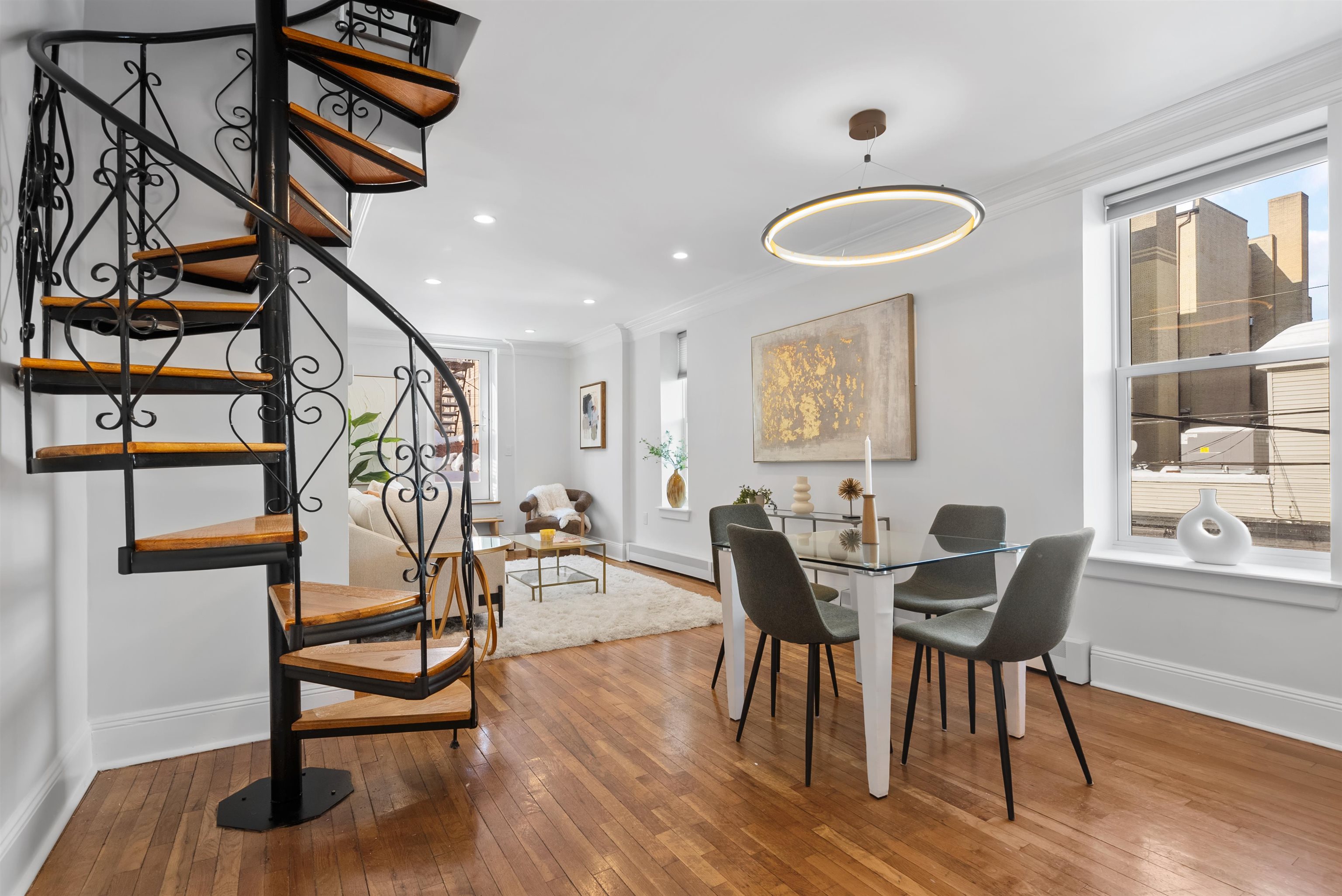 PRIVATE TWO CAR GARAGE+STORAGE INCLUDED IN SALE! ALSO 3RD PARKING SPOT OUTSIDE GARAGE! WD In UNIT! Welcome to 422 Grand St, Unit 3—a RARE 2-bedroom, 2-bath duplex in the heart of Hoboken, offering modern comfort and unique lifestyle features you won’t find elsewhere. This home INCLUDES A PRIVATE OVERSIZED TWO CAR garage with soaring 20-foot ceilings, complete with filtered water hookups—perfect for storage, hobbies, or keeping your vehicles secure year-round. Inside, the first floor is designed for entertaining with a spacious open layout. The kitchen flows seamlessly into the dining and living areas, and extends to a massive private deck. This outdoor oasis is equipped with solar string lights, an automatic plant watering system, and a striking concrete wall ideal for your own outdoor movie projector setup. Upstairs, you’ll find two generously sized bedrooms and a full bathroom, creating the perfect separation of living and sleeping spaces. Added convenience includes an in-unit washer/dryer and thoughtful updates throughout. With its combination of private garage parking, indoor-outdoor living, and modern amenities, this home offers a one-of-a-kind opportunity to enjoy Hoboken living at its best.