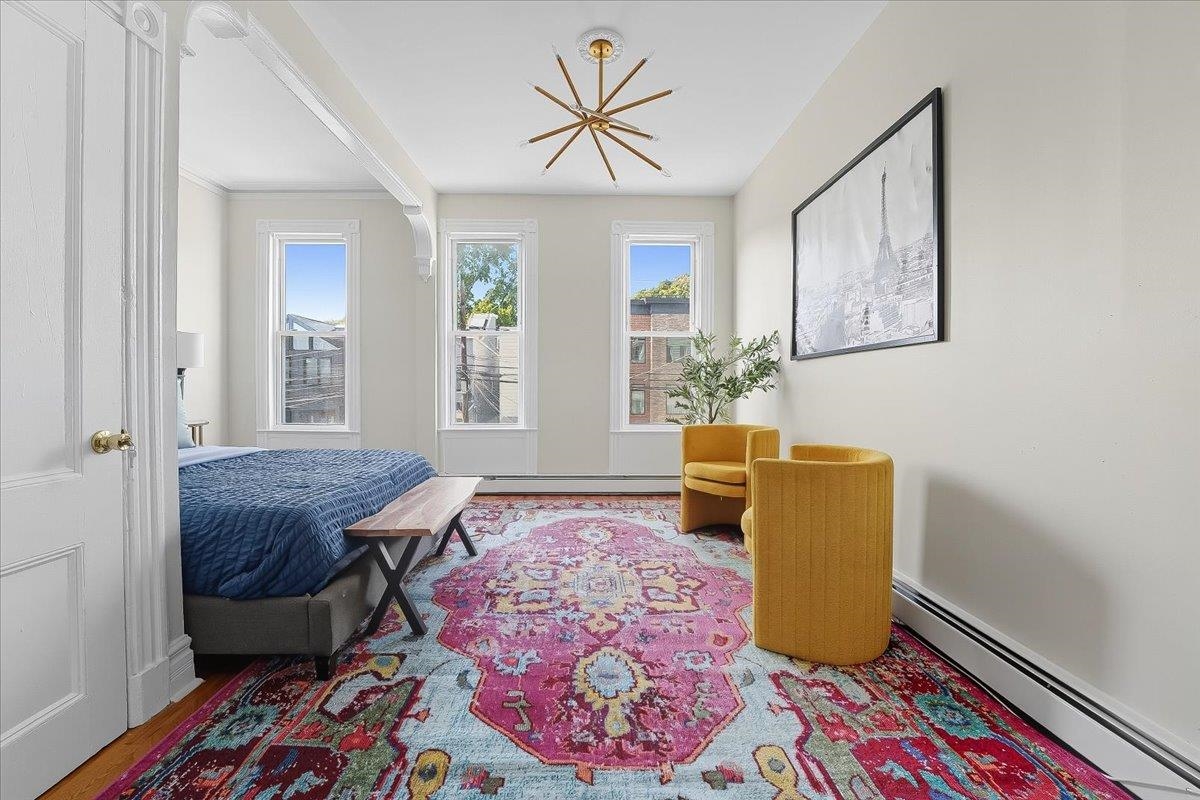 Bathed in light and brimming with character, this beautifully renovated one bedroom home offers a rare blend of timeless design and modern livability. Perched on a tree-lined street in The Heights just steps from Summit and Central Avenues, each residence feels like a hidden gem—where classic charm meets contemporary comfort. Step inside to sun-splashed interiors with floor-to-ceiling windows and peek-through openings illuminating classic hardwood floors throughout. The kitchen is finished with natural wood cabinetry, granite counters and a full stainless appliance suite. Boasting elevated touches like pressed tin ceiling tiles and ornate medallions, this unit also includes beautiful built-in living room storage cabinets for extra charm and convenience. The primary bedroom hosts a graceful archway, crown molding trey ceilings, plus glowing wall sconces for an atmosphere of refined coziness. Generous windows flood the room with light, while the walk-in closet adds enviable storage. The bathroom features a soaking tub and shower combo, medicine cabinet storage, and tile that stretches to the ceiling. Positioned less than a block from Summit Avenue and moments to Washington Park and the 9th Street Light Rail elevator, these homes are perfect for those seeking character, comfort, and connectivity. Jersey City Heights is known for its artistic community, charming boutique shops and restaurants, excellent parks and schools, and easy accessibility to NYC and surrounding neighborhoods.